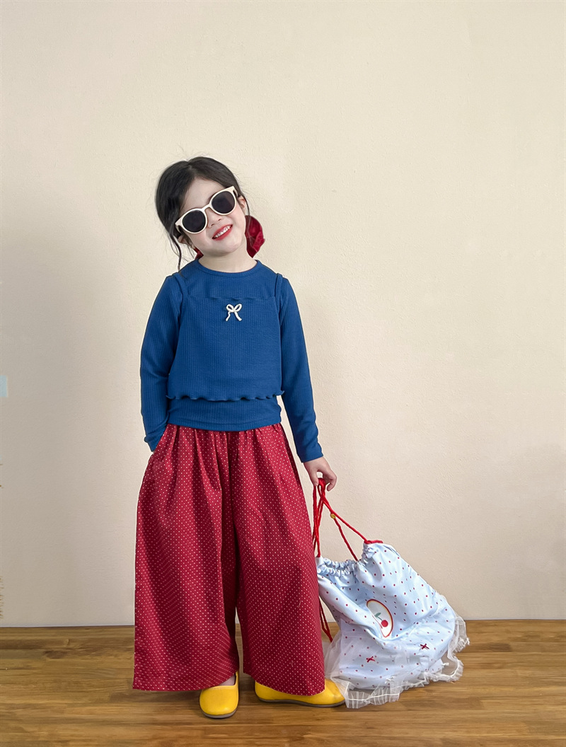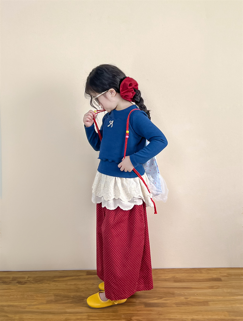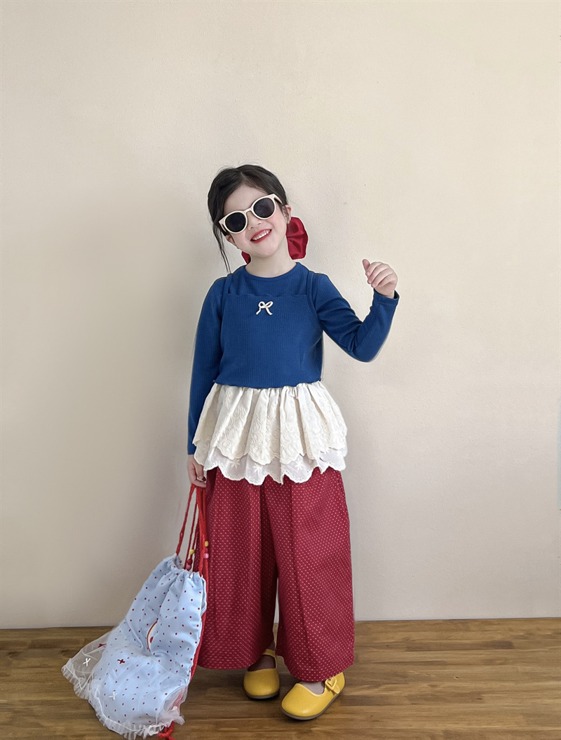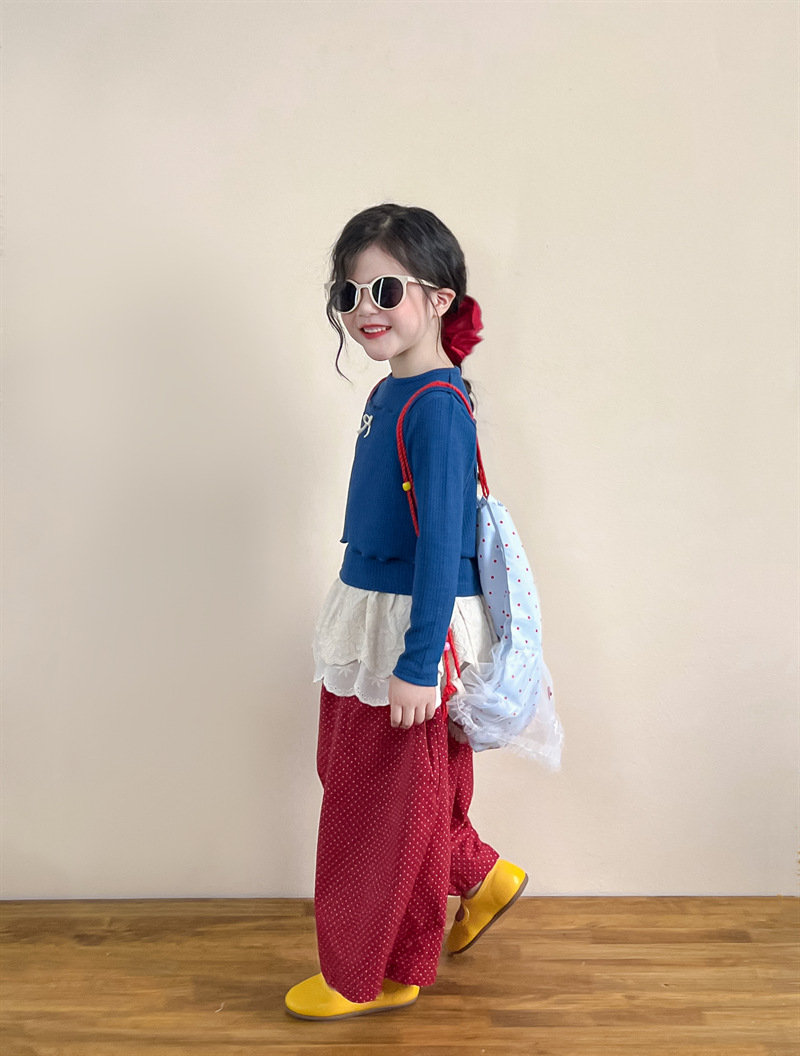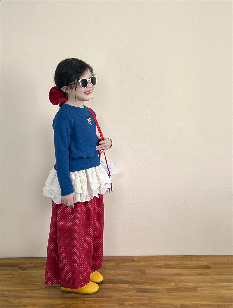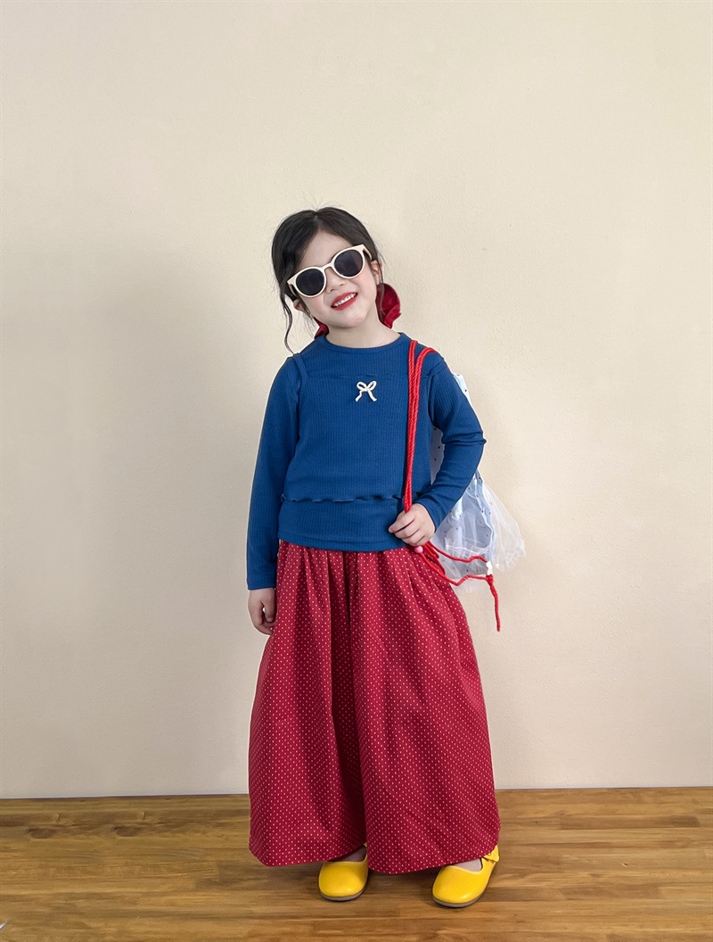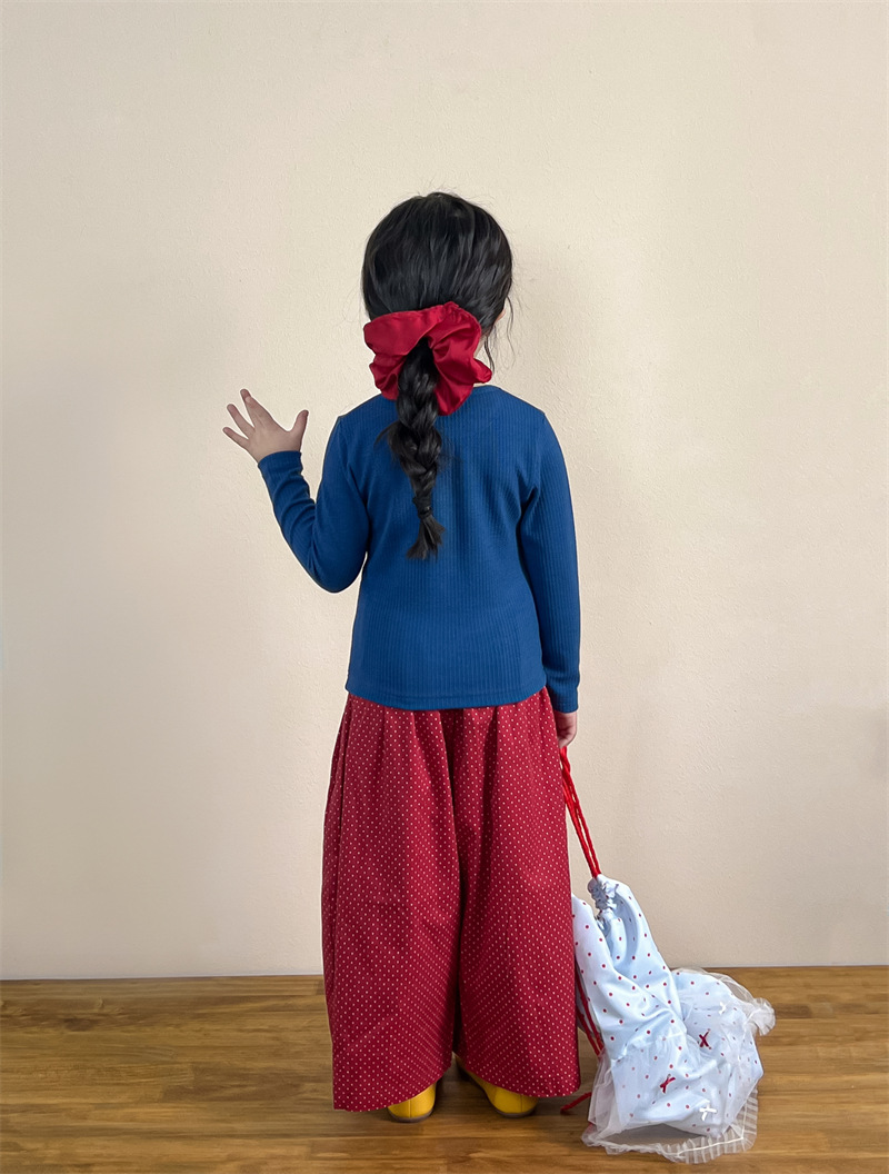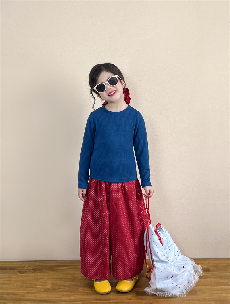 한국 소녀의 봄과 가을 블루 자수 활 스트랩 커버 아트 커튼 레드 웨이브 닷 넓은 다리 바지 세트 별도의 팻