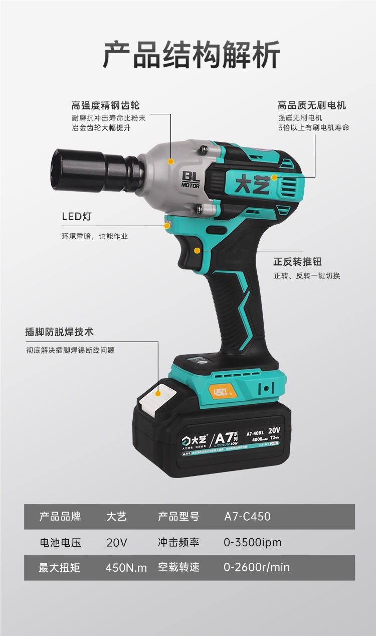 Dayi 전기 렌치 새로운 450N 브러시리스 충전식 리튬 배터리 충격 렌치 A7C450 발판 자동 수리 공기총