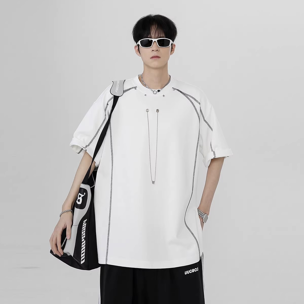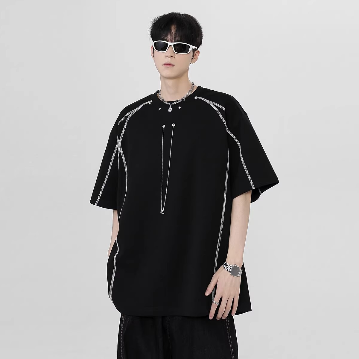 지밍 라인 헤비 반팔 티셔츠 남성 여름 디자인 센스 목걸이 느슨한 옷 패션 브랜드 아메리칸 스타일 하이 스트리트 반팔 티셔츠
