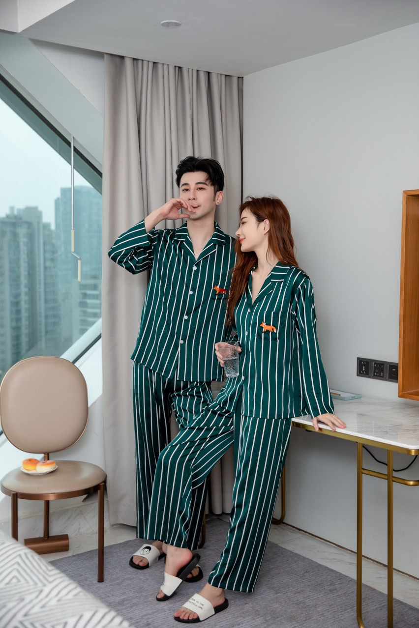 여성용 커플 잠옷, 봄, 가을 신제품, 여성용 모조 실크, 남성용 실크 긴팔 줄무늬 얼음 실크 가정복, 야외에서 착용 가능스토어 가기