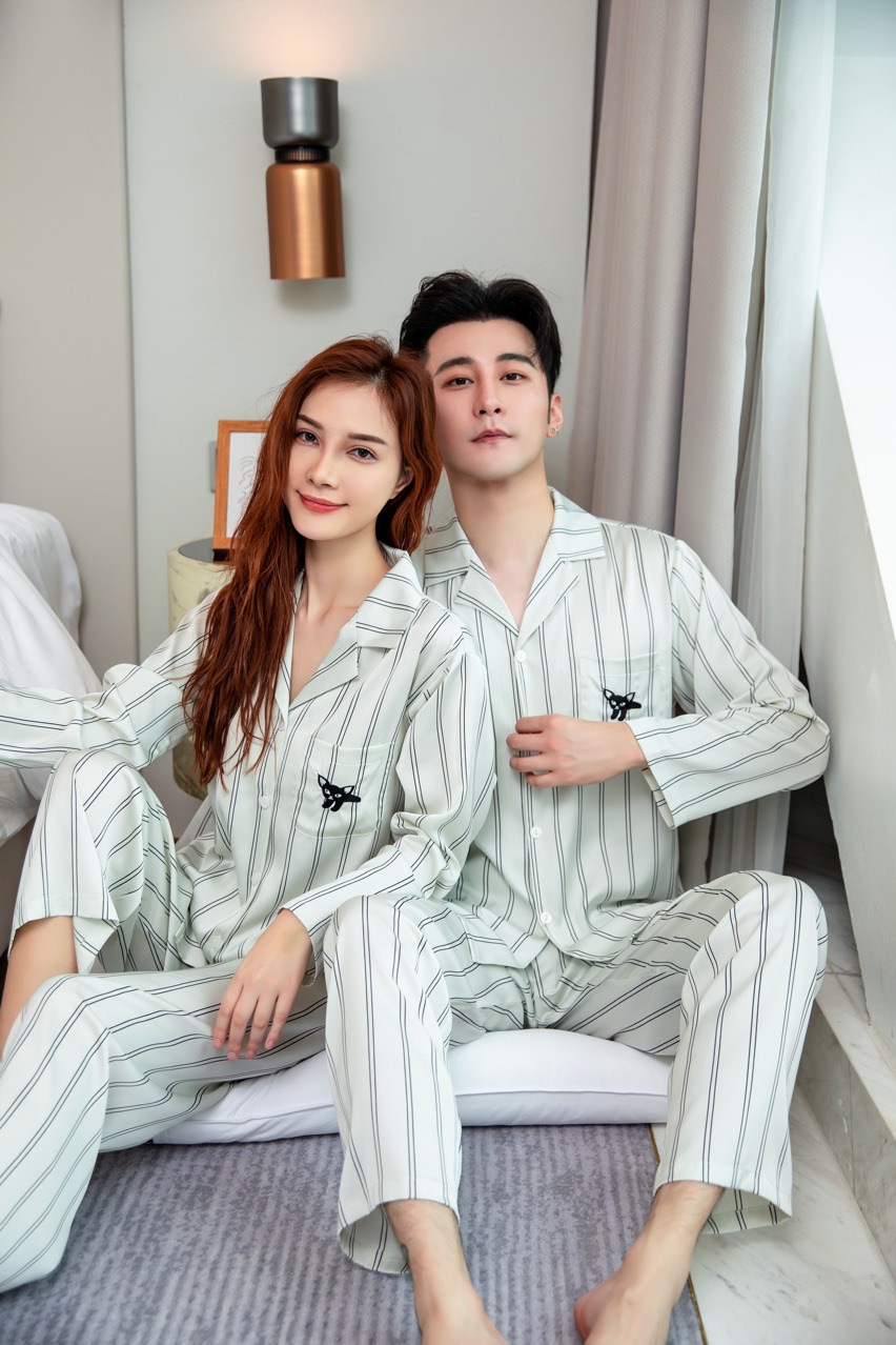 여성용 커플 잠옷, 봄, 가을 신제품, 여성용 모조 실크, 남성용 실크 긴팔 줄무늬 얼음 실크 가정복, 야외에서 착용 가능