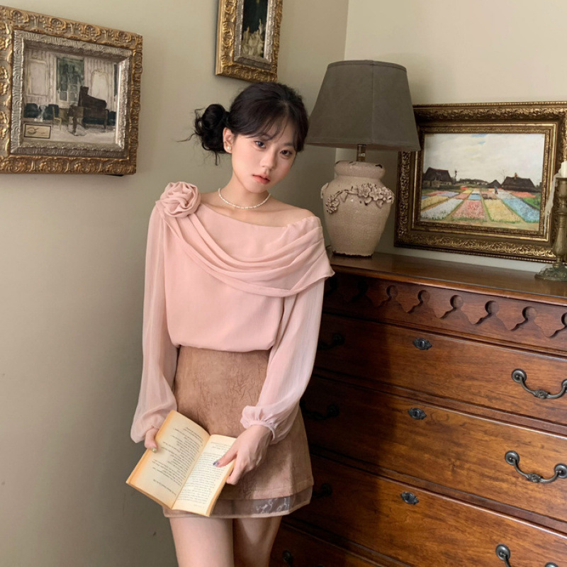 Shanli Dadi 프랑스 스타일 경사 어깨 로즈 쉬폰 셔츠 초가을 빈티지 폴로 도트 탑