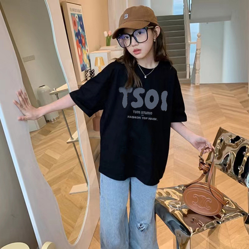도매 수출용 순면 여아용 레터링 티셔츠 여름옷 아동용 루즈핏 반팔 상의 여아용 땀 흡수 통기성 좋은스토어 가기