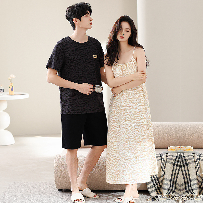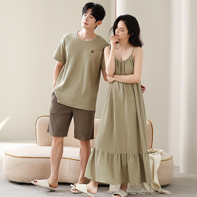 커플 잠옷 여름 와플 순수 코튼 여성 서스펜더 잠옷 남성 패션 반팔 반바지 홈웨어 세트