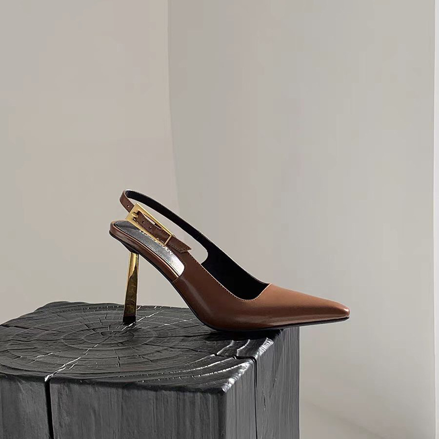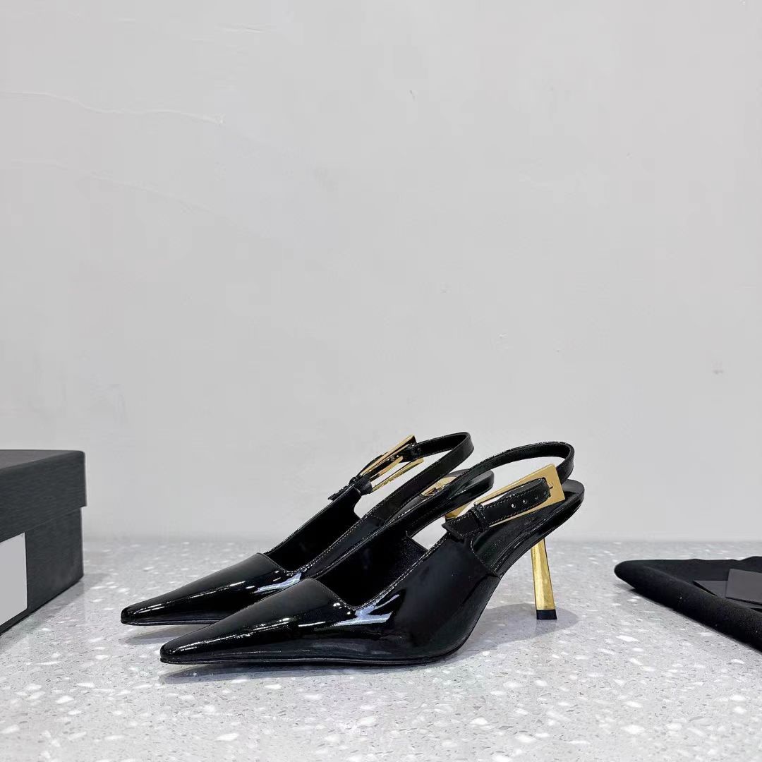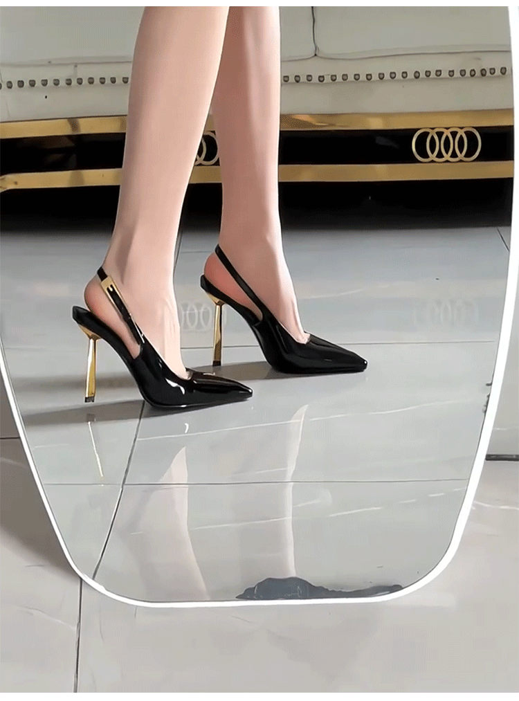 작은 골드바 스틸레토힐, 블랙 포인티드 토 하이힐, 페이턴트 가죽 메탈 토 샌들, 섹시한 여왕님 여성화
