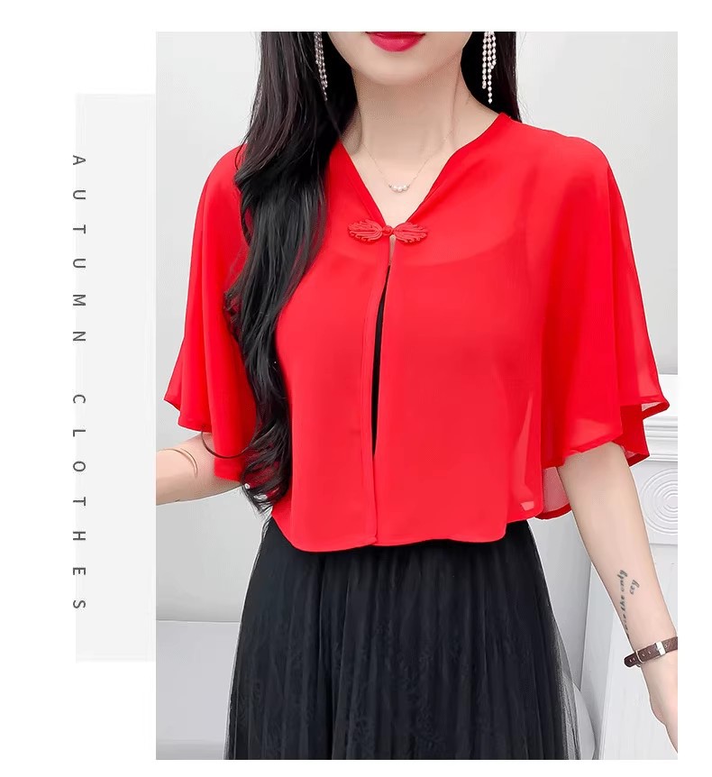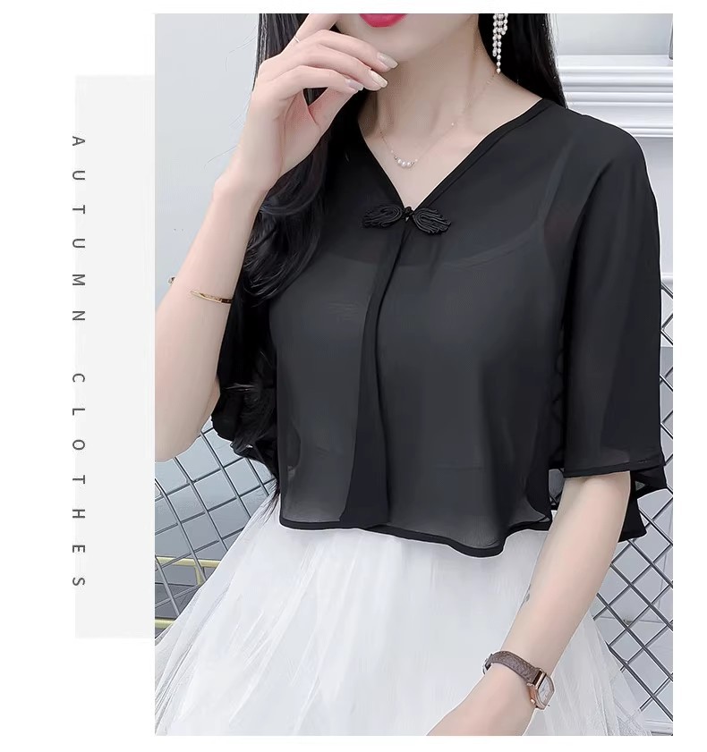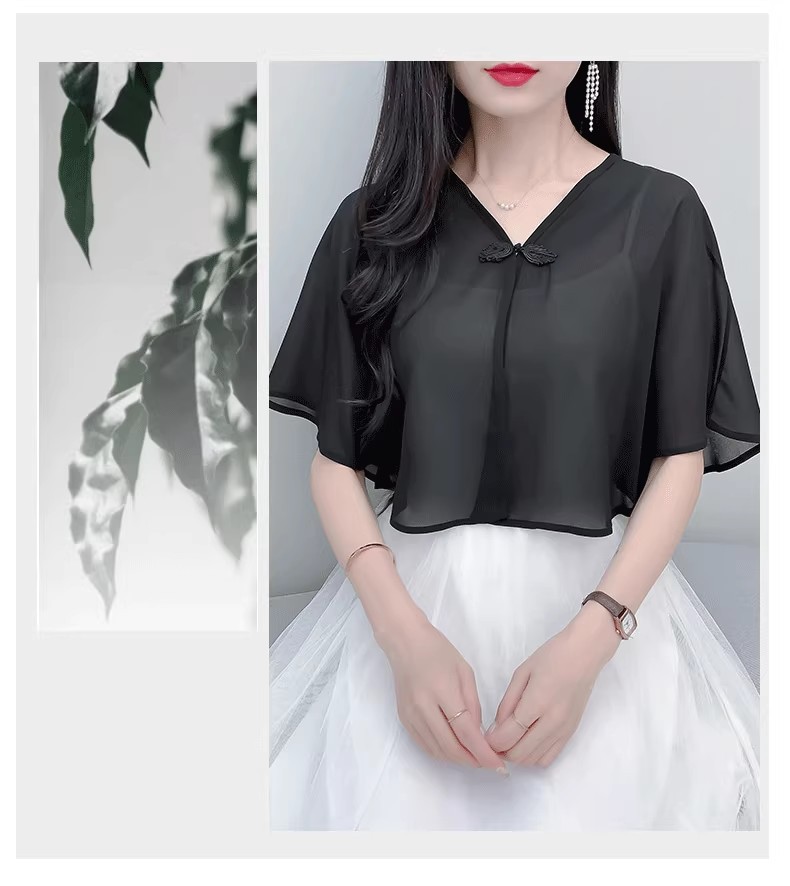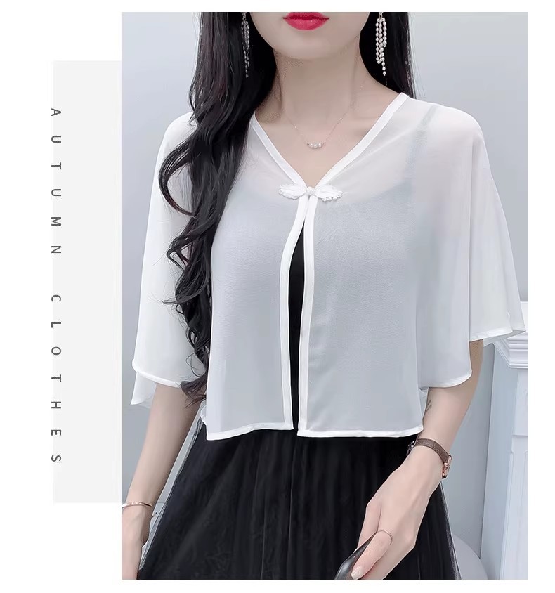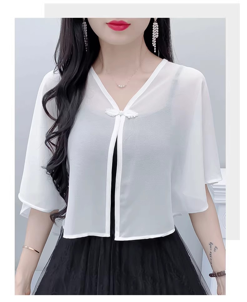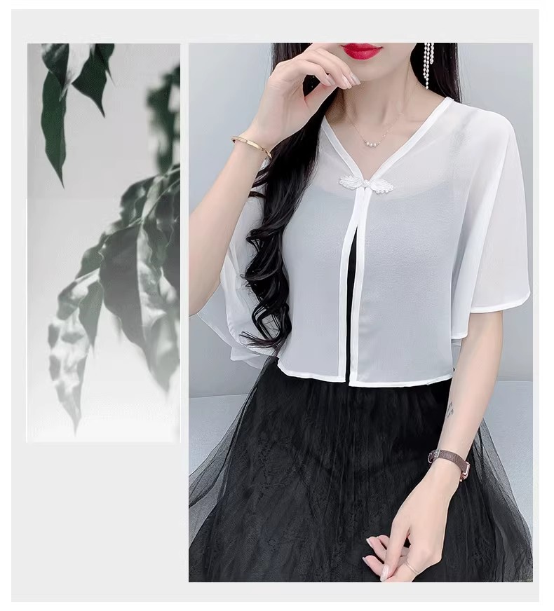 여성을위한 쉬폰 짧은 숄 2025 여름 얇은 코트 자외선 차단 의류 카디건 치파오 스커트와 함께 착용