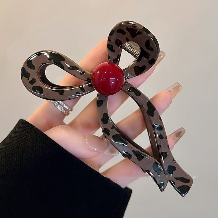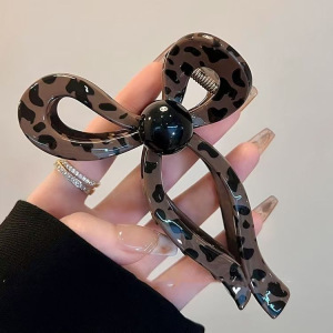 새로운 빈티지 레오파드 무늬 활 하이 엔드 클립 진주 다크 브라운 클립 여성 대형 상어 클립 머리핀 도매
