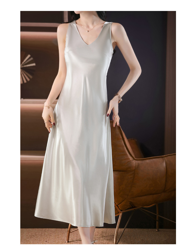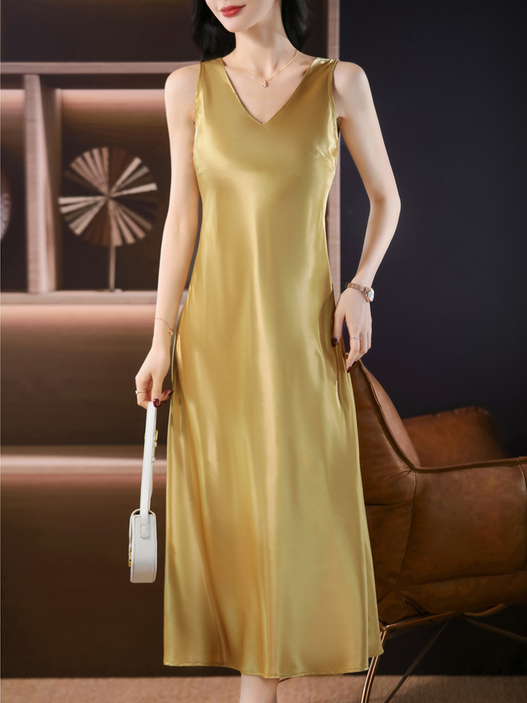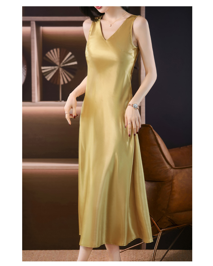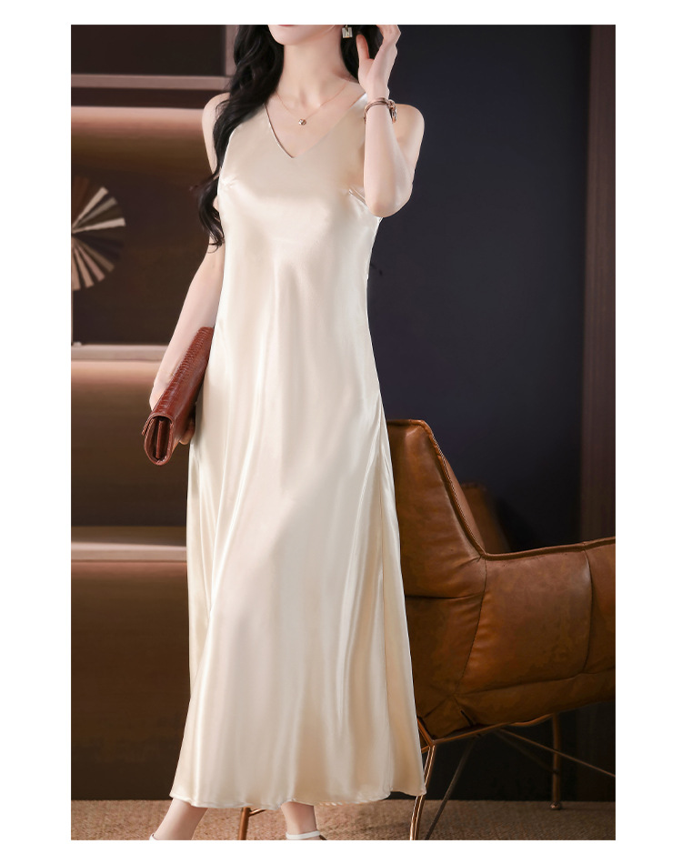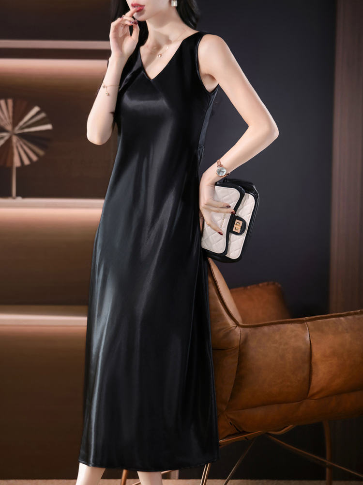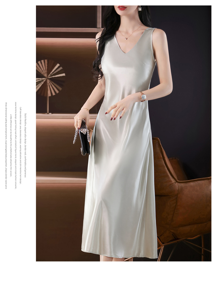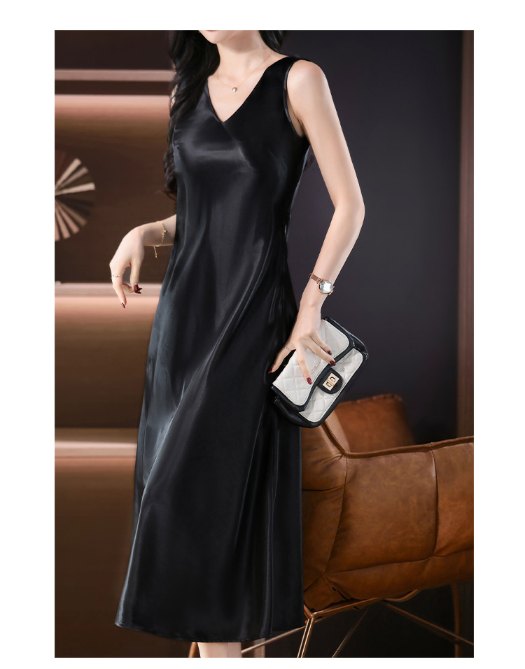 봄 2025 새로운 새틴 단순 원피스 슬림 긴 슬림 핏 올 매치 스키니 원피스