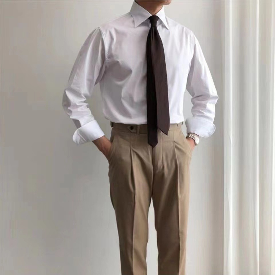 품질 새로운 도착 올매치 새로운 도착 포인팅 칼라 곡선 남자 긴 소매 셔츠 사계절 주름 저항하는 편안한 올 매치 다크 브라운