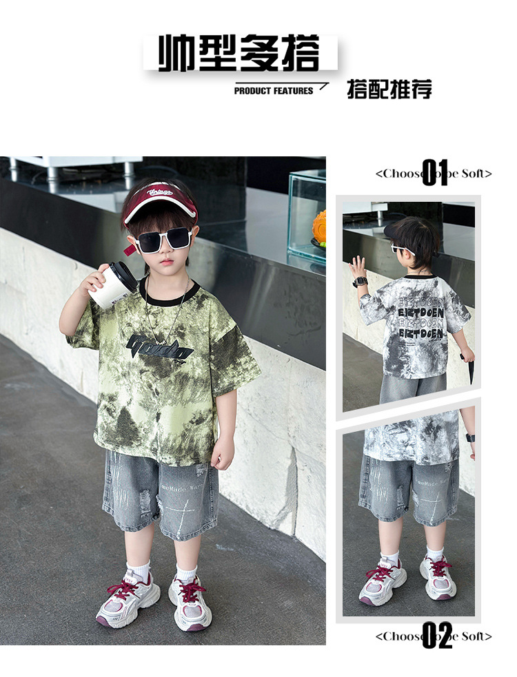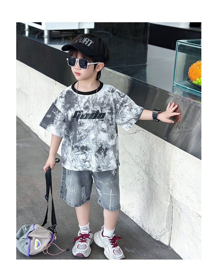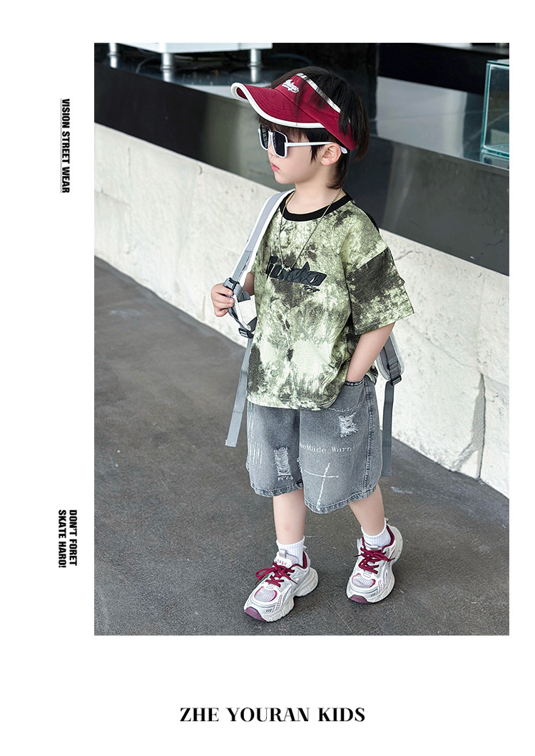 소년 청바지 타이 염색 반팔 양복 여름 소년 옷 새로운 스타일의 잘 생긴 소년 멋지고 세련된 인터넷 연예인 거리에서 뜨겁습니다.스토어 가기