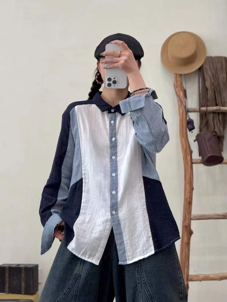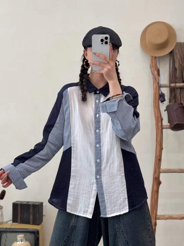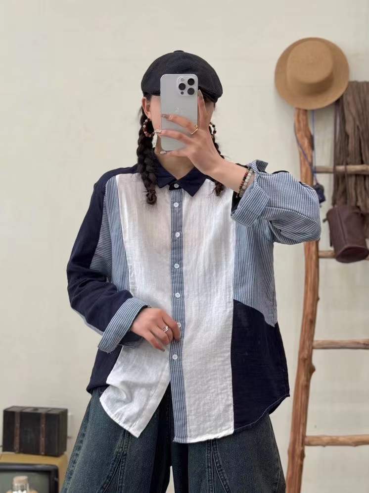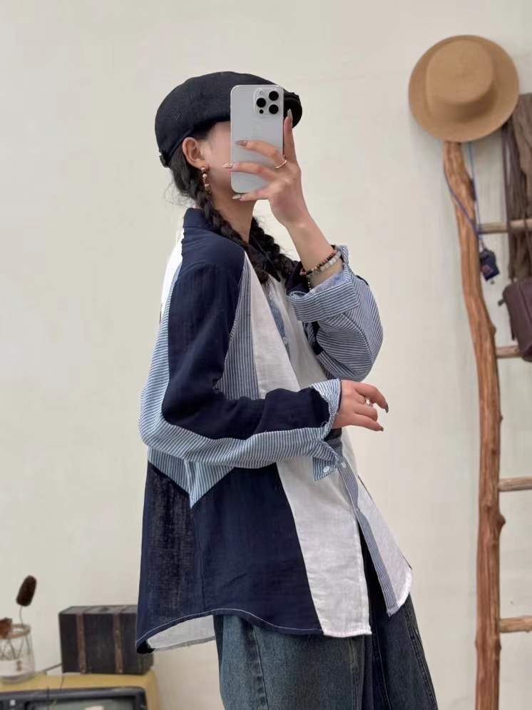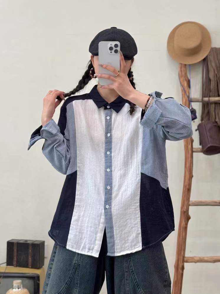 일본 모리 소녀 스트라이프 스티칭 여성용 긴팔 셔츠 카디건 탑 도매 조수의 느슨한 대형 버전스토어 가기