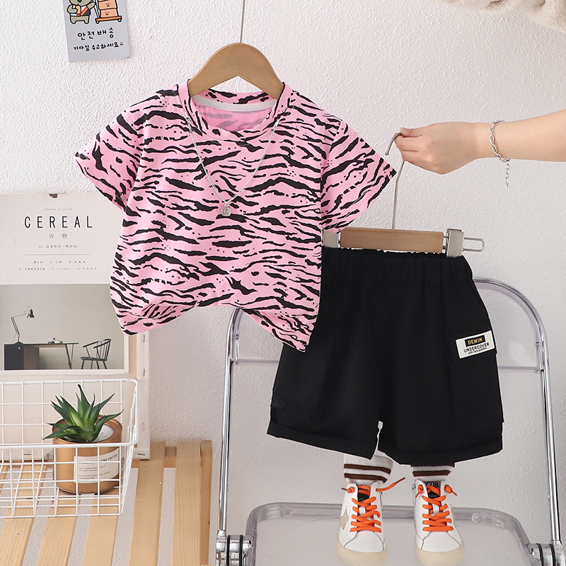 소년 여름 어린이 반팔 양복 새로운 스타일 아기 소녀 유행 반팔 유행 아기 패션 레오파드 프린트 투피스 세트스토어 가기