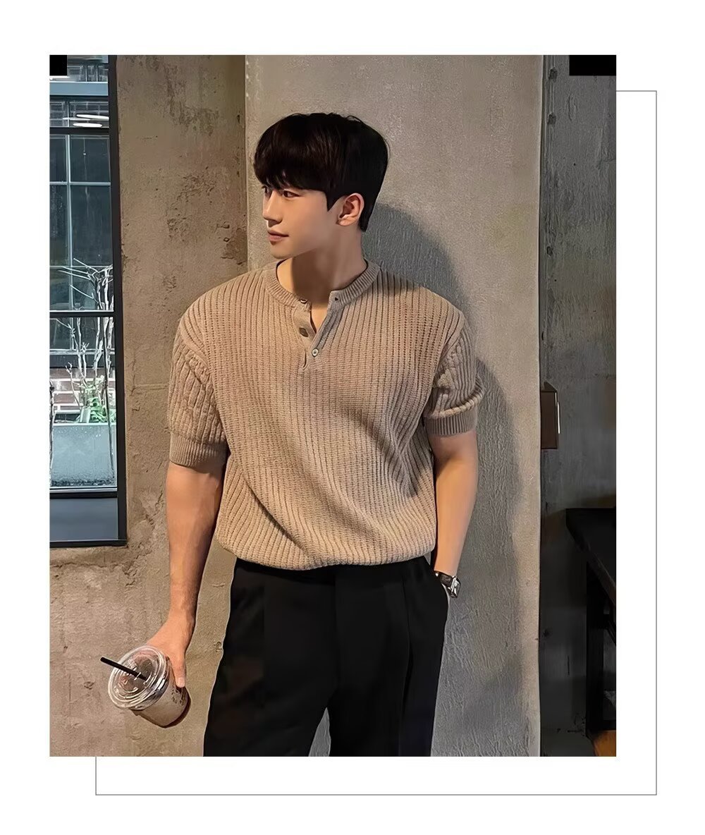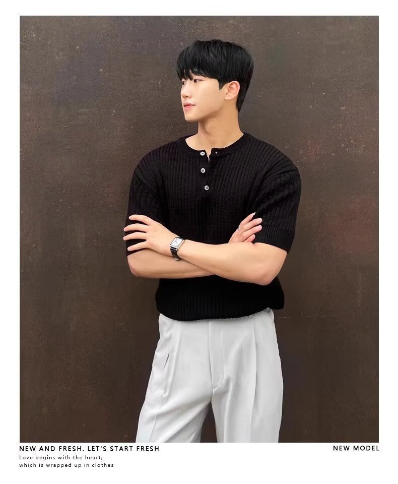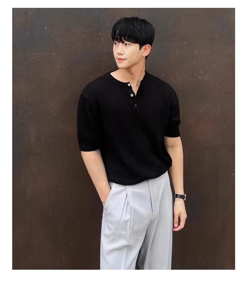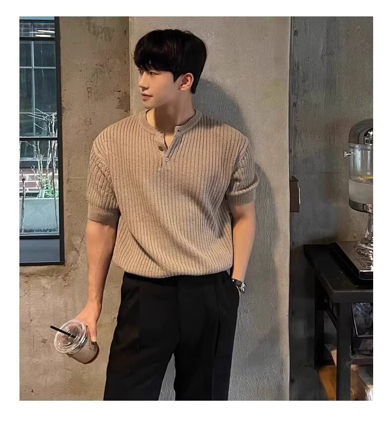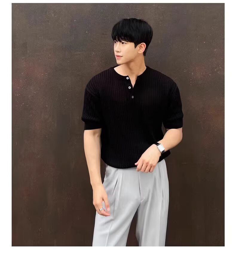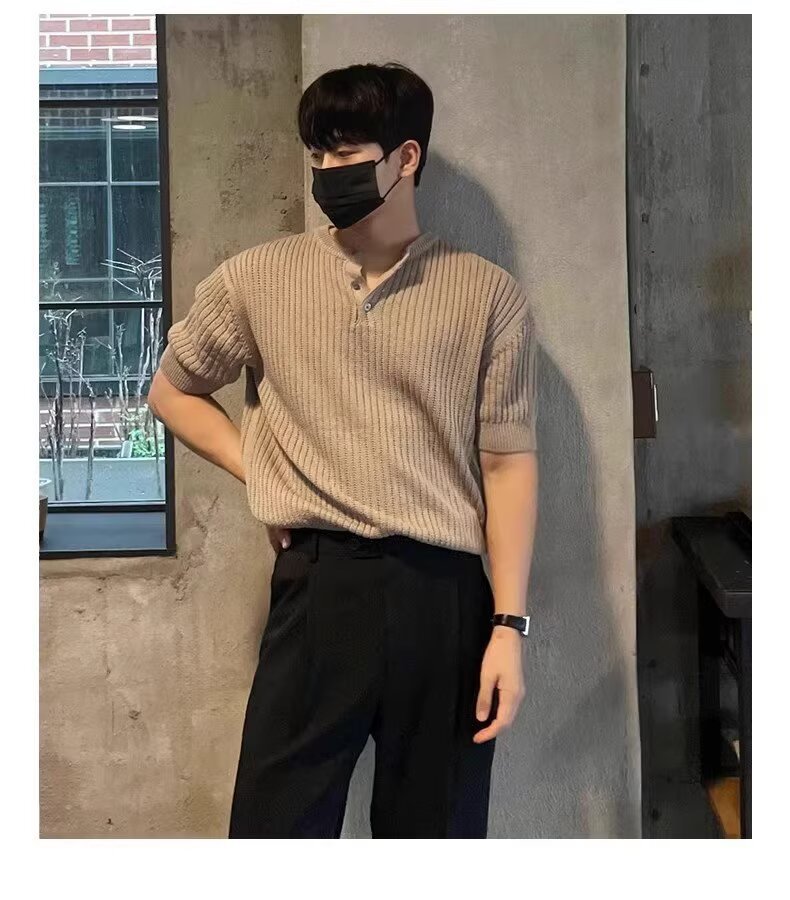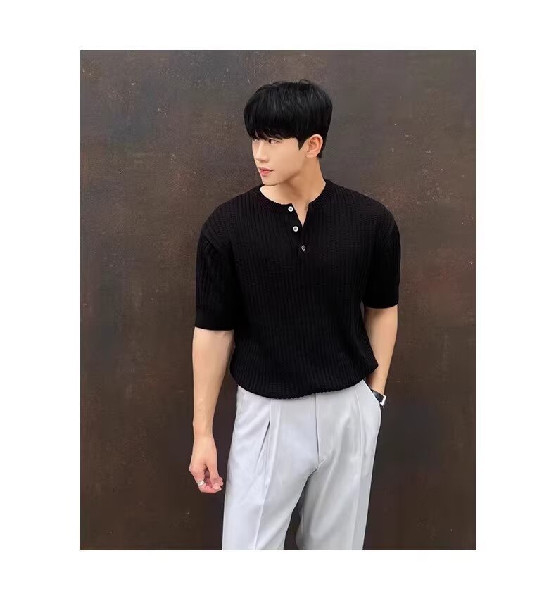 여름 트렌드 헨리 칼라 남성 반팔 스웨터 한국 스타일 루즈 캐주얼 세로 스트라이프 디자인 반팔 티셔츠