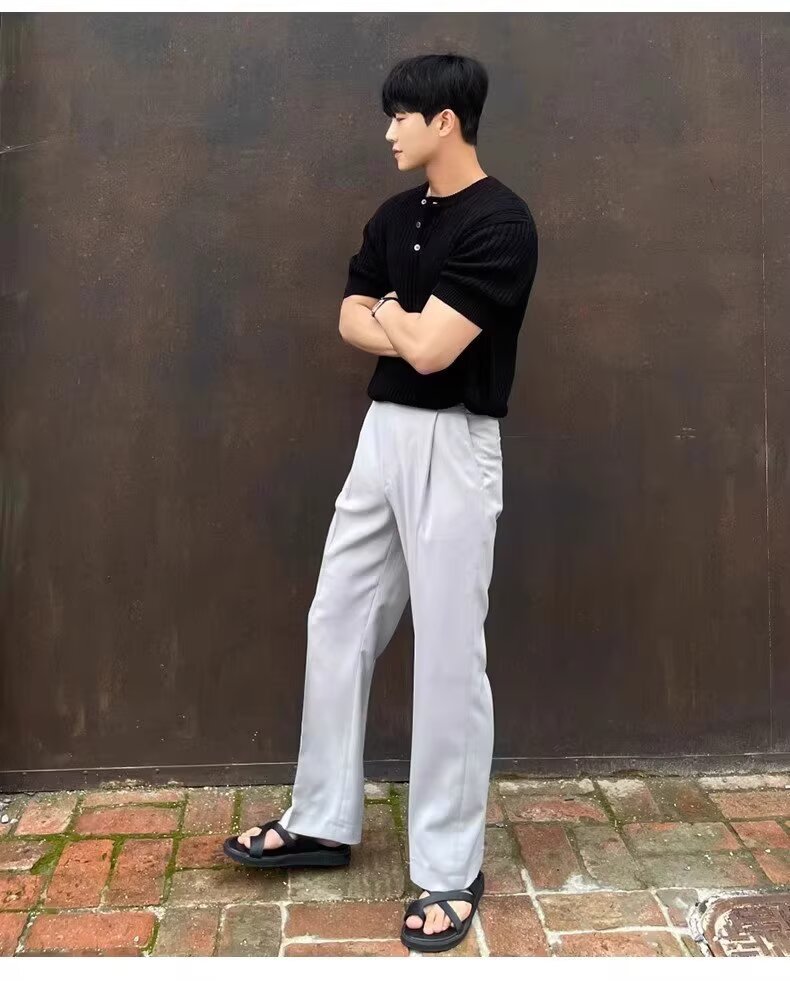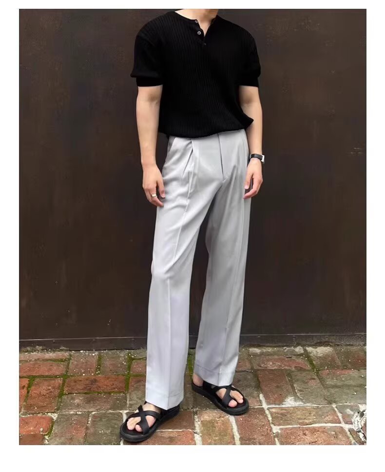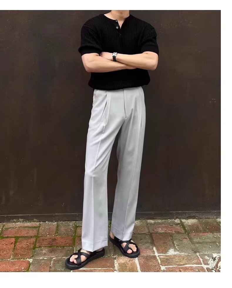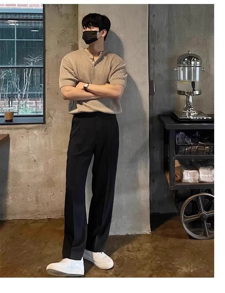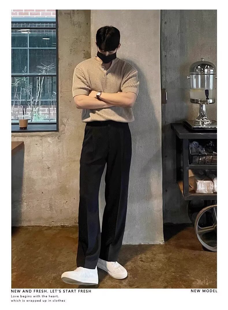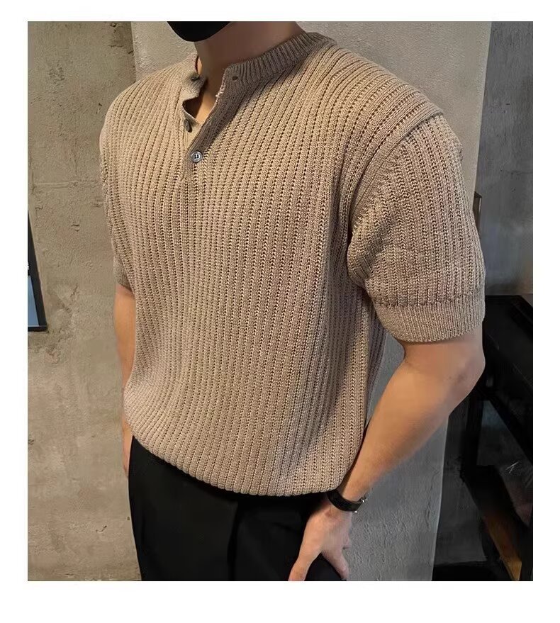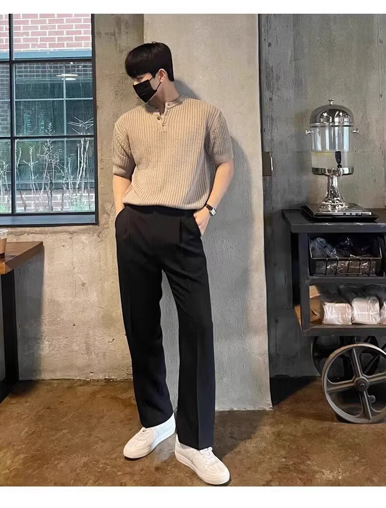 여름 트렌드 헨리 칼라 남성 반팔 스웨터 한국 스타일 루즈 캐주얼 세로 스트라이프 디자인 반팔 티셔츠