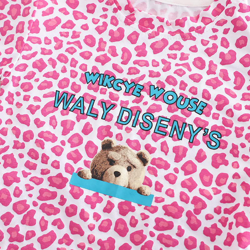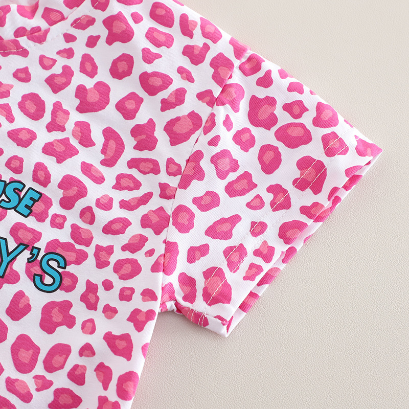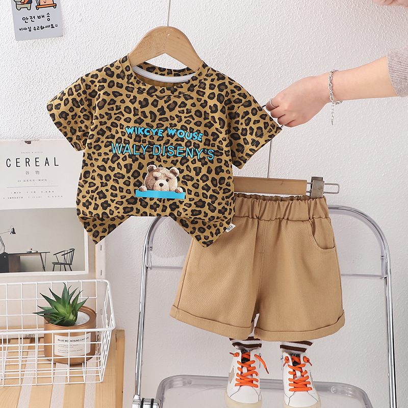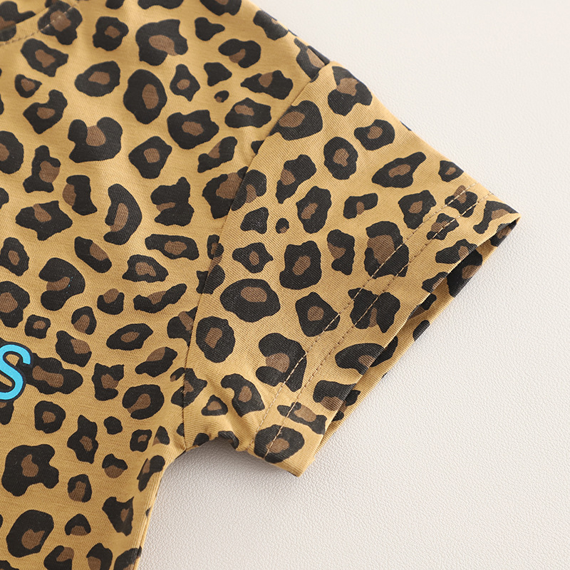 여자 여름 정장 2025 새로운 어린이 한국어 표범 인쇄 티셔츠 아기 소녀 유행 반팔 투피스 세트 도매