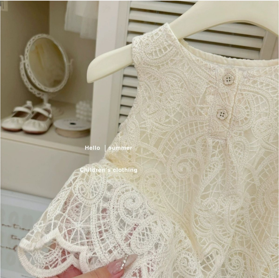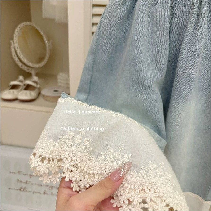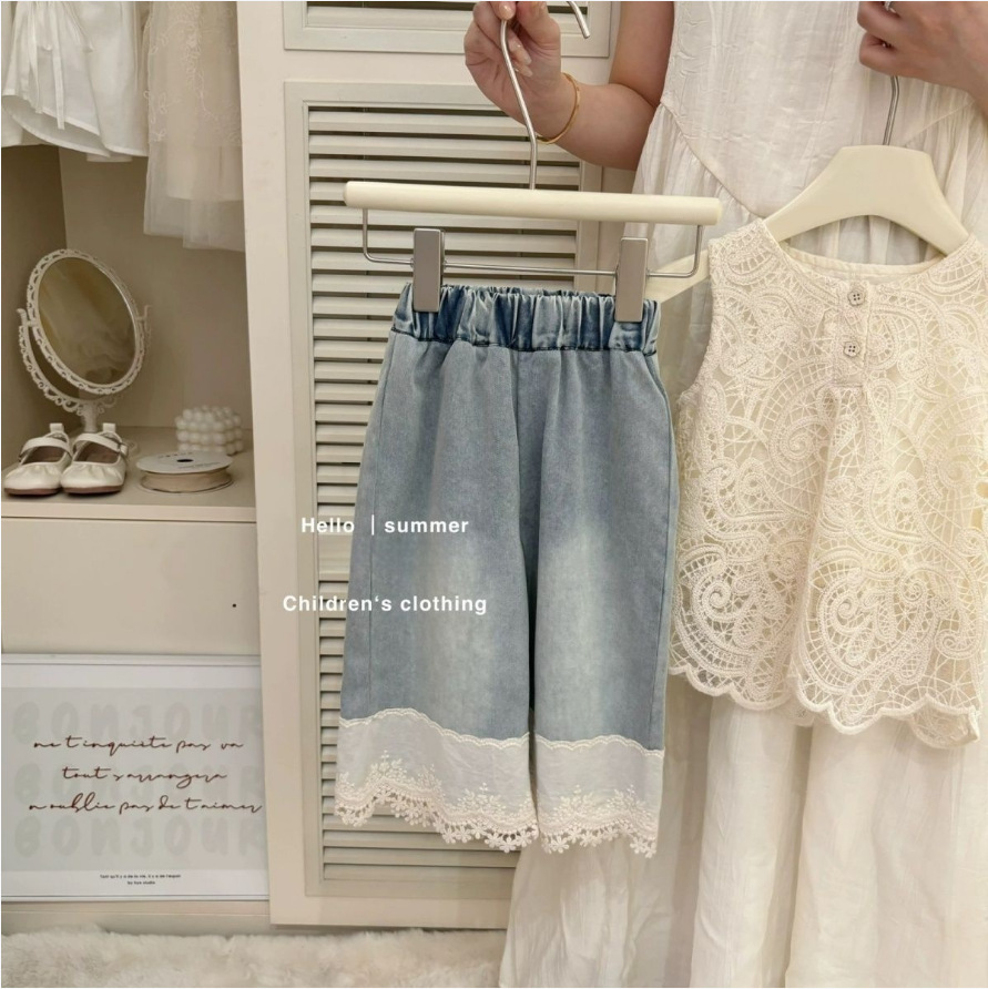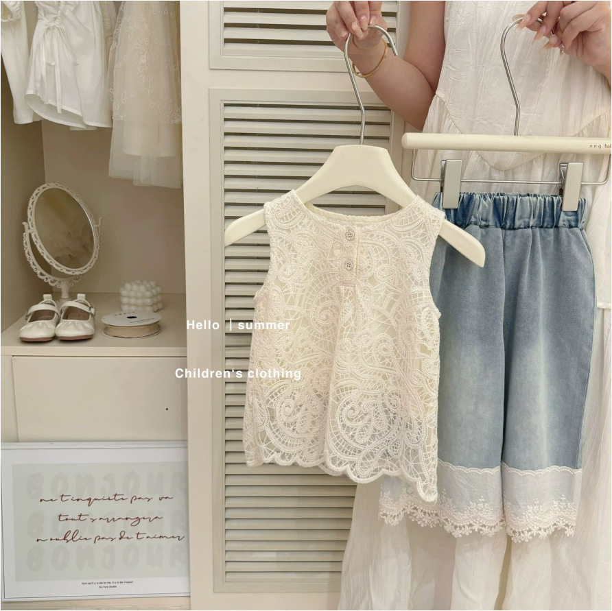 한국 스타일 소녀 2025 여름 새로운 스타일러스 귀여운 레이스 조끼 데님 넓은 다리 바지 투피스 세트 트렌디