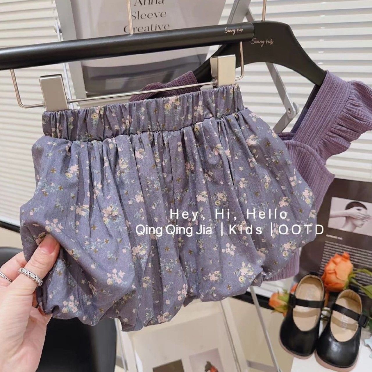 여자 조끼 세트 2025 새로운 스타일 플라잉 슬리브 탑 스트랩 짧은 꽃 굽은 바지 투피스 세트 꽃 한국 스타일