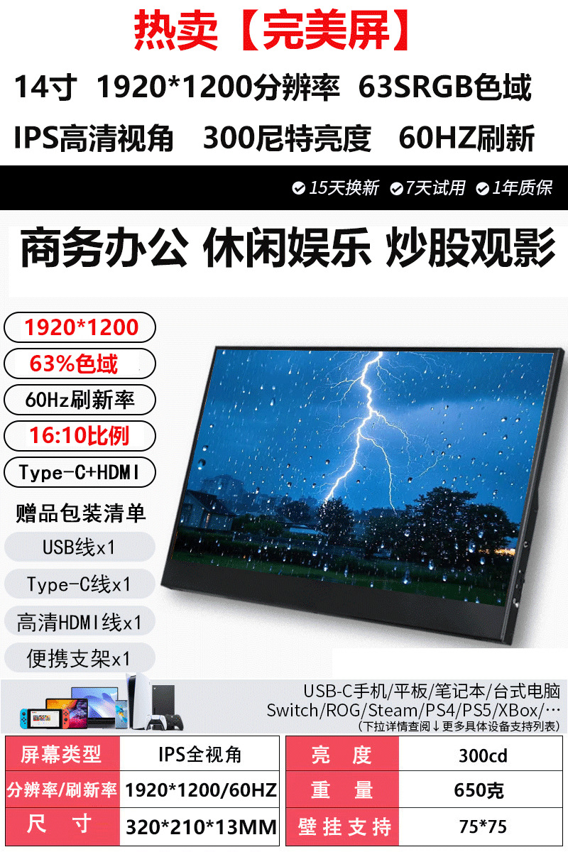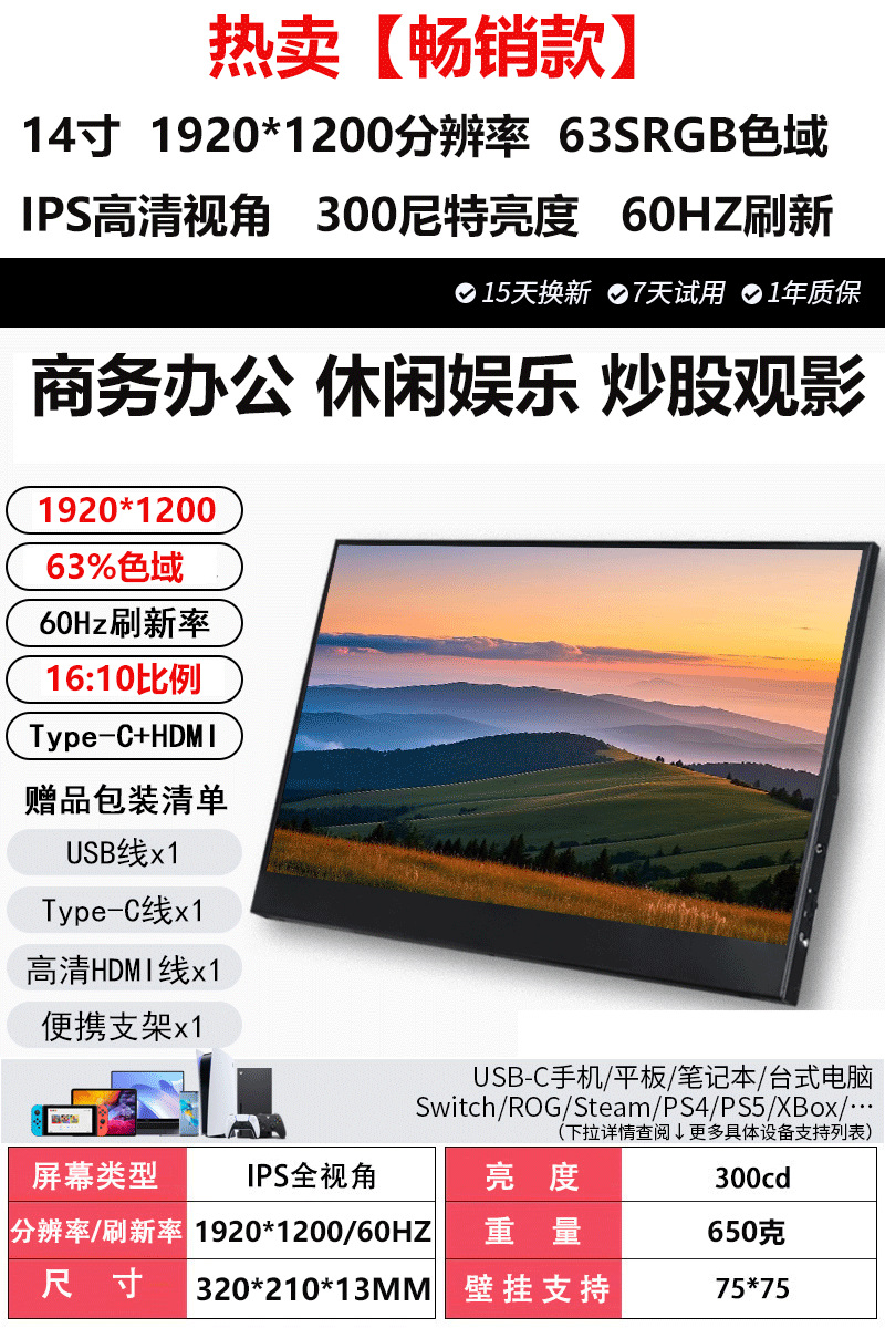 1920*1200 휴대용 디스플레이 PC 컴퓨터 스위치 게임 콘솔 14inch 새 화면에 직접 연결스토어 가기