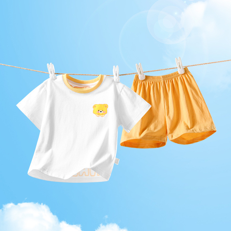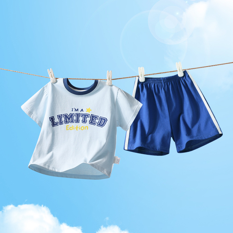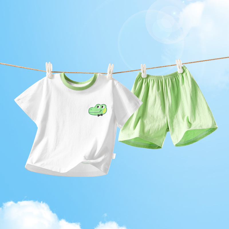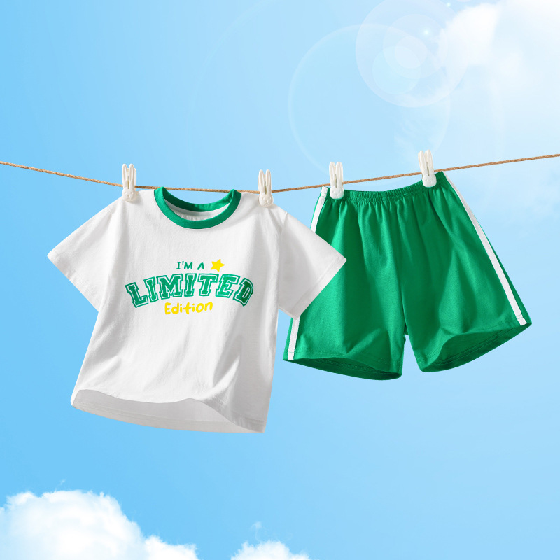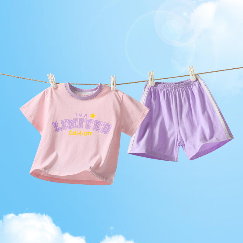 2322 여름 새로운 어린이 반팔 반바지 세트 코튼 얇은 스타일 소년 소녀 아기 티셔츠 바지 두 조각