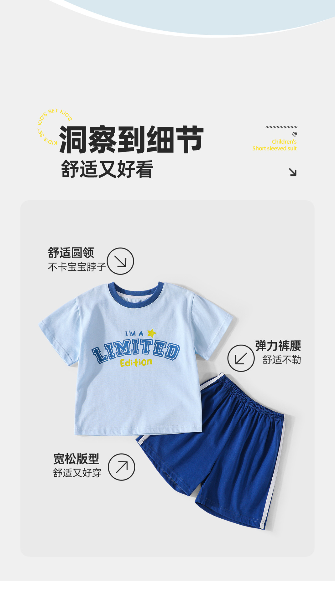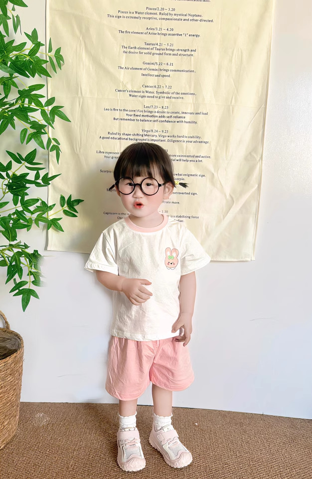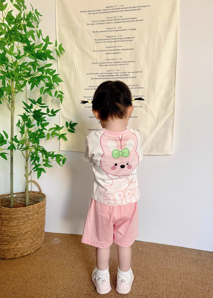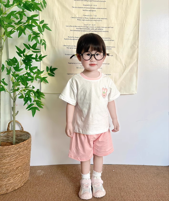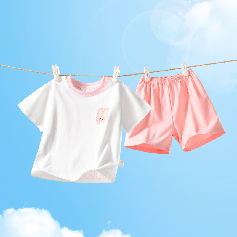 2322 여름 새로운 어린이 반팔 반바지 세트 코튼 얇은 스타일 소년 소녀 아기 티셔츠 바지 두 조각