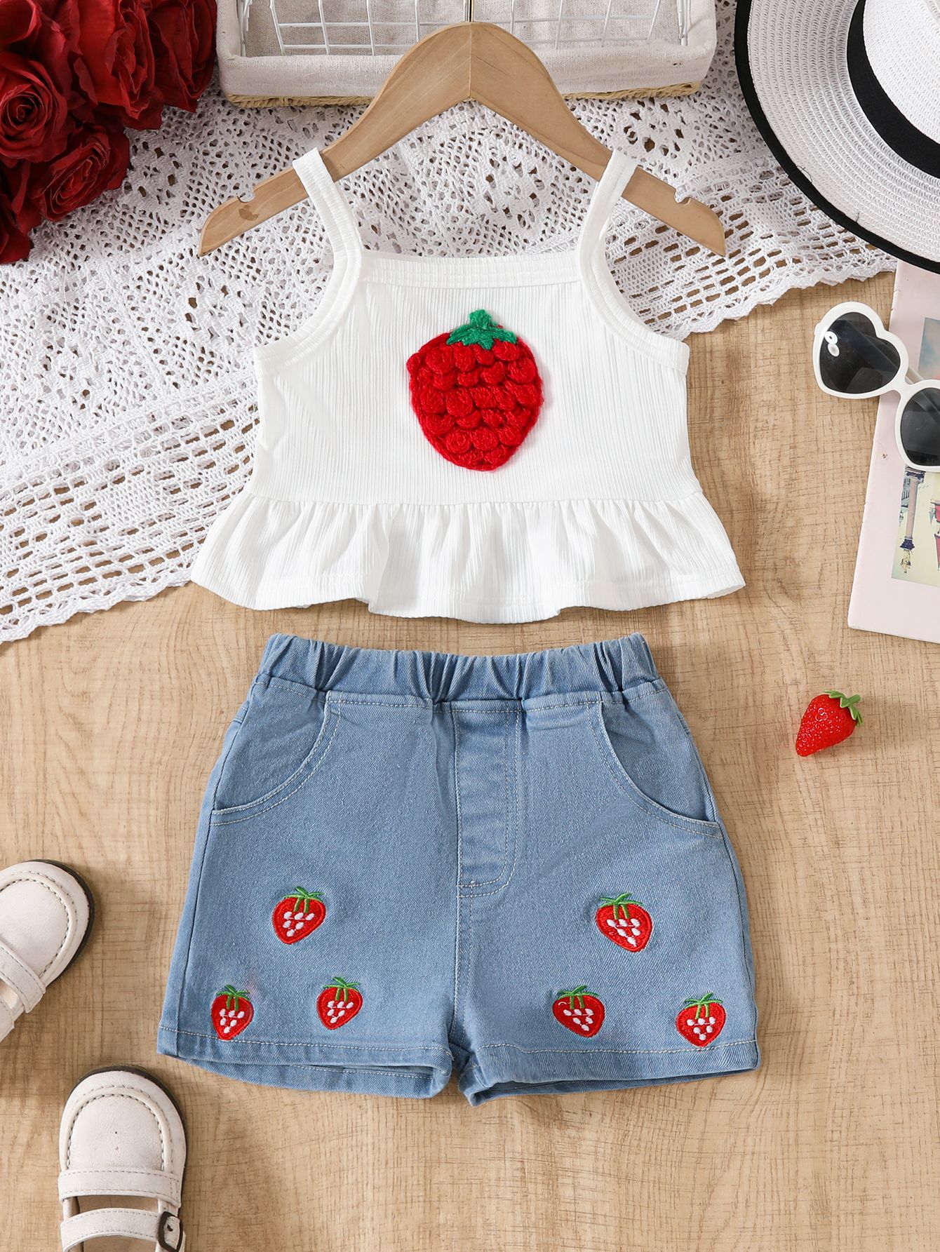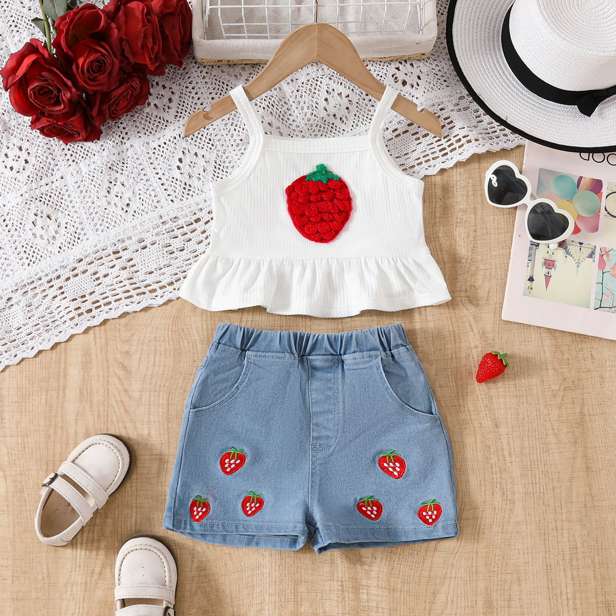 아마존 국경 간 아동복 소녀 스트랩 딸기 3 차원 꽃 탑 데님 자수 반바지 2025 여름 새로운