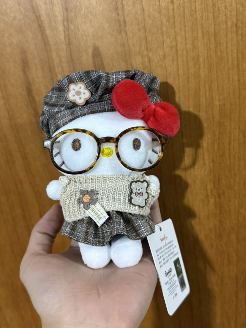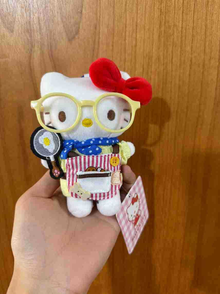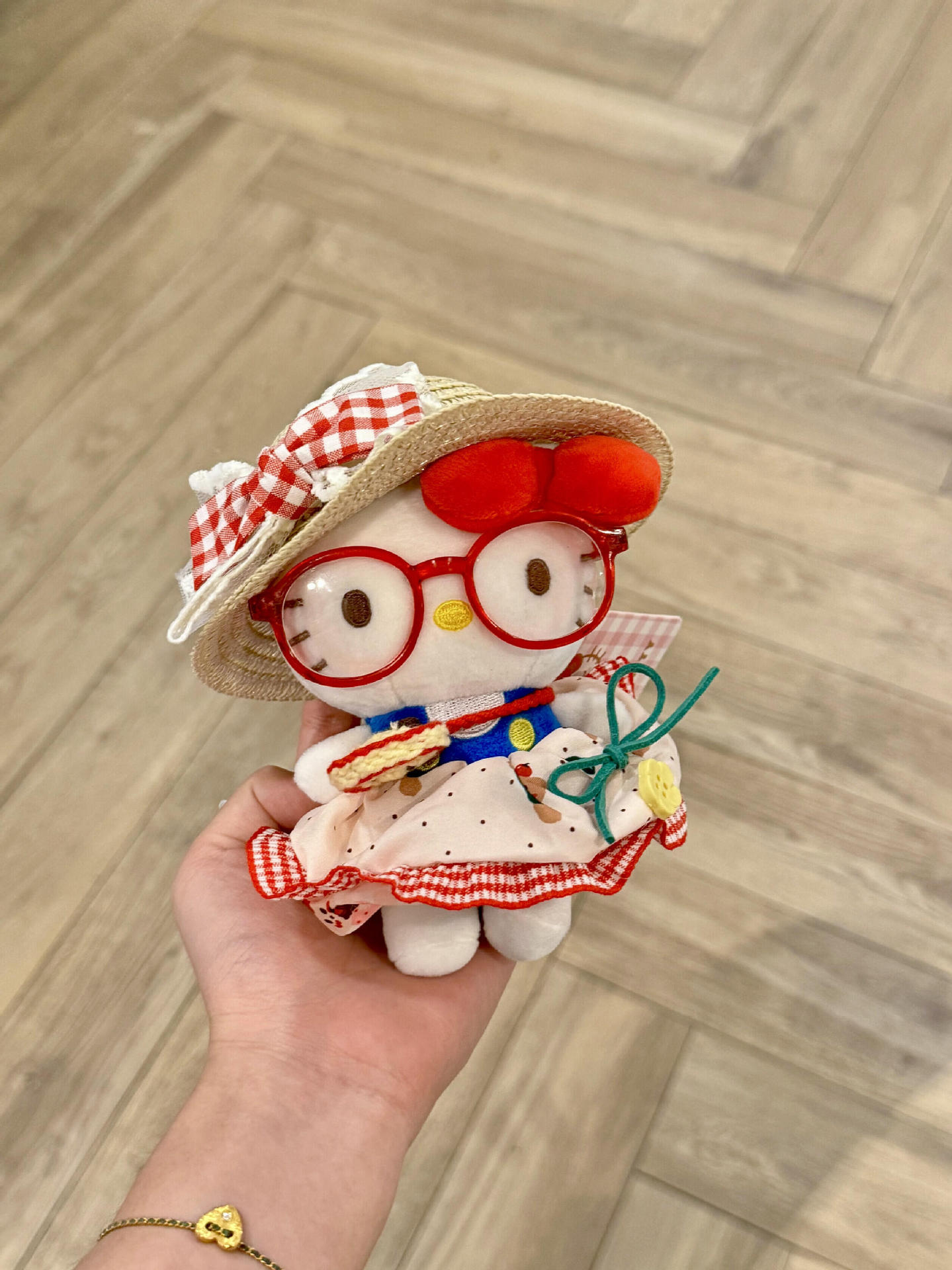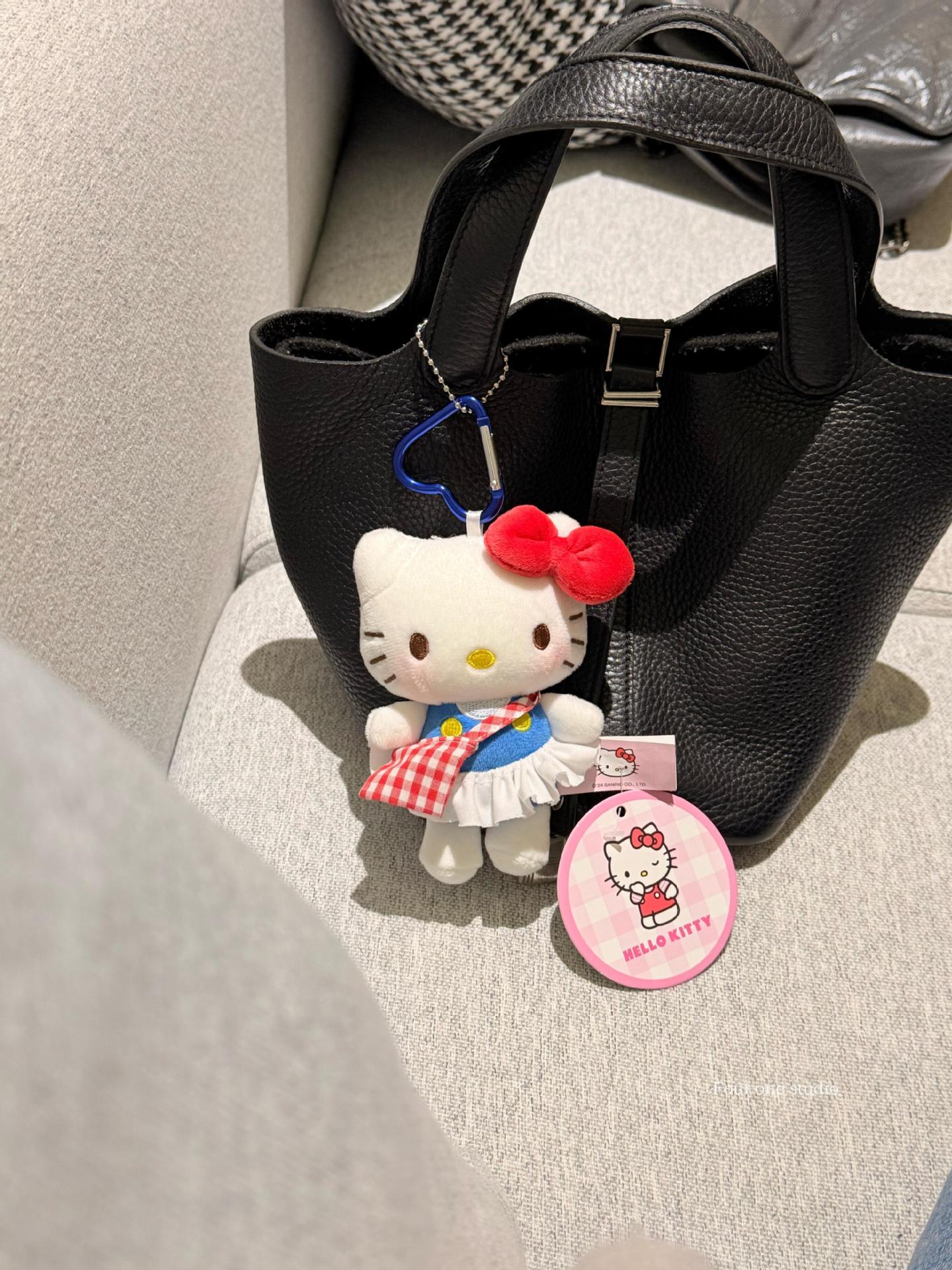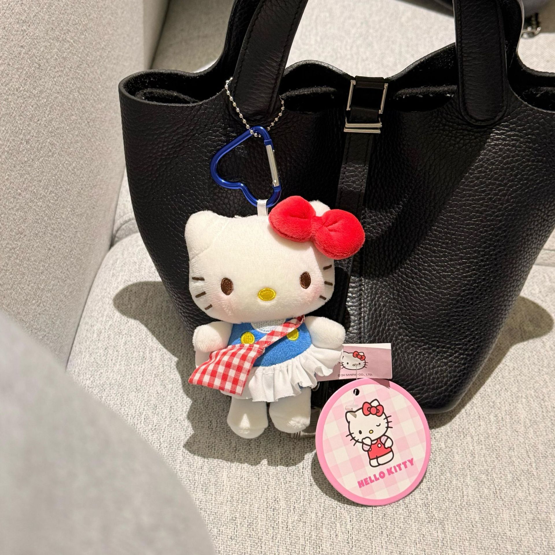 • 흰색 스커트와 빨간 체크무늬 가방을 들고 있는 키티
