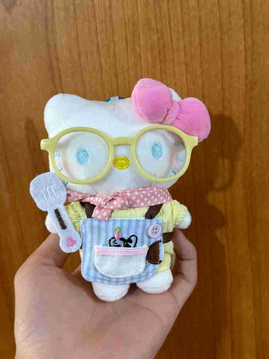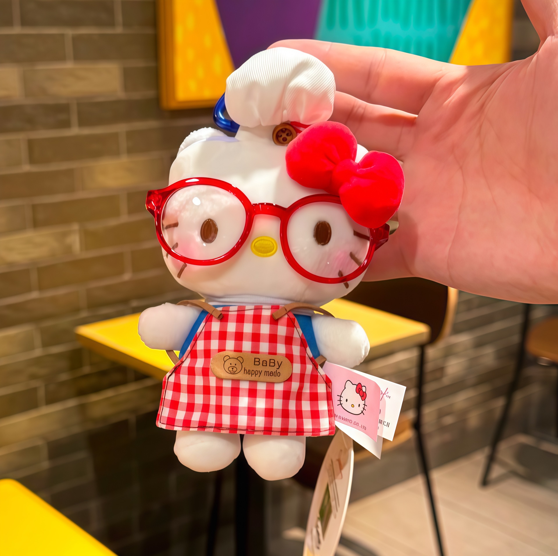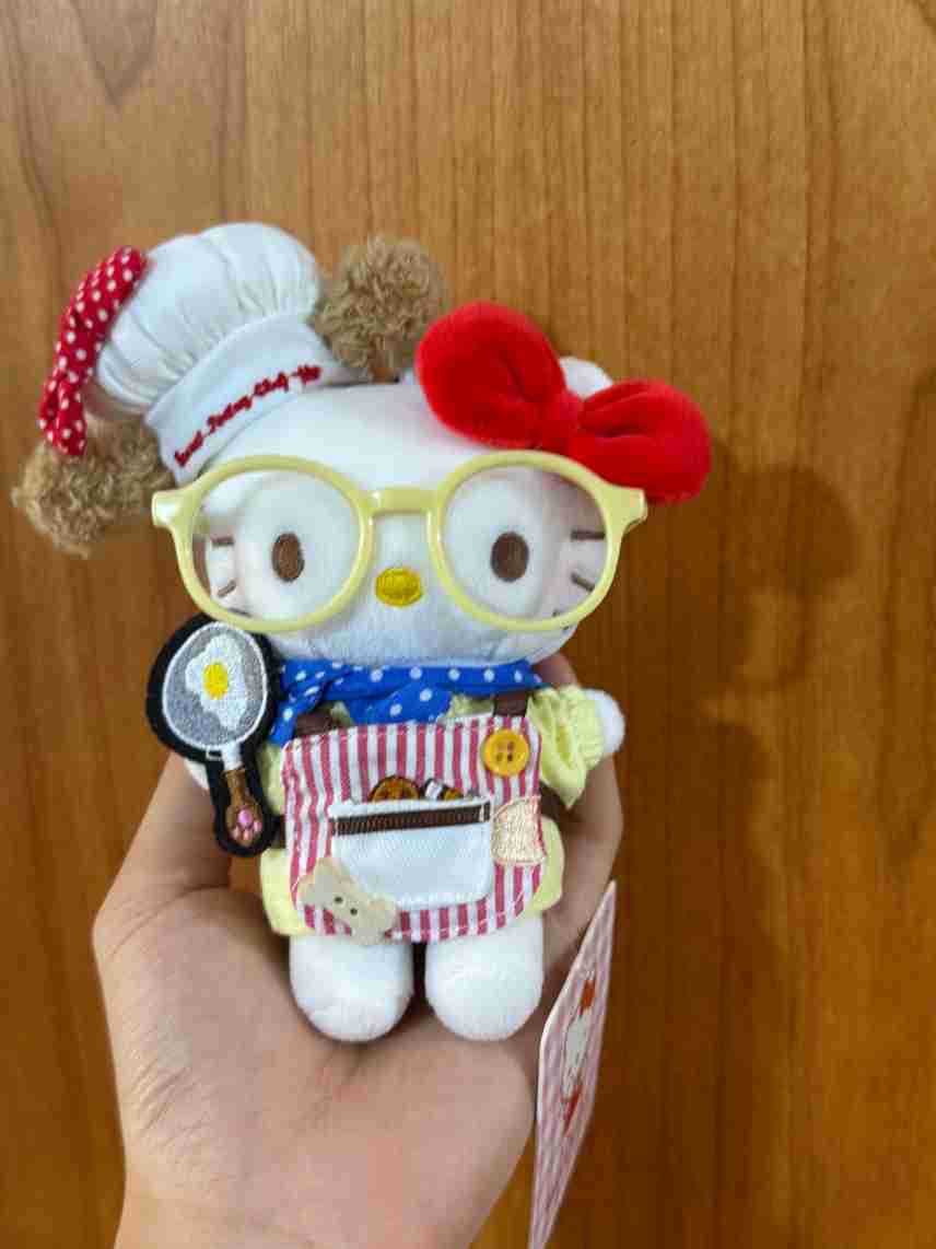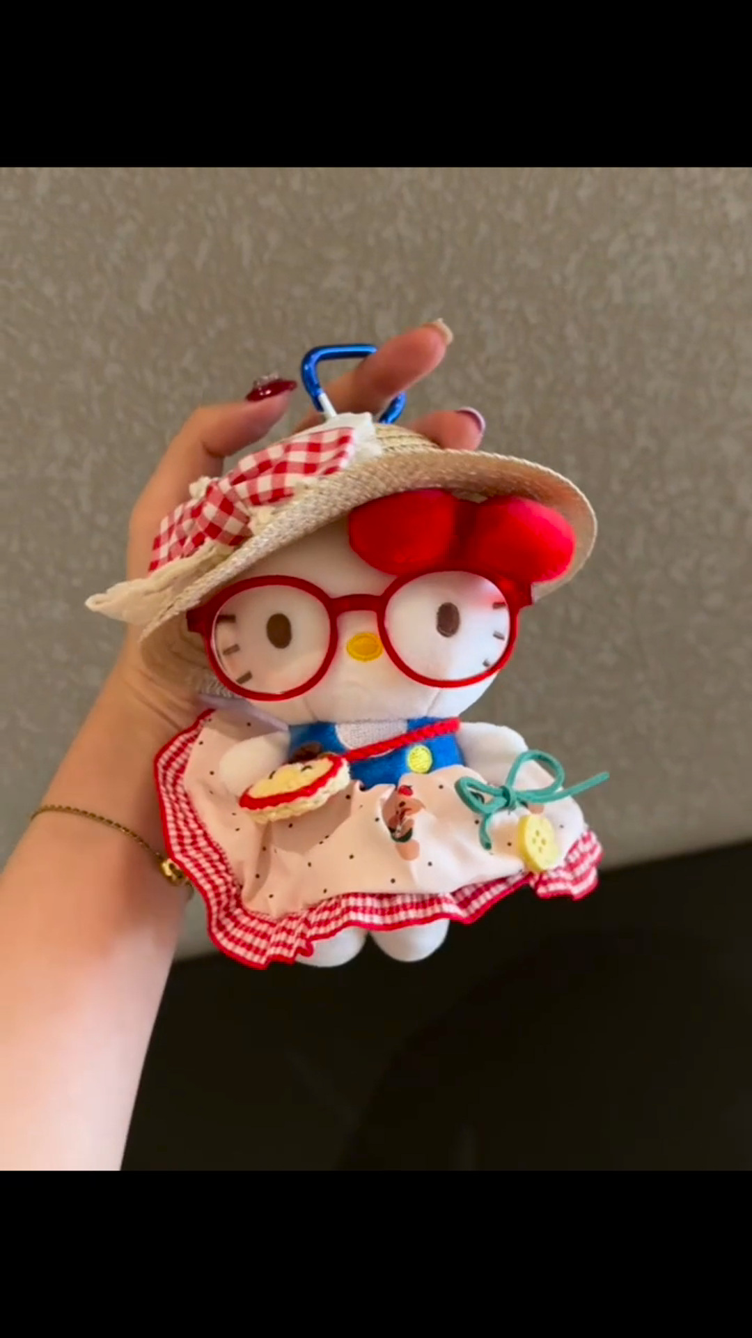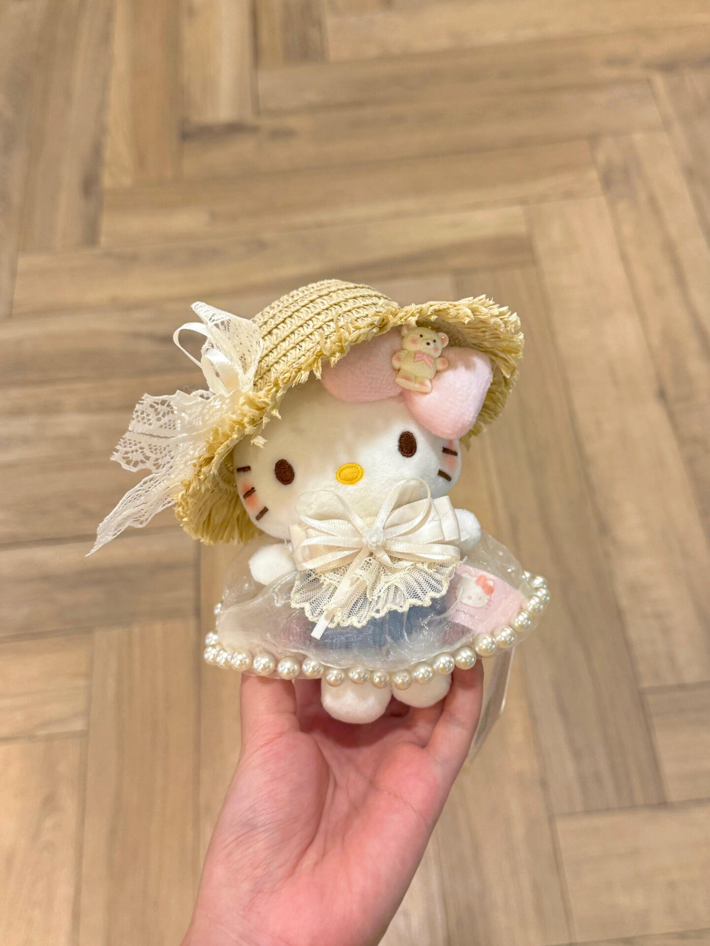 • 흰색 스커트와 빨간 체크무늬 가방을 들고 있는 키티