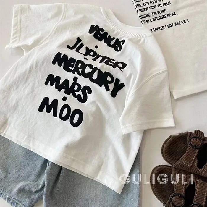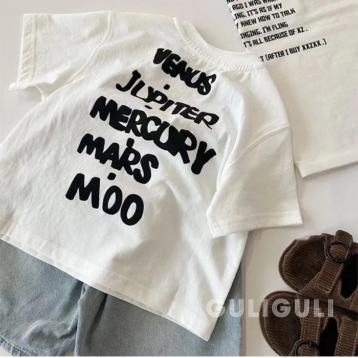 아동복 여름 2025 신식 소년 소녀 순면 흰색 편지 티셔츠 중소 어린이 아기 얇은 최고 트렌디스토어 가기