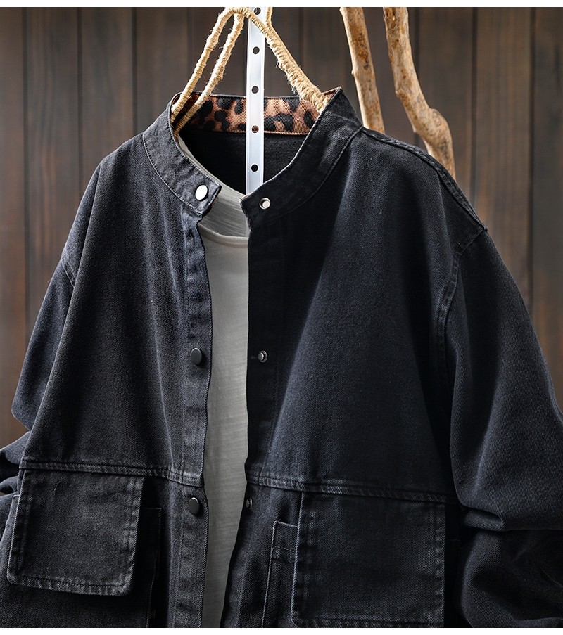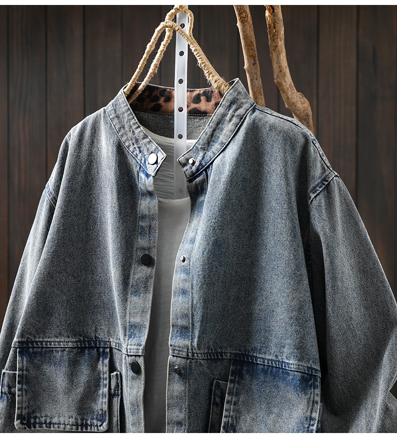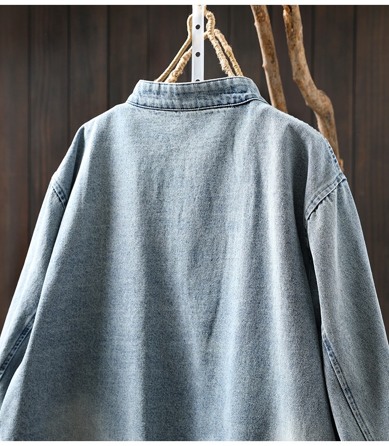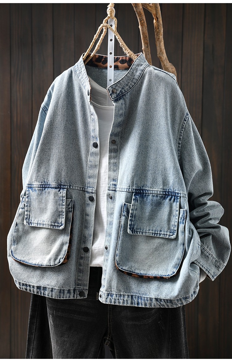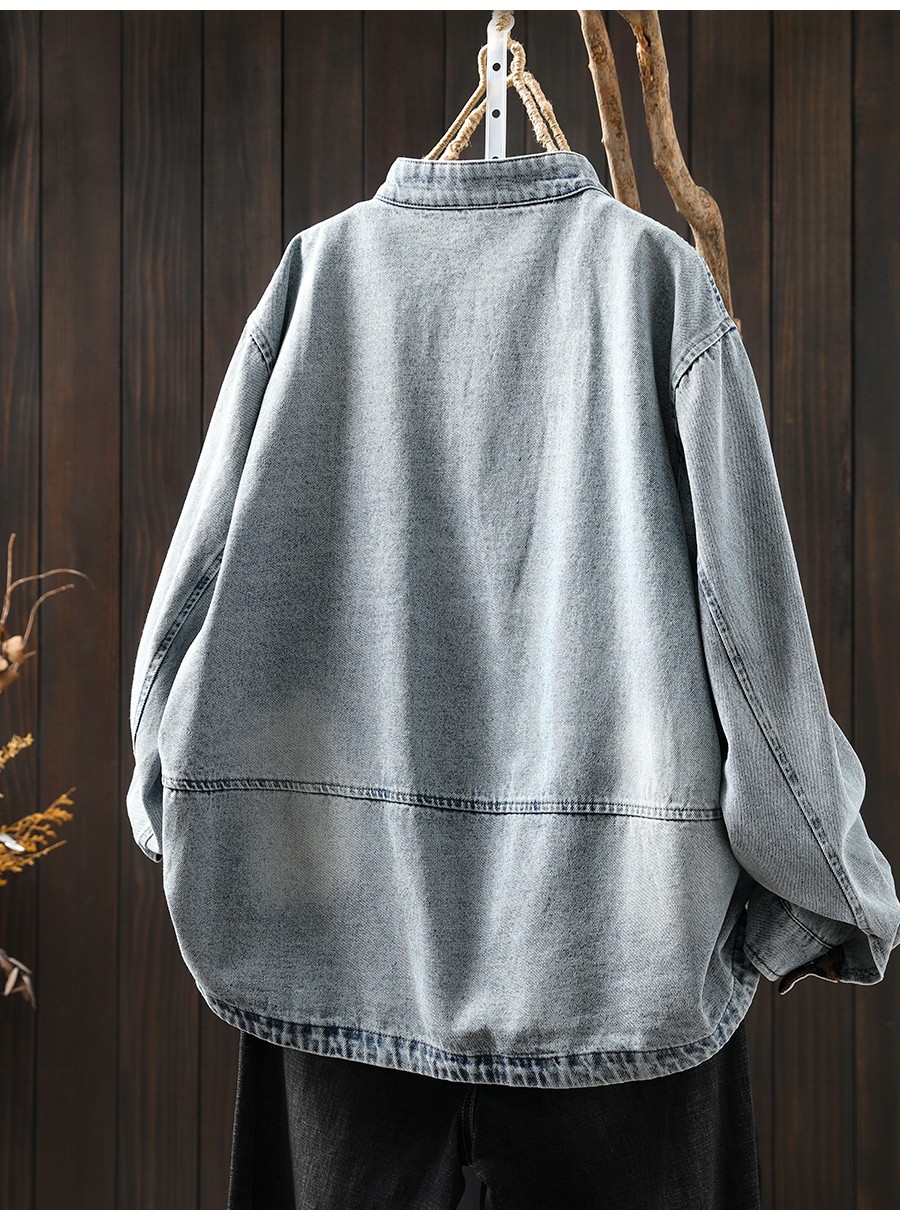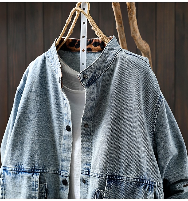 봄 새로운 대형 포켓 스탠드 칼라 세척 데님 코트 여성 느슨한 캐주얼 50022