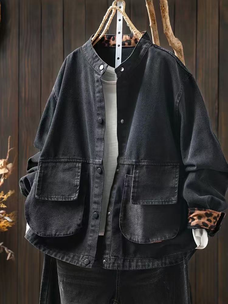 봄 새로운 대형 포켓 스탠드 칼라 세척 데님 코트 여성 느슨한 캐주얼 50022스토어 가기