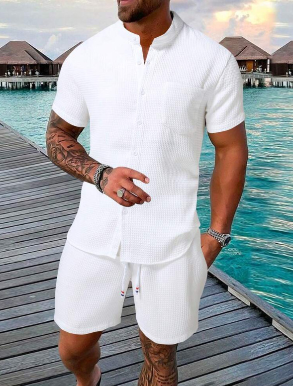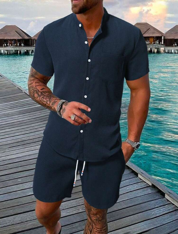 2025 년 여름 아마존 캐주얼 2 피스 남성 간단한 단색 질감 반팔 셔츠 및 반바지 세트