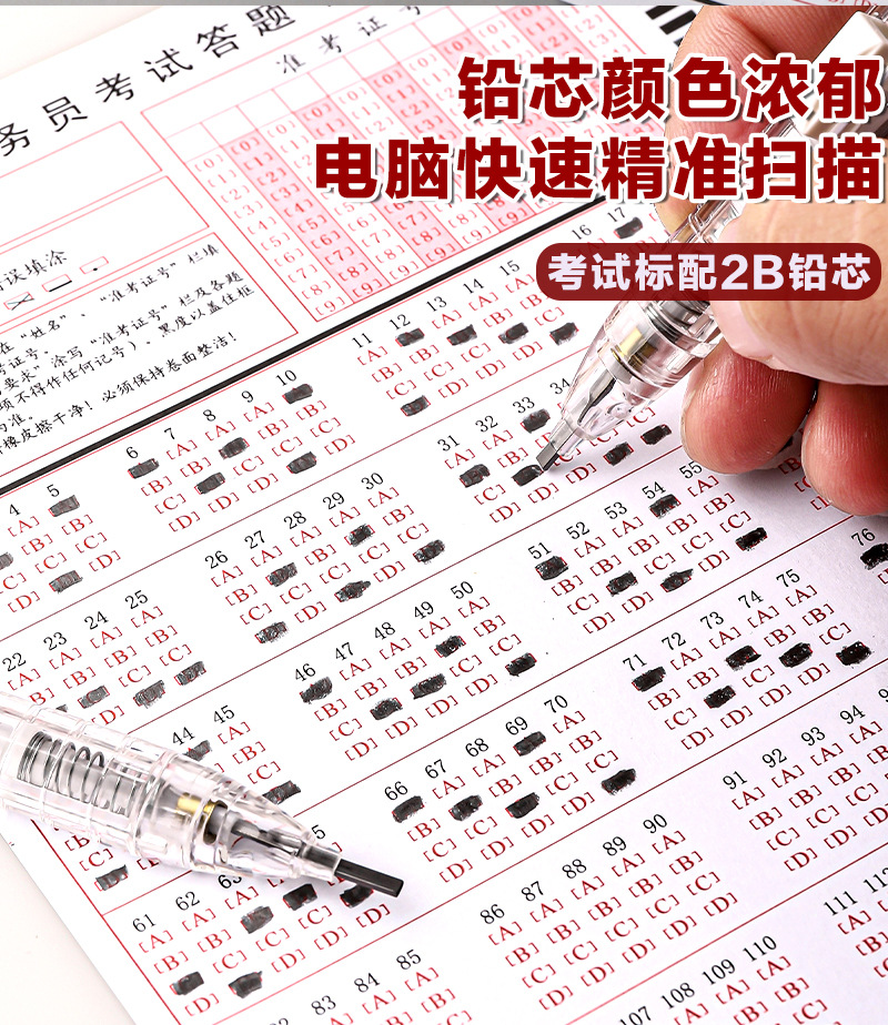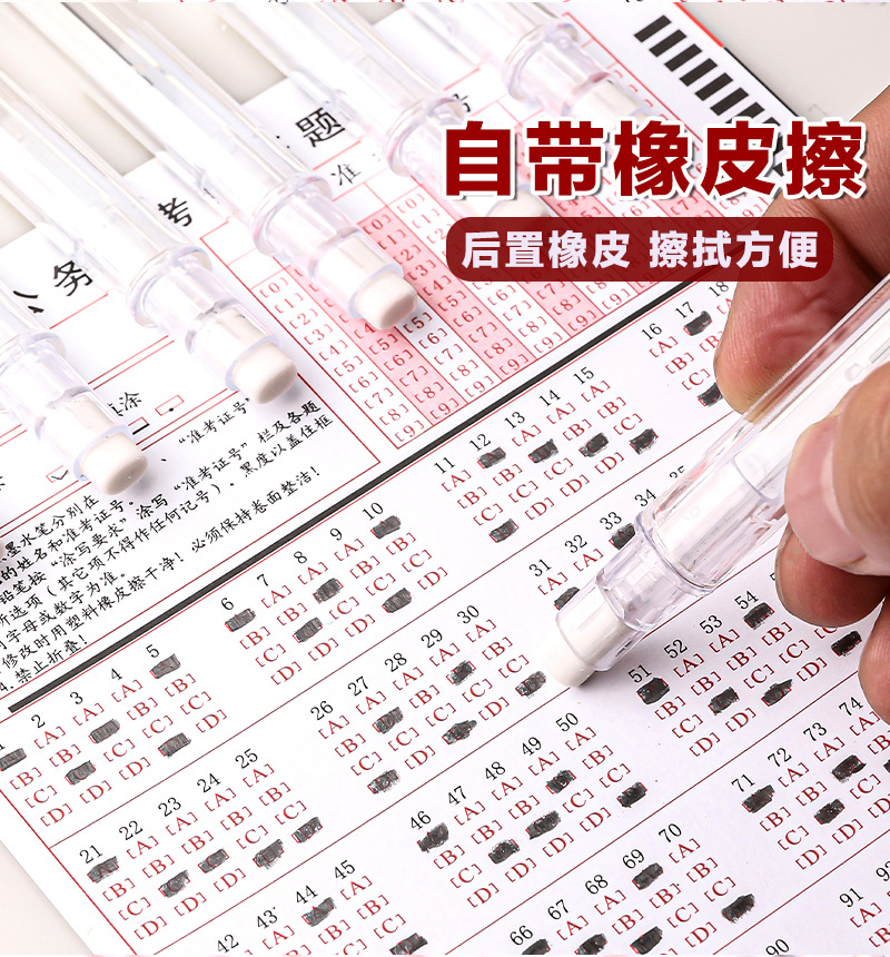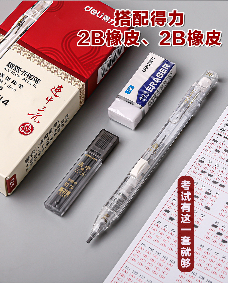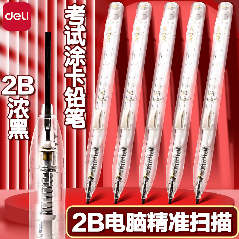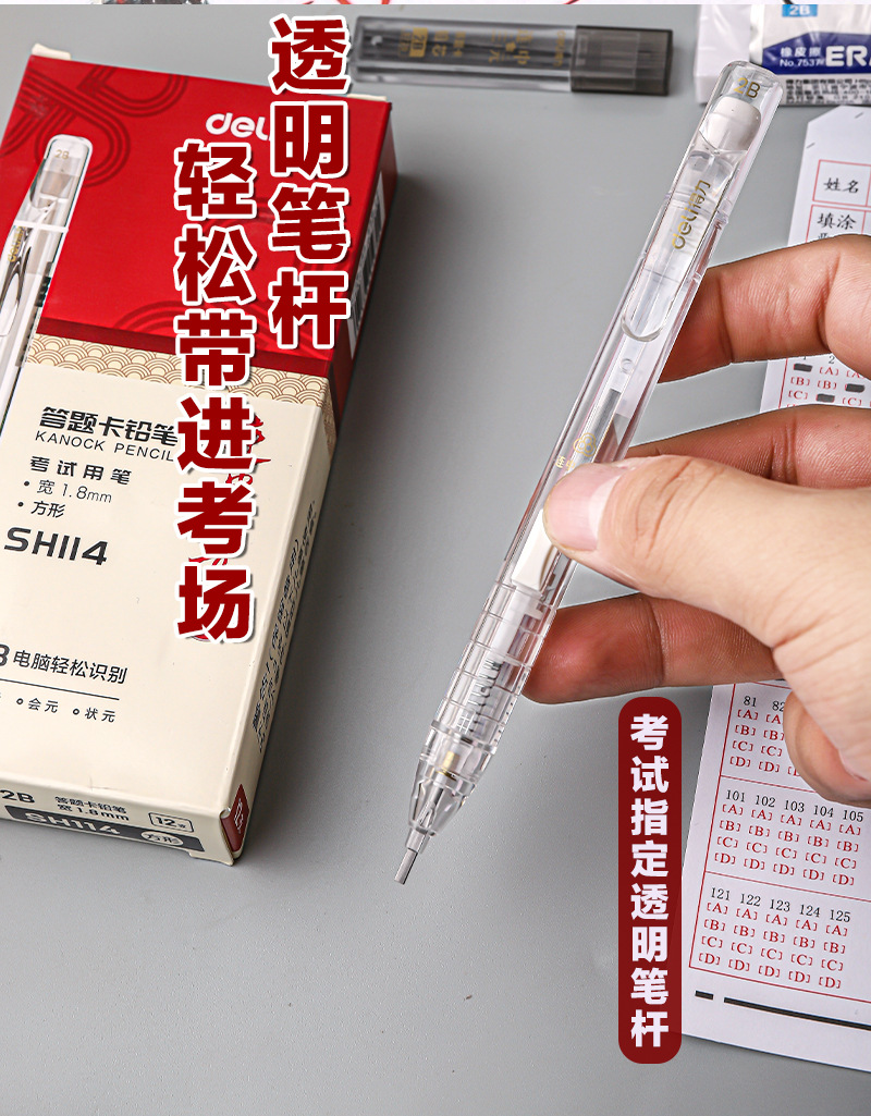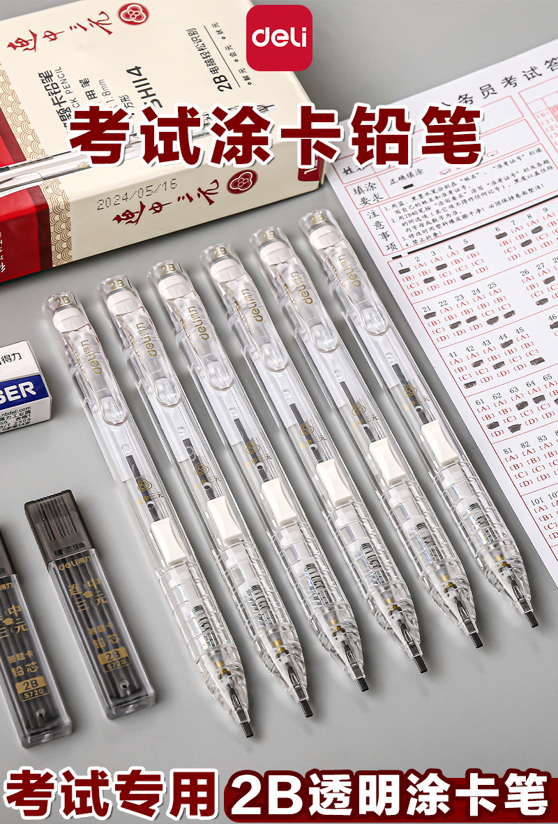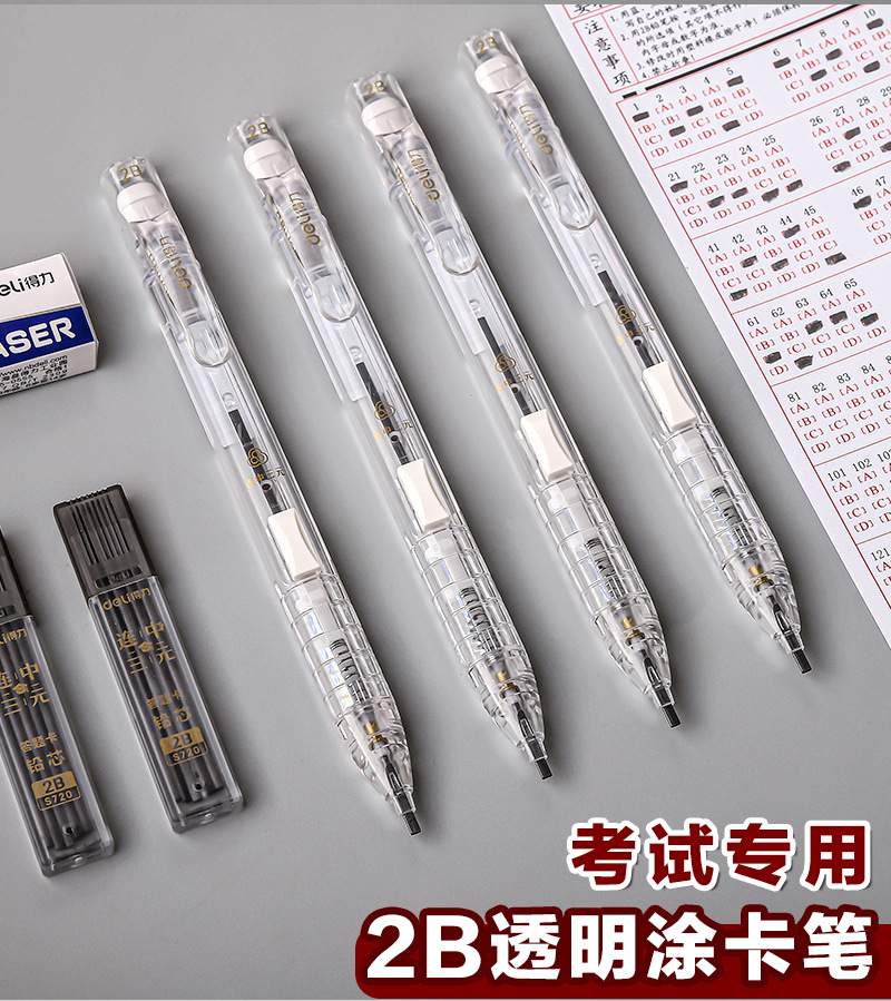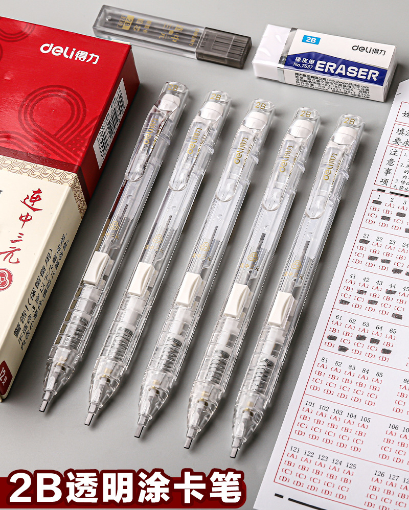 학생들이 대학 입시 및 고등학교 입시에 답안지를 쓰기 위해 사용할 수 있는 델리의 투명한 2B 카드 펜
