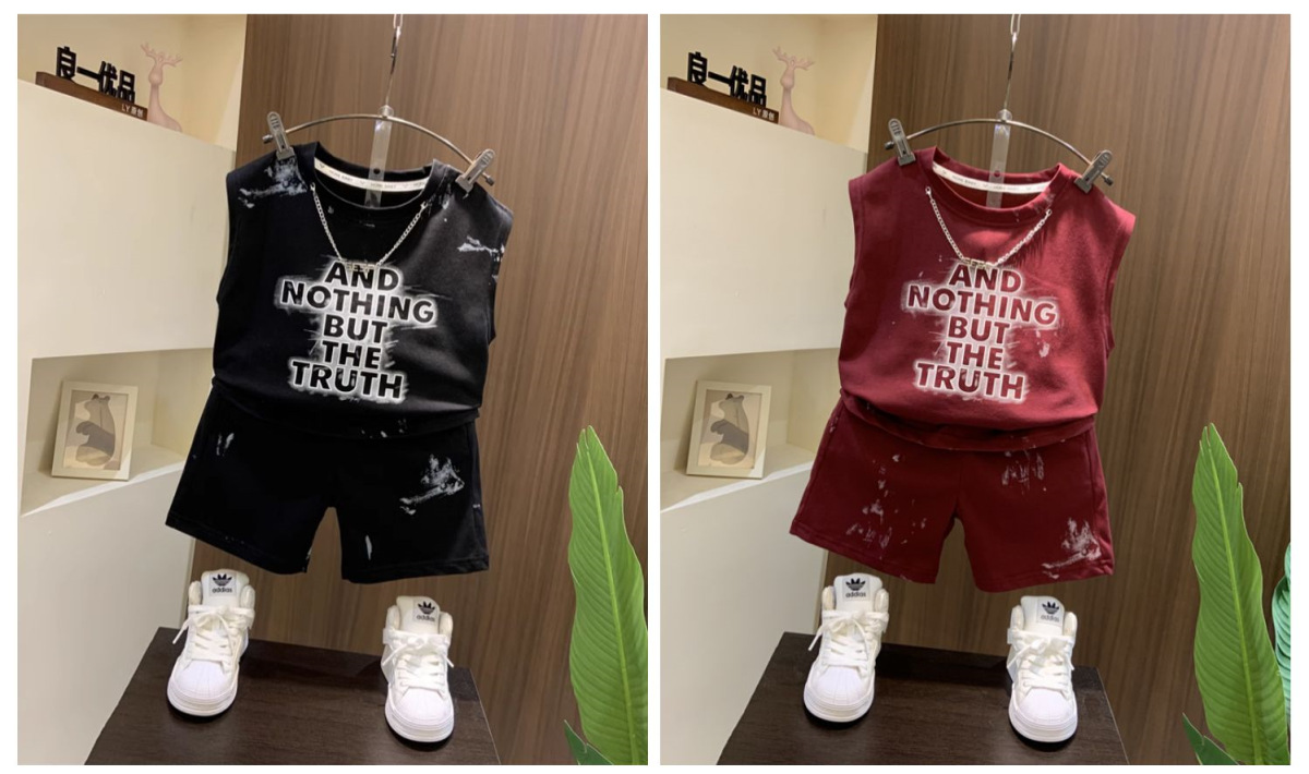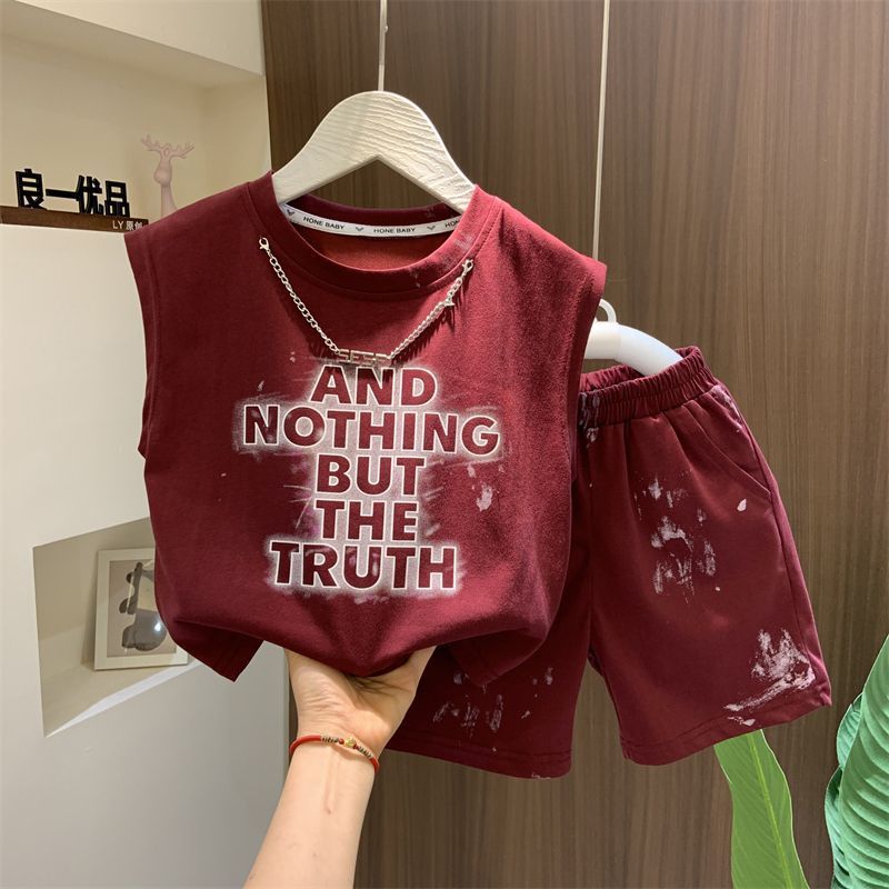 어린이 의류 소년 여름 의류 세트 2024 새로운 스타일 어린이 조끼 반바지 투피스 아기 여름 옷 얇은스토어 가기