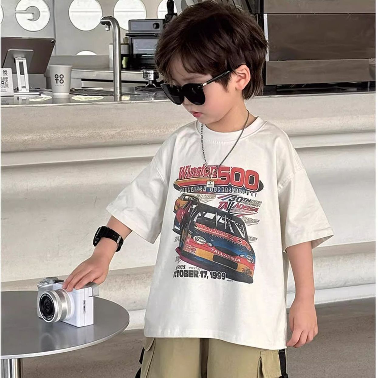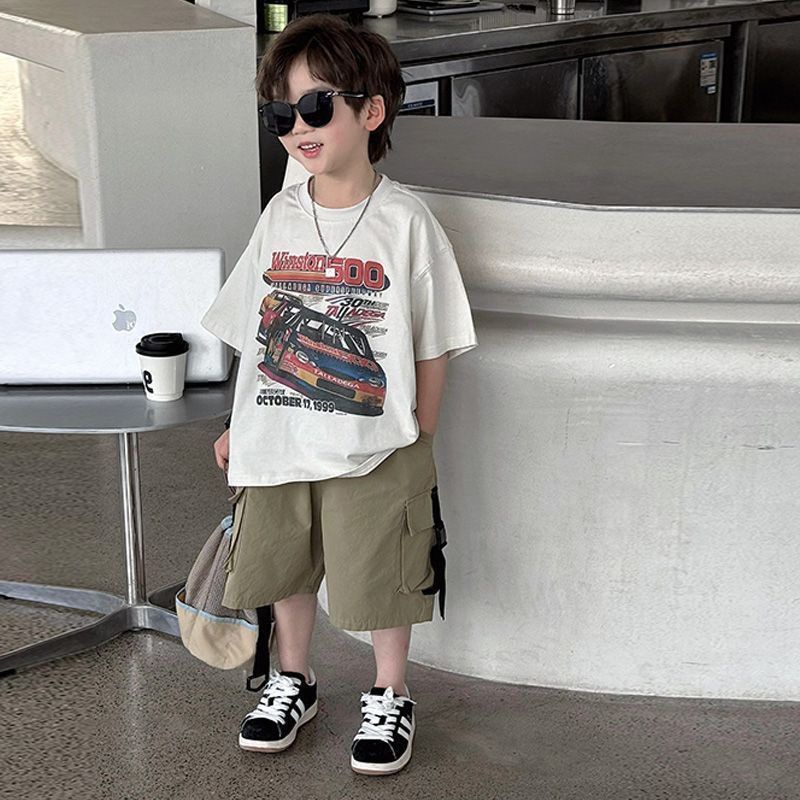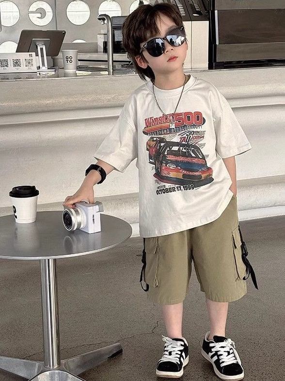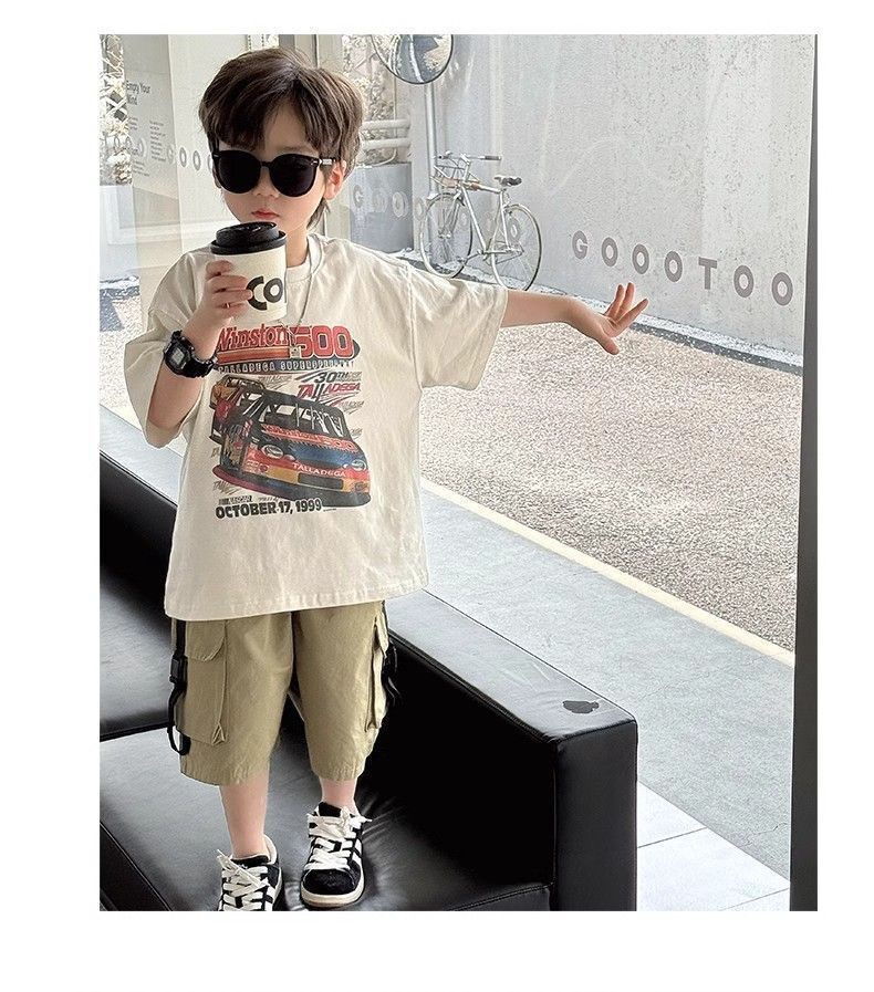 220g 순면 헤비급 아동복 소년 반팔 티셔츠 여름 새로운 스타일 잘 생긴 와이드 다용도 트럭 프린트 중대형 어린이스토어 가기