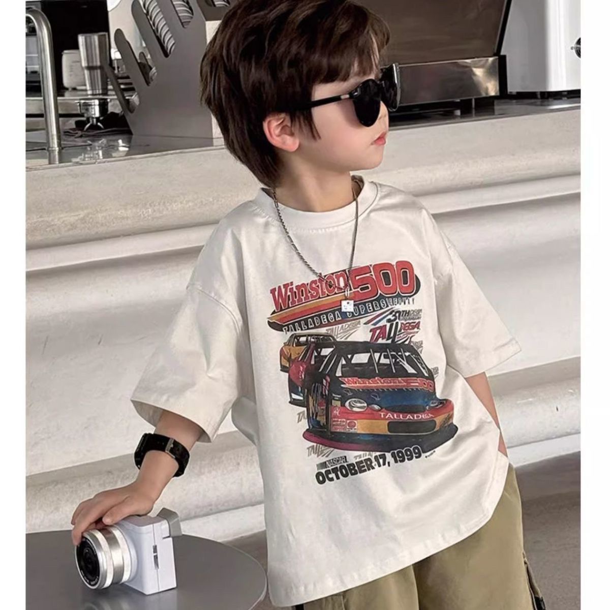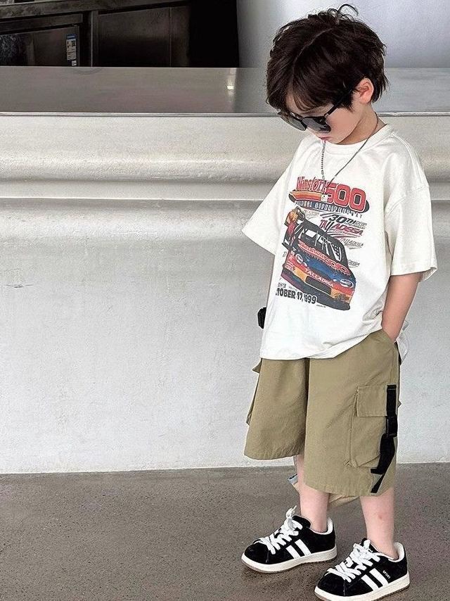 220g 순면 헤비급 아동복 소년 반팔 티셔츠 여름 새로운 스타일 잘 생긴 와이드 다용도 트럭 프린트 중대형 어린이