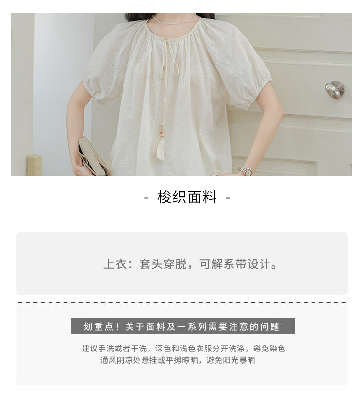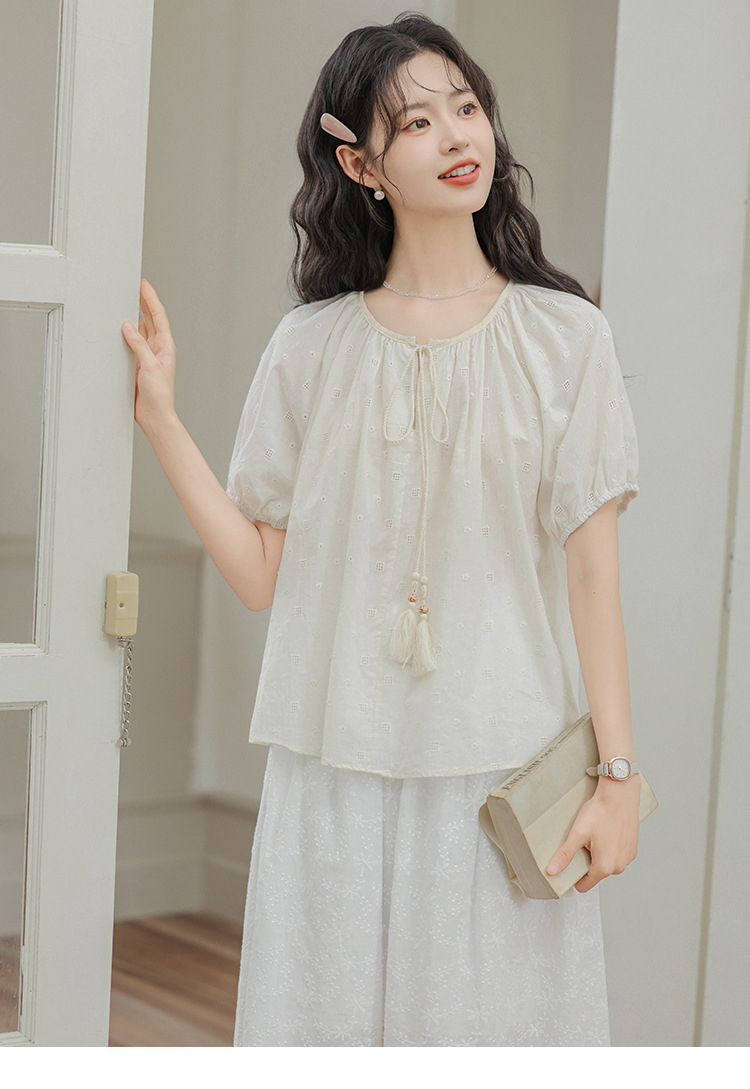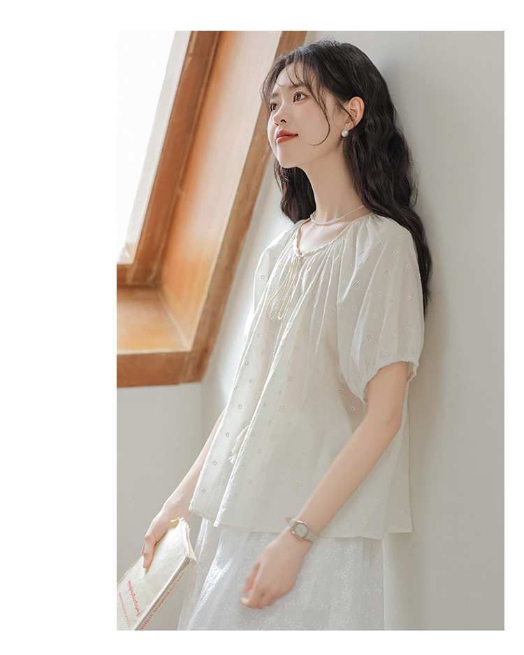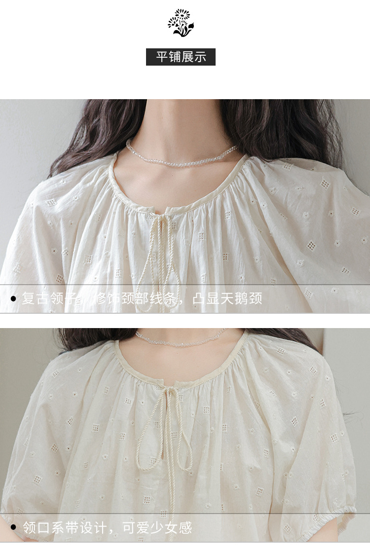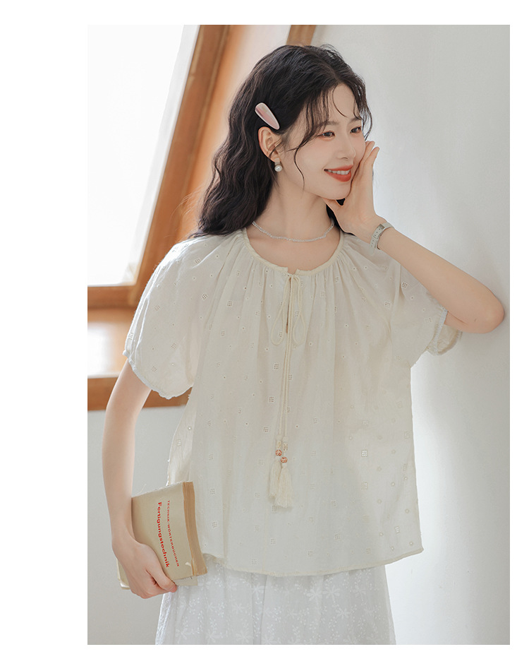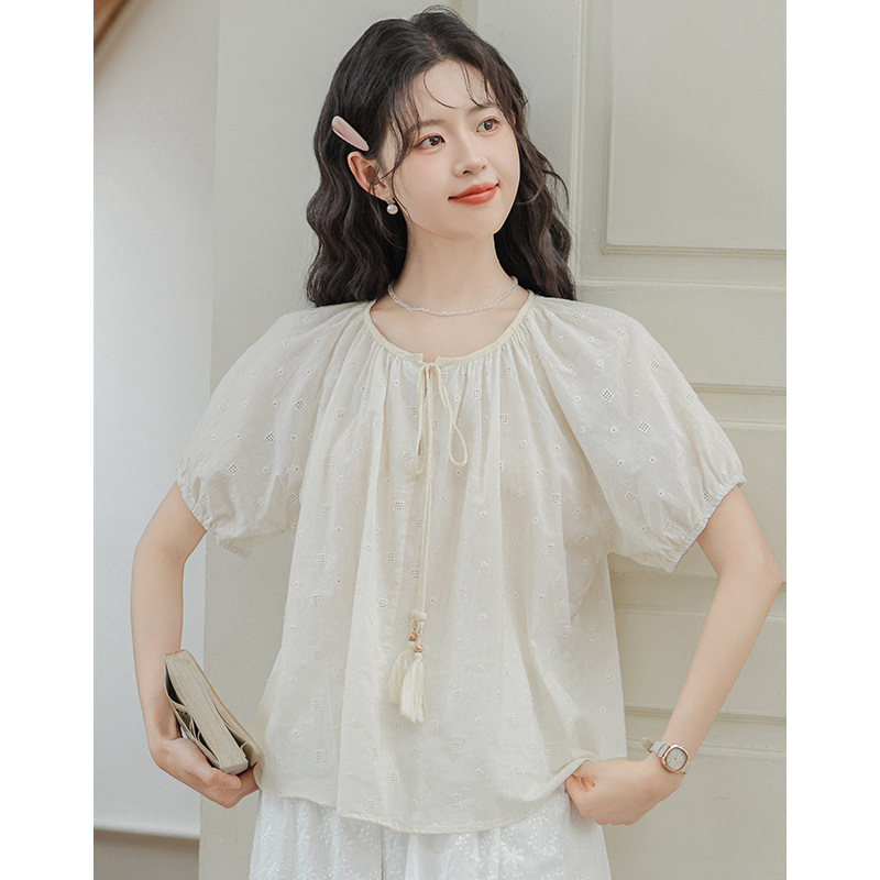 2025 년 여름 새로운 한국 스타일 달콤한 작은 민족 스타일 펜던트 레이스 업 퍼프 소매 반팔 풀오버 셔츠스토어 가기