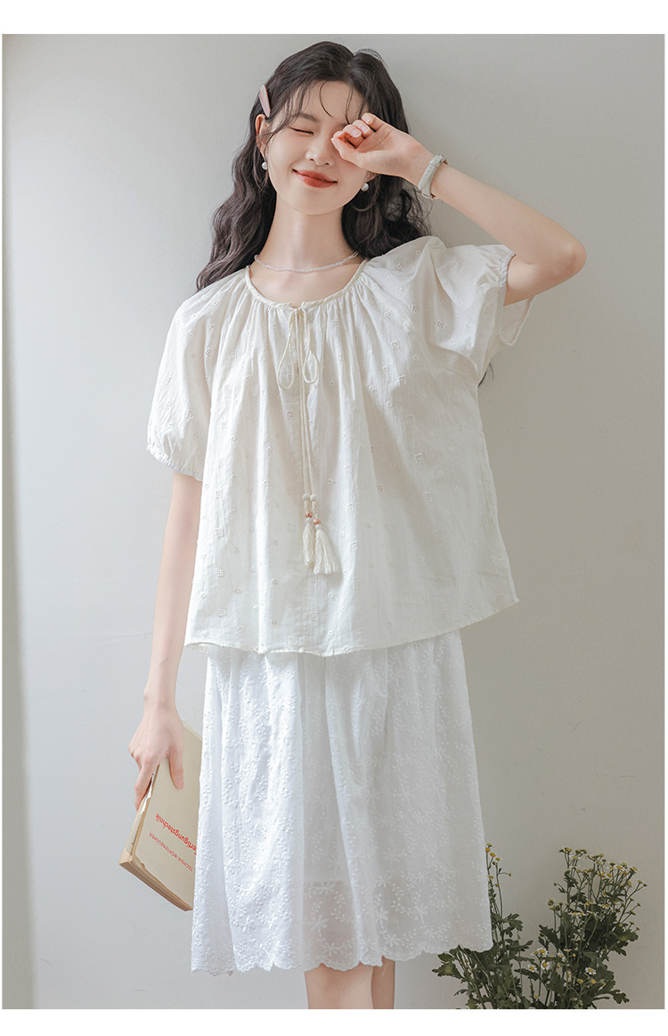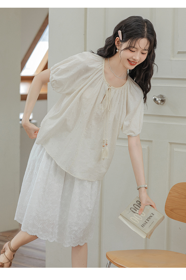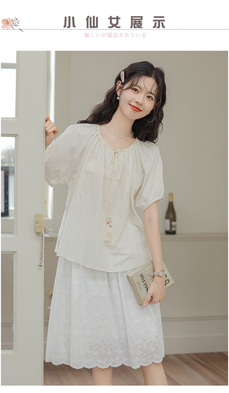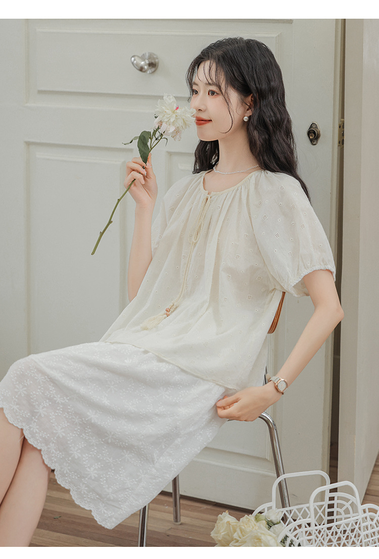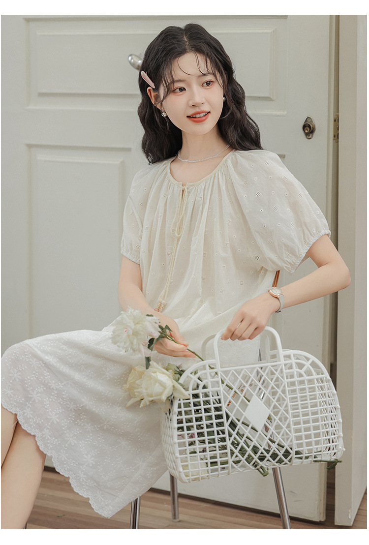 2025 년 여름 새로운 한국 스타일 달콤한 작은 민족 스타일 펜던트 레이스 업 퍼프 소매 반팔 풀오버 셔츠스토어 가기