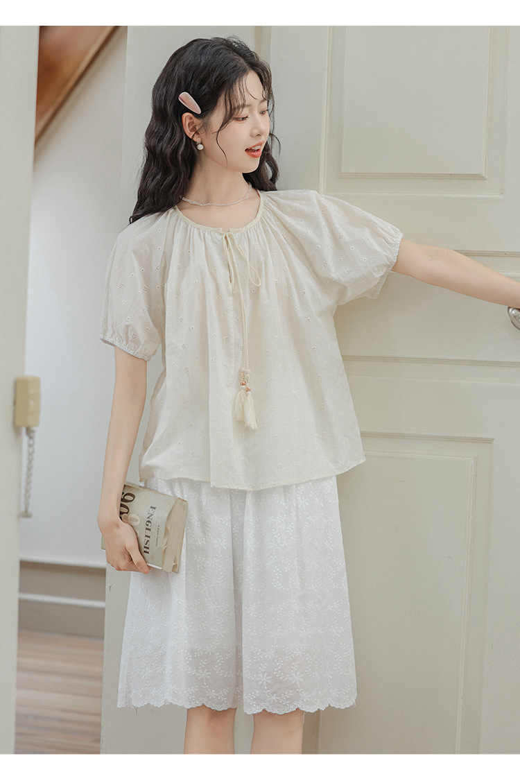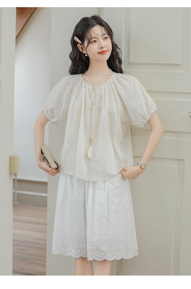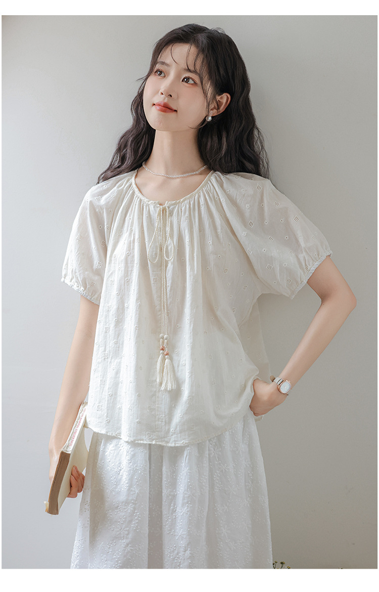 2025 년 여름 새로운 한국 스타일 달콤한 작은 민족 스타일 펜던트 레이스 업 퍼프 소매 반팔 풀오버 셔츠
