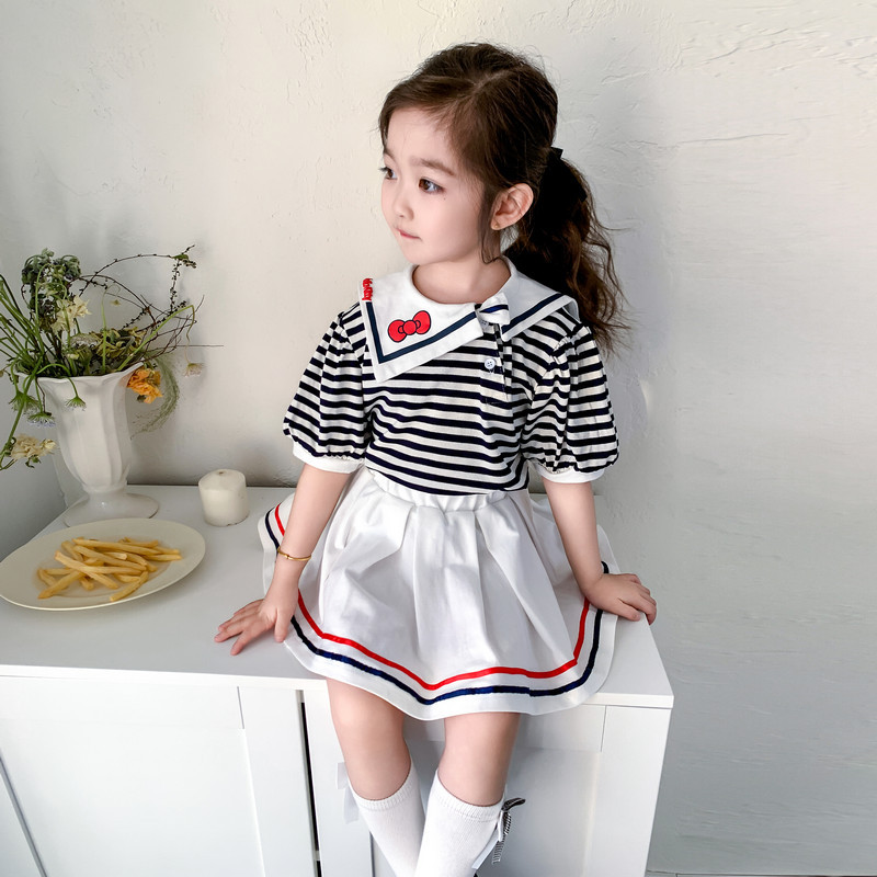 소녀 줄무늬 해군 스타일 세트 2025 여름 새로운 패션 소녀 세련된 투피스 세트 어린이 여름 원피스