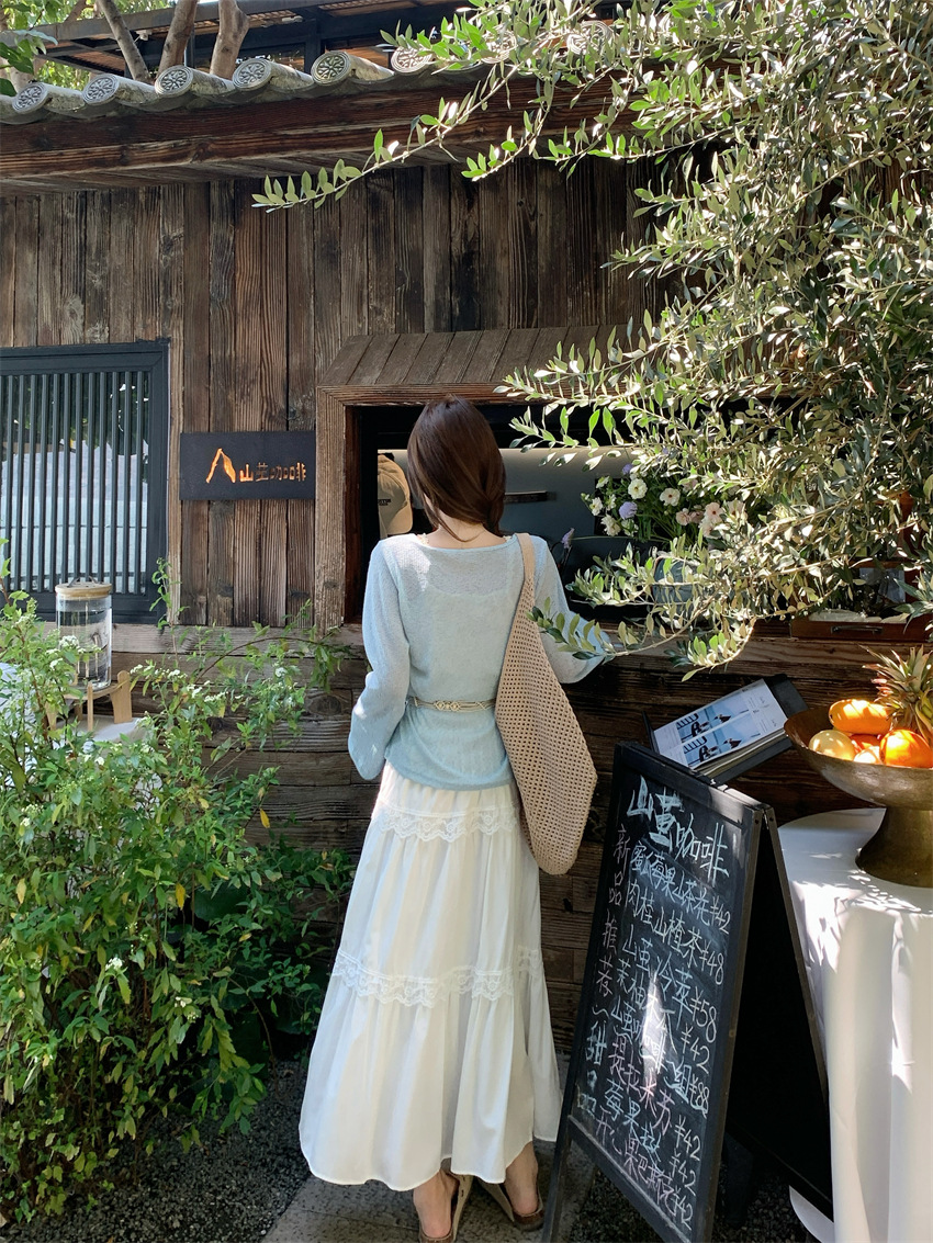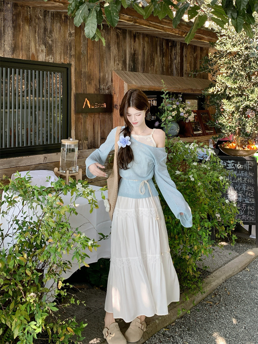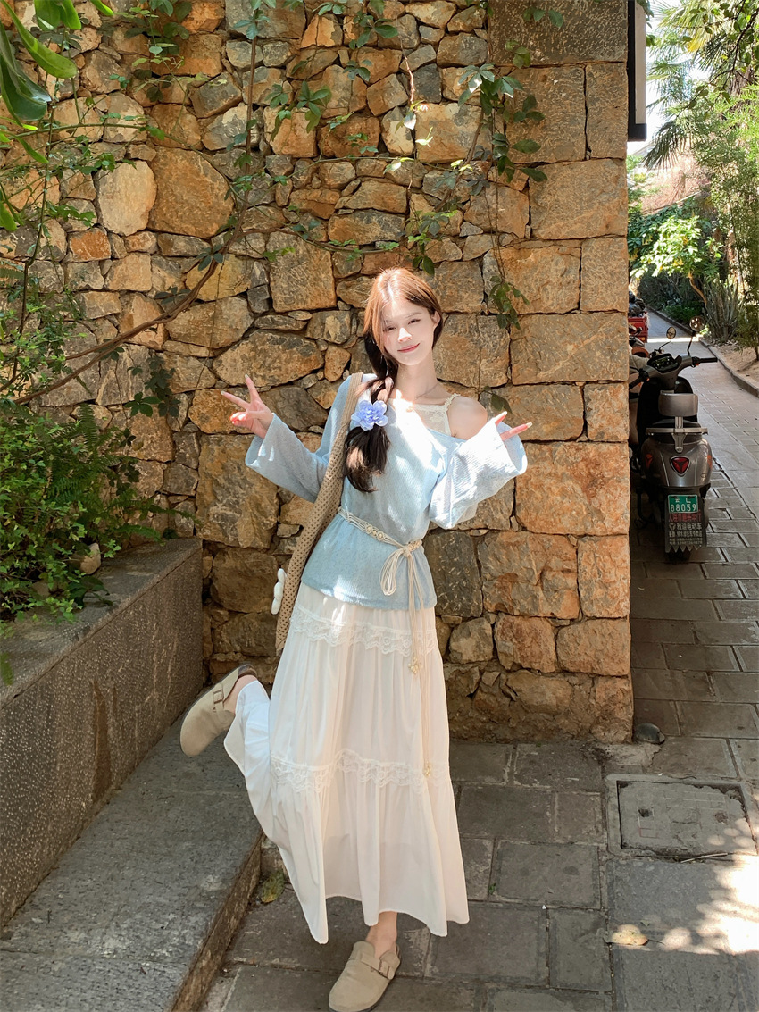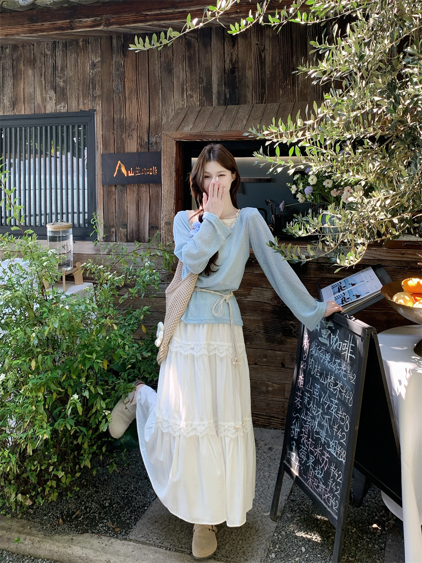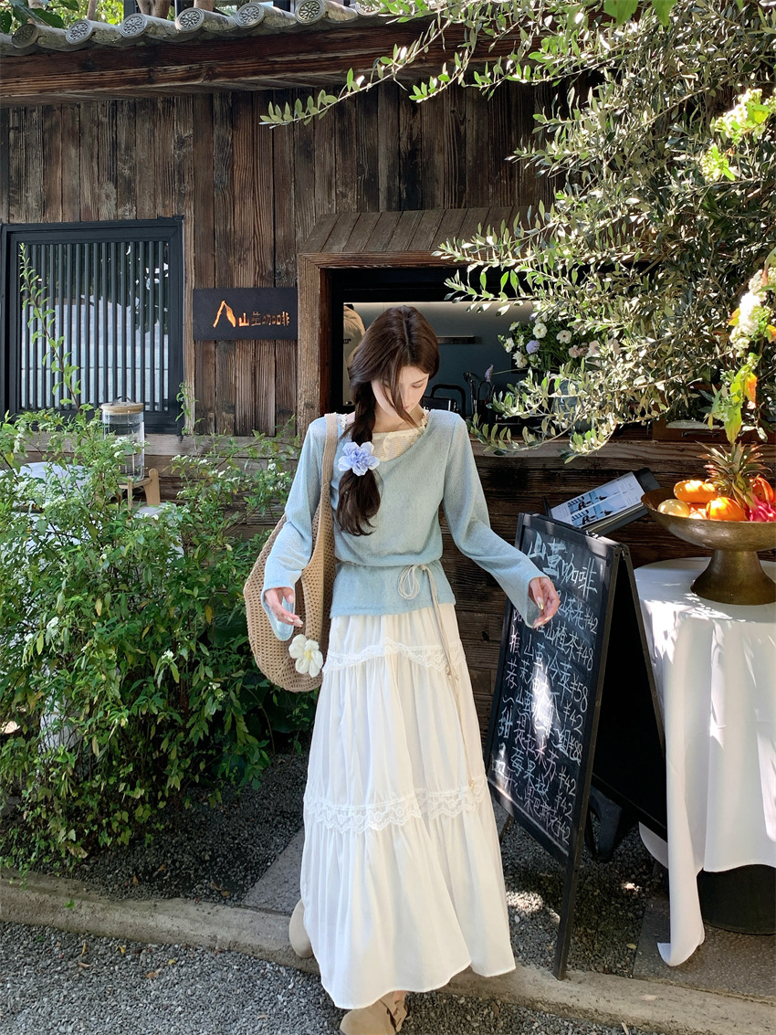 리얼 샷 부드러운 달콤한 소녀 스타일 긴 소매 라운드 넥 가짜 투피스 티셔츠 탑 레이스 레이스 케이크 스커트 79343