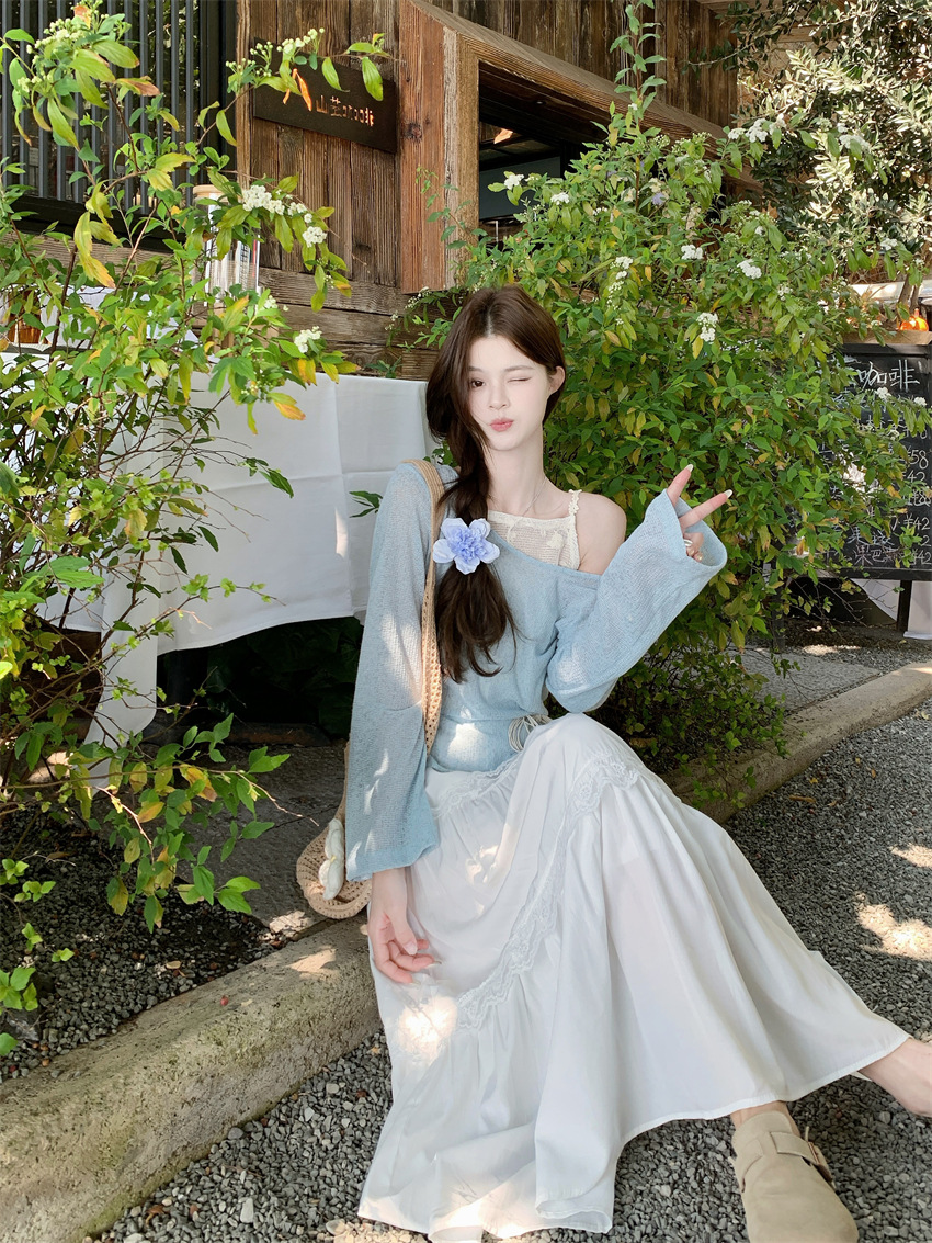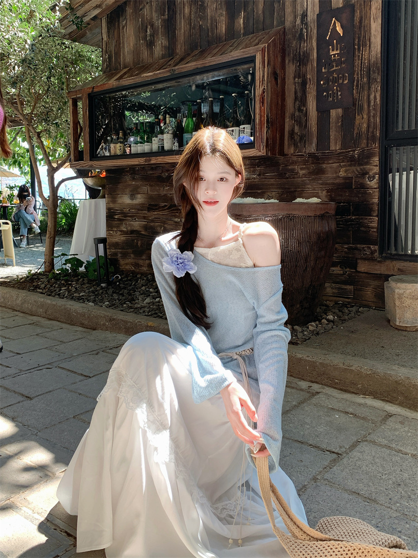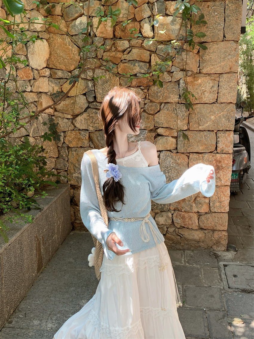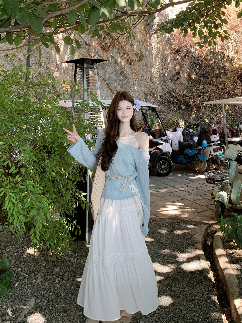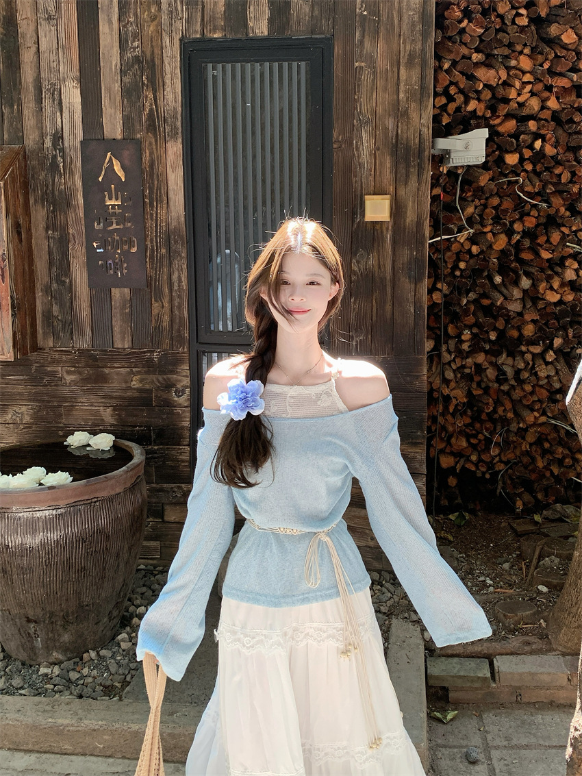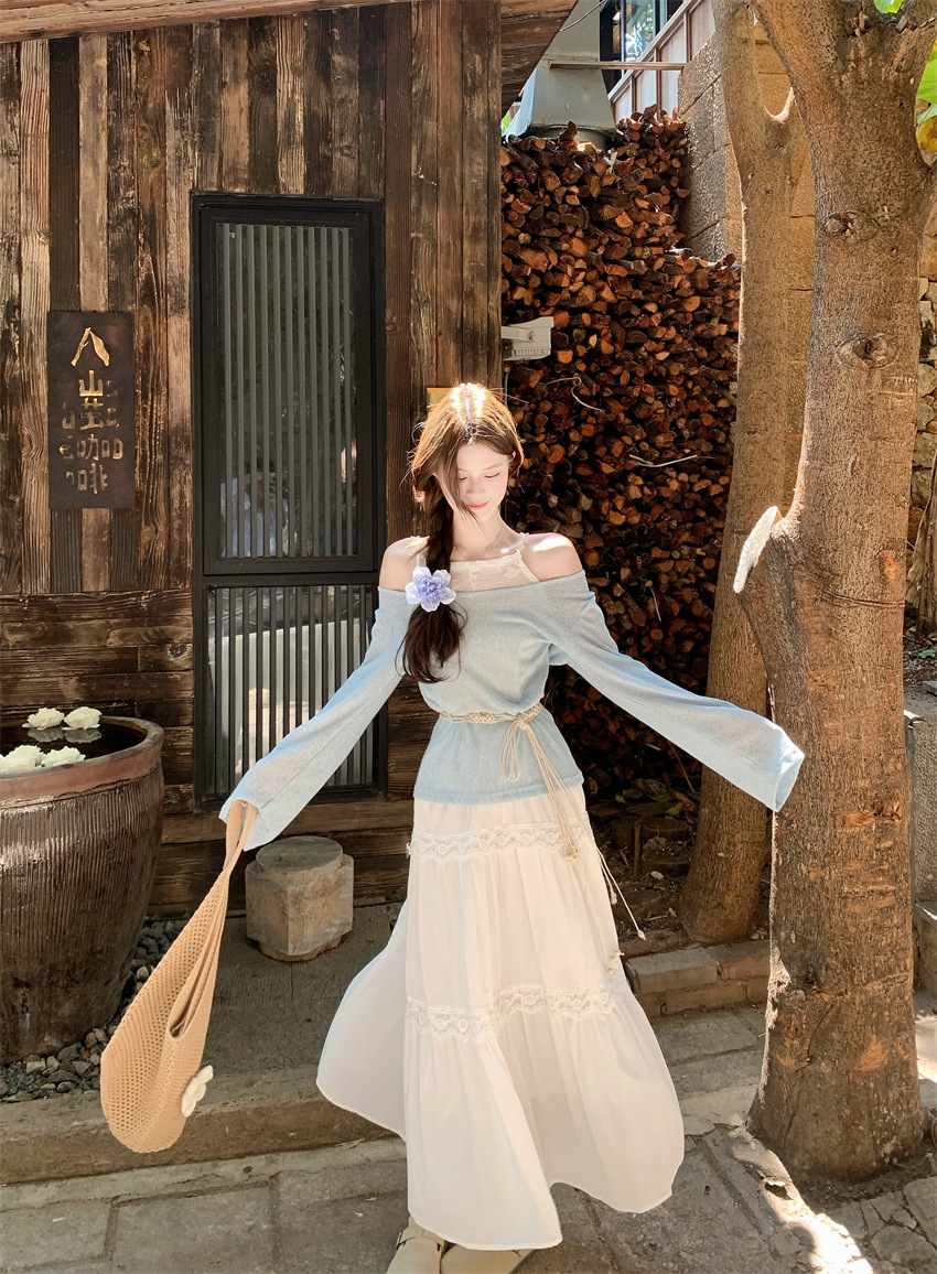 리얼 샷 부드러운 달콤한 소녀 스타일 긴 소매 라운드 넥 가짜 투피스 티셔츠 탑 레이스 레이스 케이크 스커트 79343