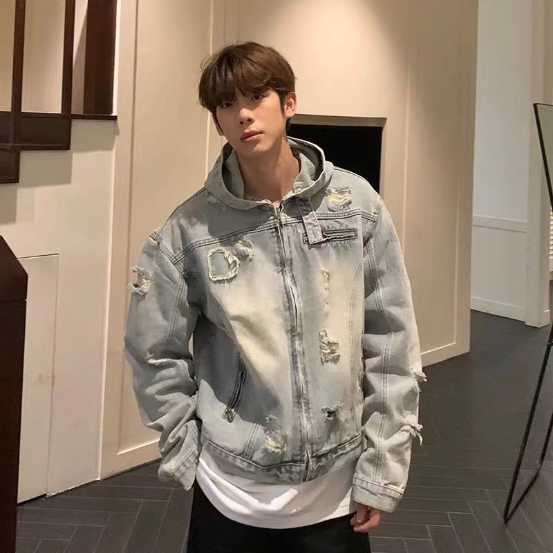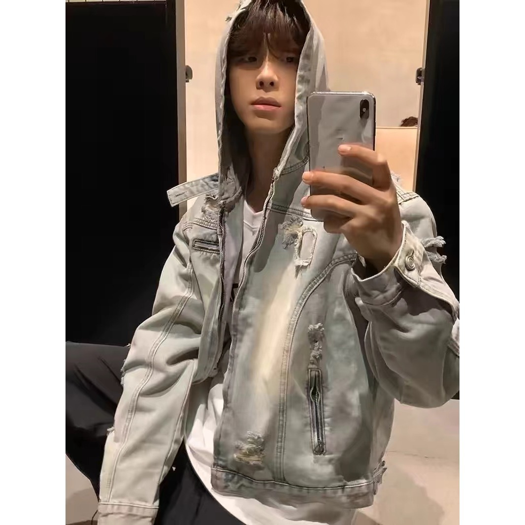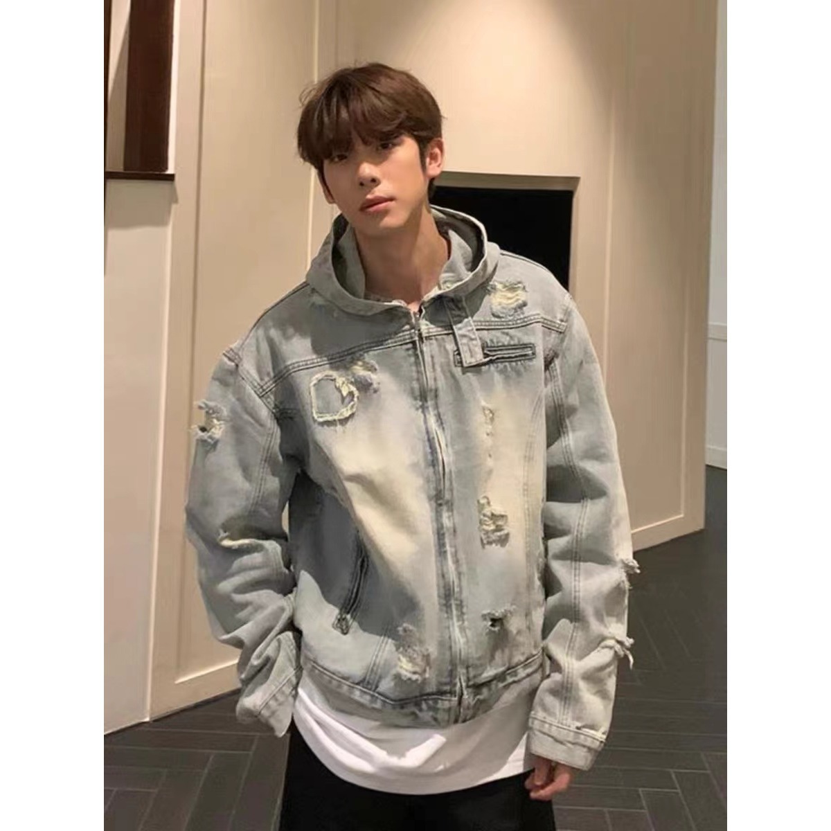 크로스보더 아메리칸 스트리트 레트로 디스트레스드 찢어진 후드 핸섬 워싱 데님 재킷 남성 루즈 캐주얼 재킷스토어 가기