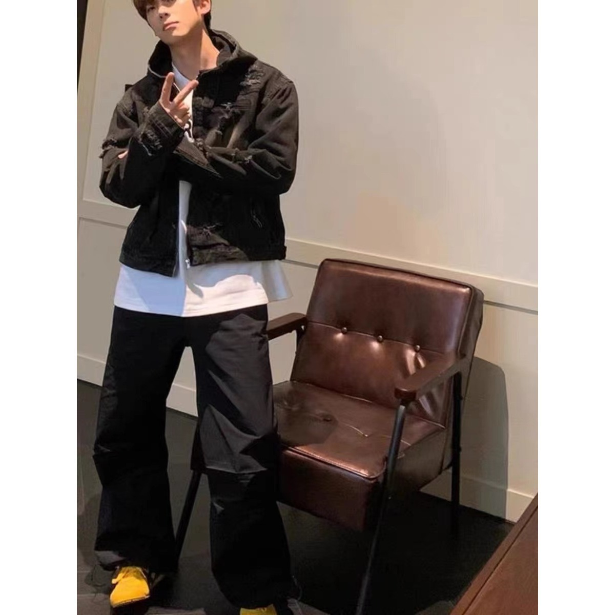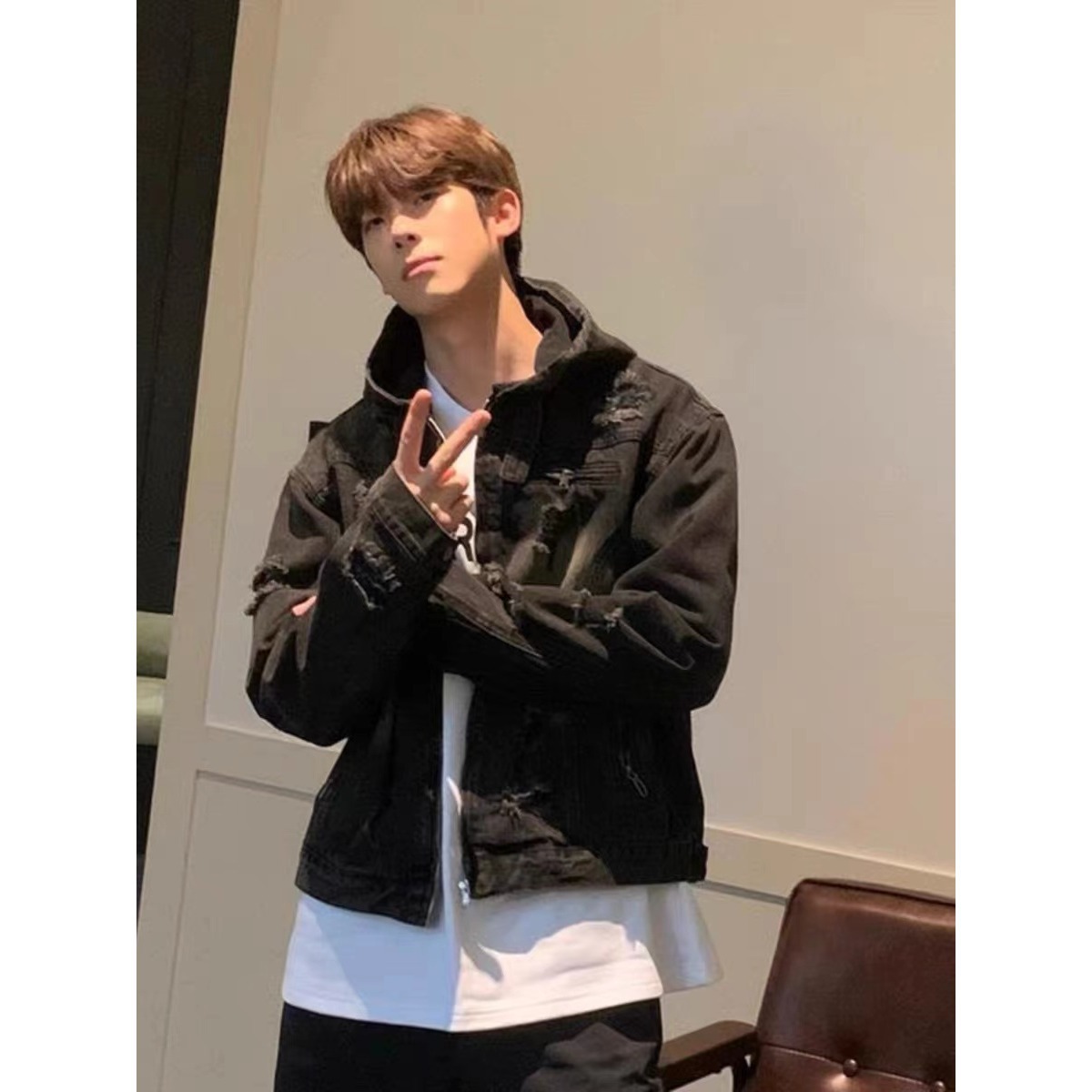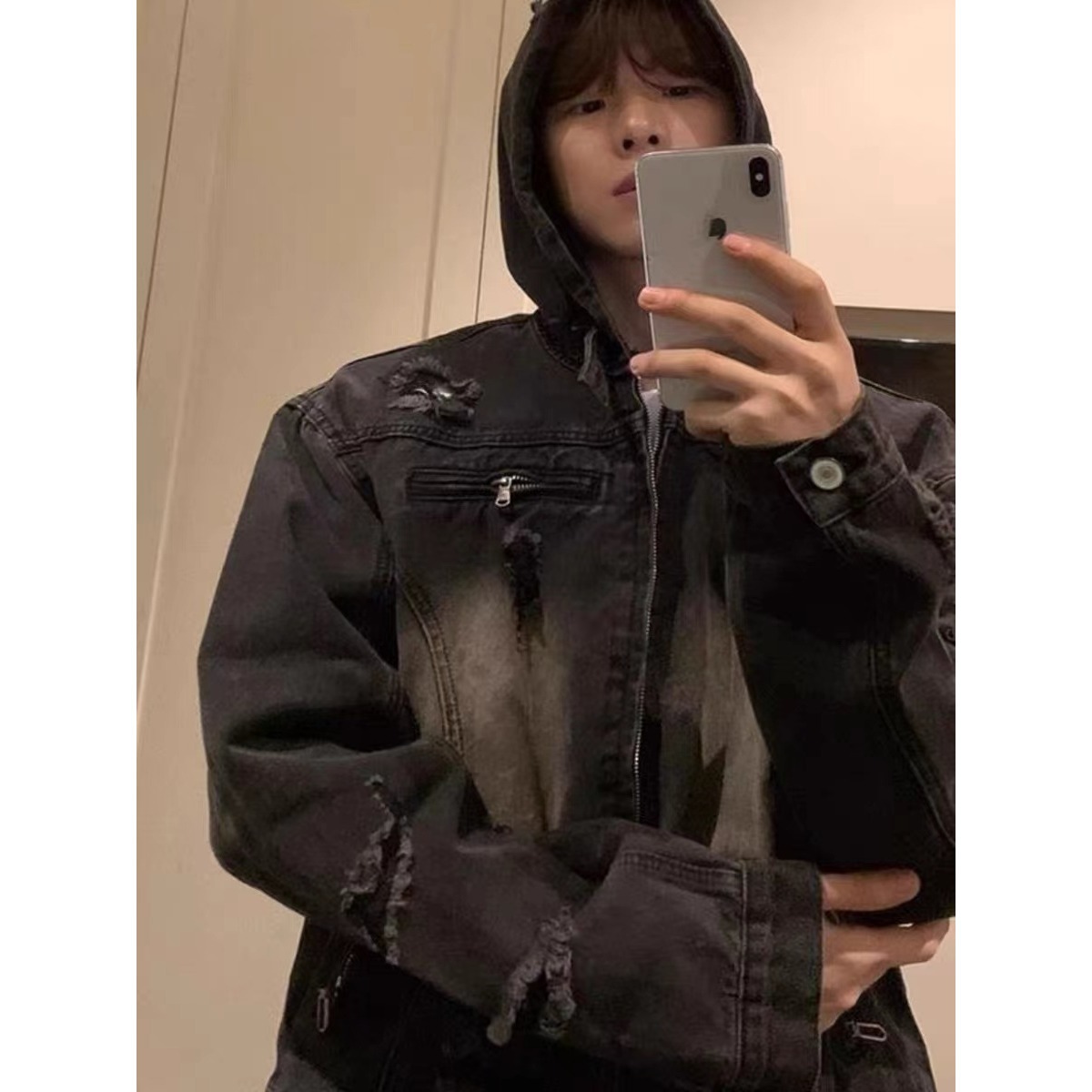 크로스보더 아메리칸 스트리트 레트로 디스트레스드 찢어진 후드 핸섬 워싱 데님 재킷 남성 루즈 캐주얼 재킷스토어 가기