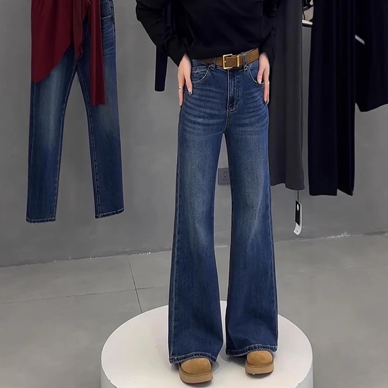 맥스 데이크스 ® 고탄성 슈퍼모델 플레어 팬츠 플러스 사이즈 하이웨이스트 레트로 스트레이트 청바지 뚱뚱한 mm가 엉덩이를 커버하고 슬림해 보입니다.