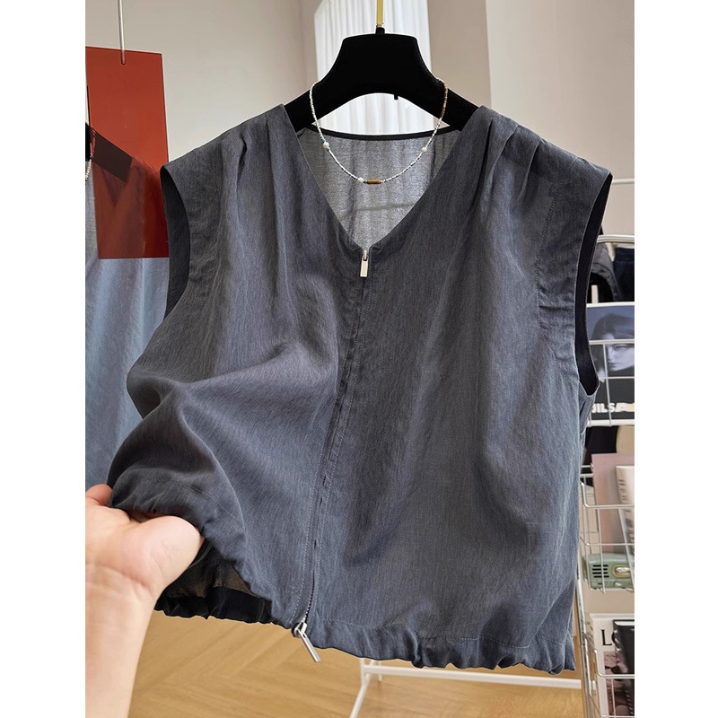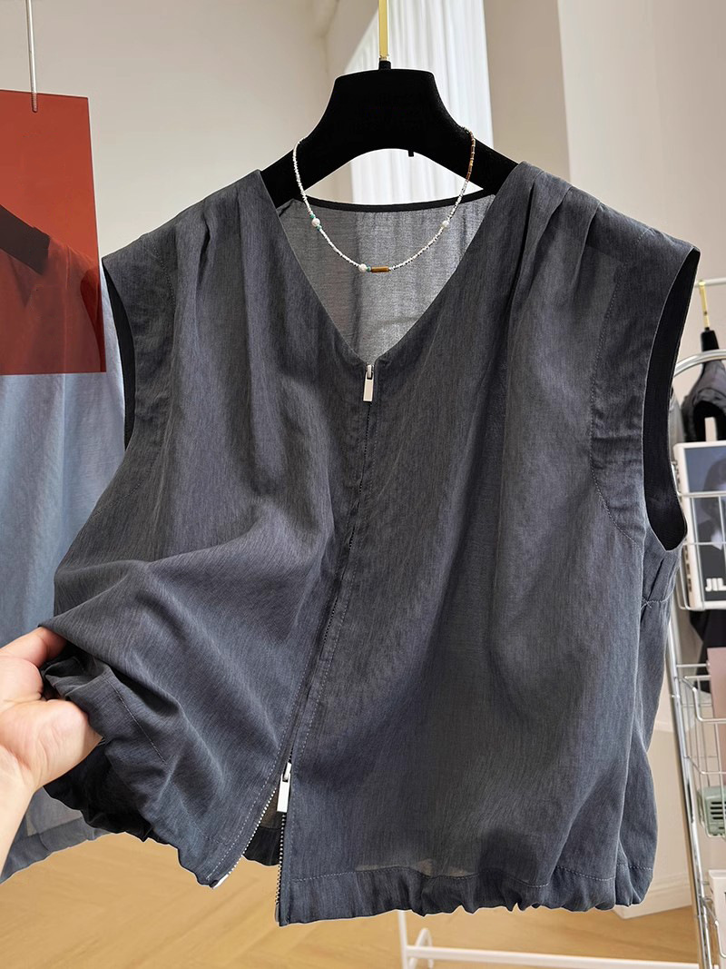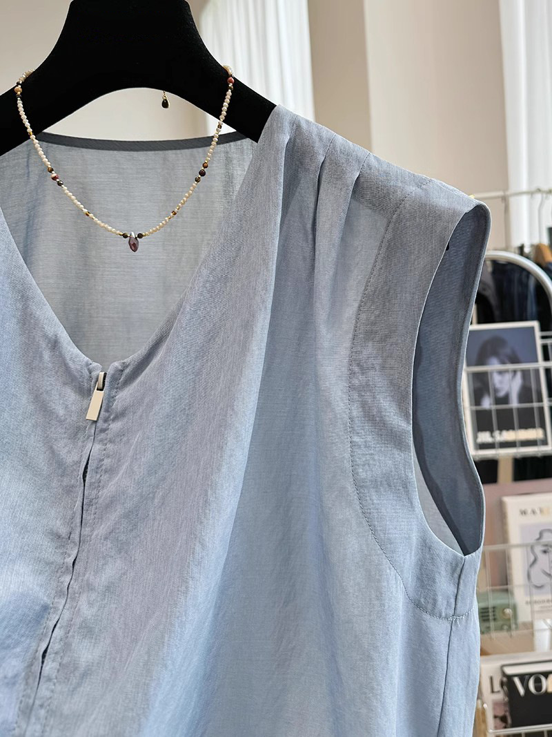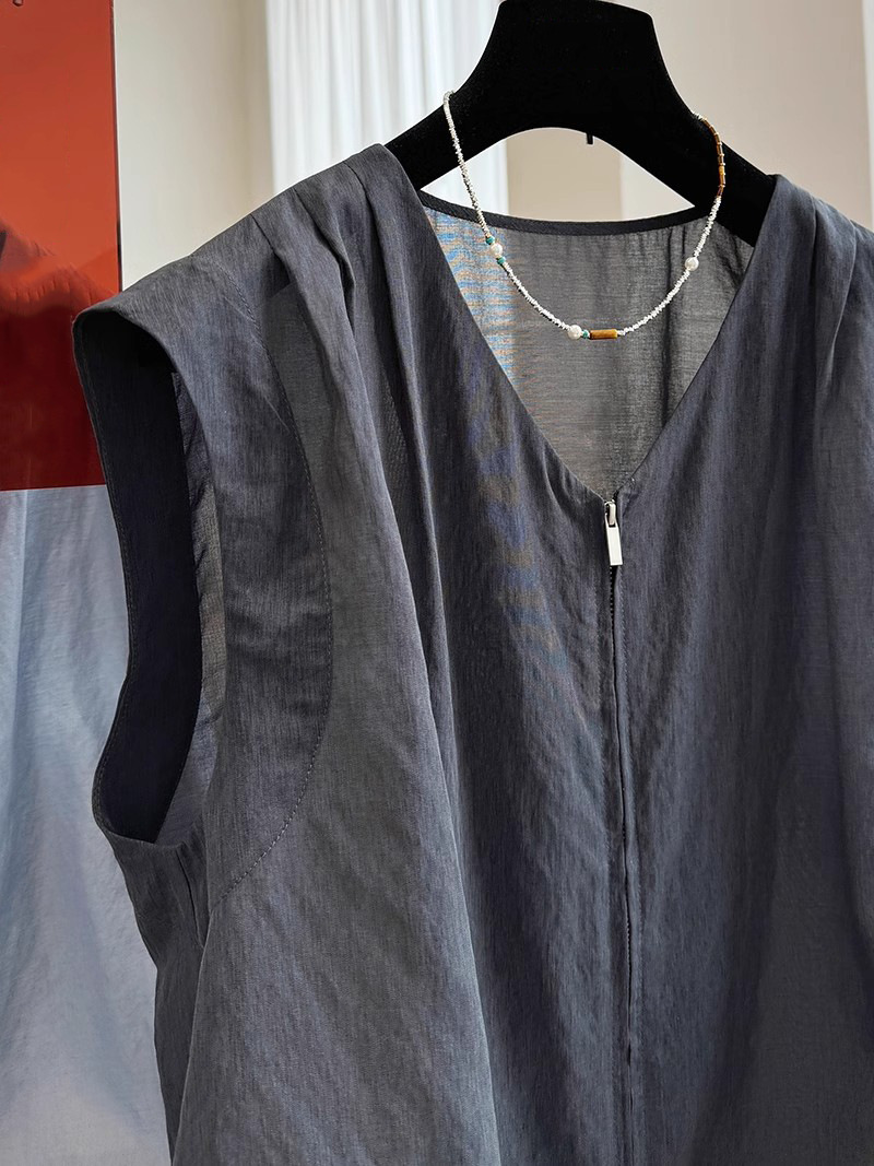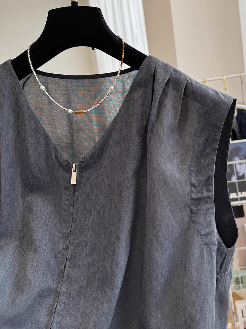디자인 센스 더블 지퍼 V 넥 민소매 셔츠 최고 여성 통통녀 플러스 사이즈 느슨한 캐주얼 틈새 셔츠 여름 패션스토어 가기