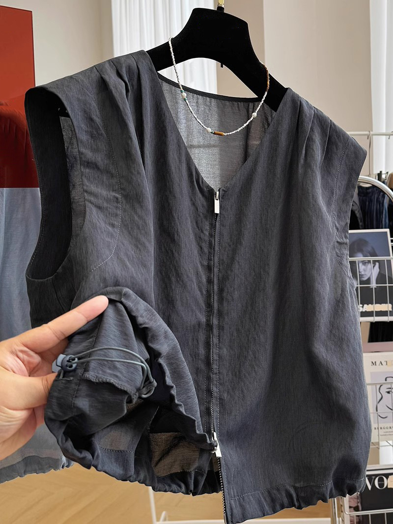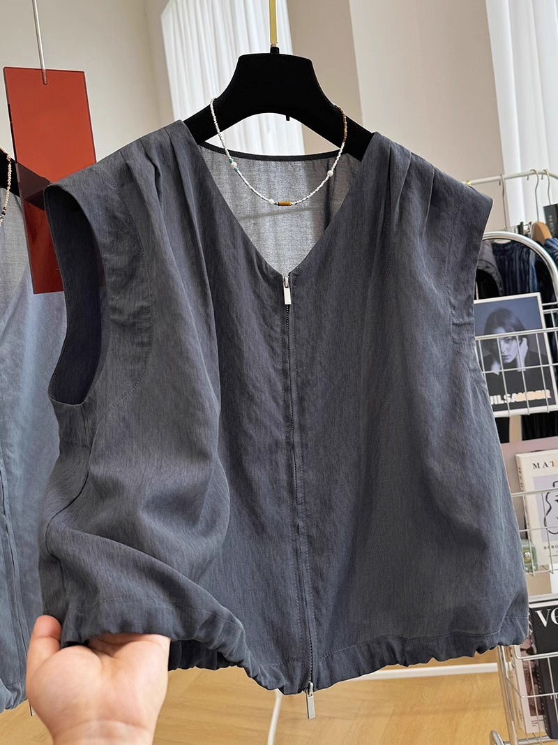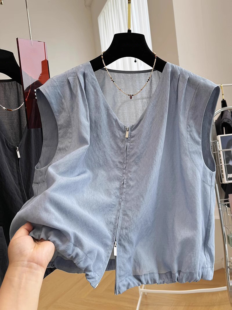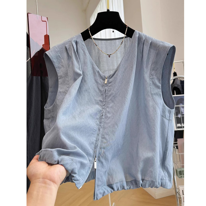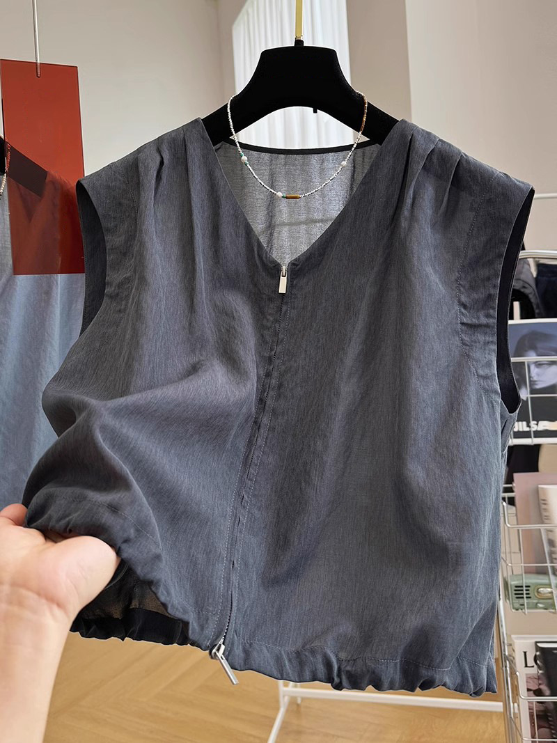 디자인 센스 더블 지퍼 V 넥 민소매 셔츠 최고 여성 통통녀 플러스 사이즈 느슨한 캐주얼 틈새 셔츠 여름 패션스토어 가기