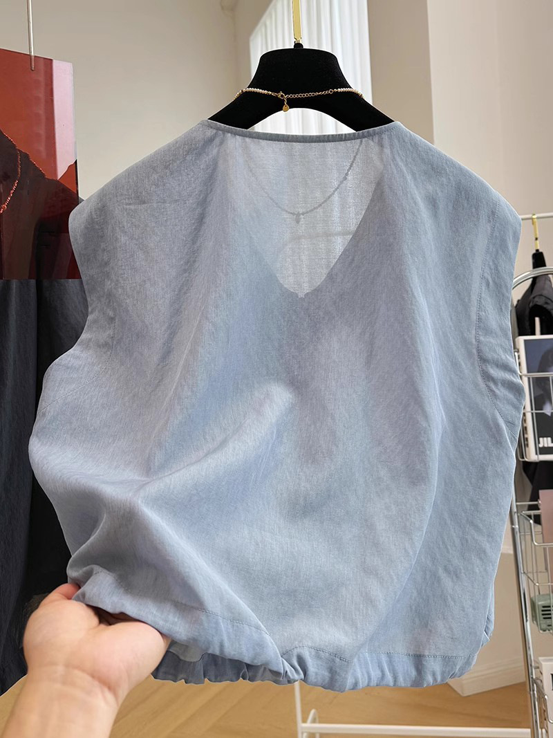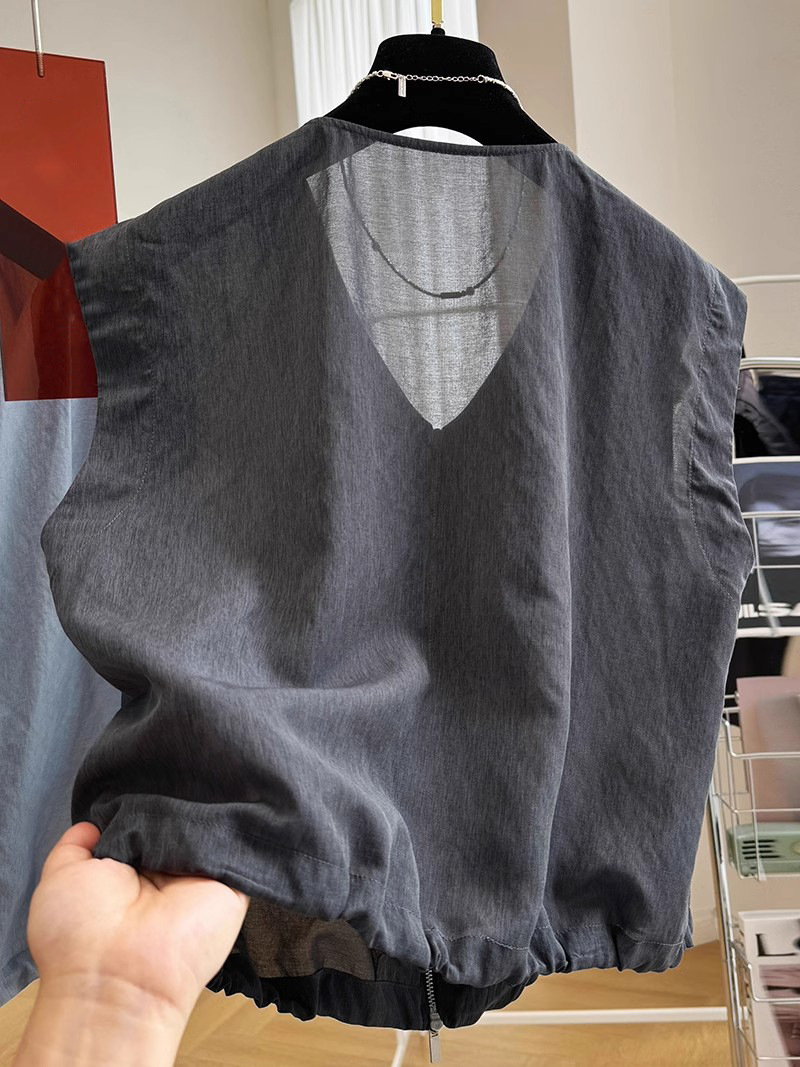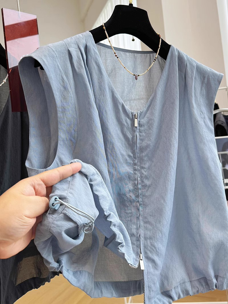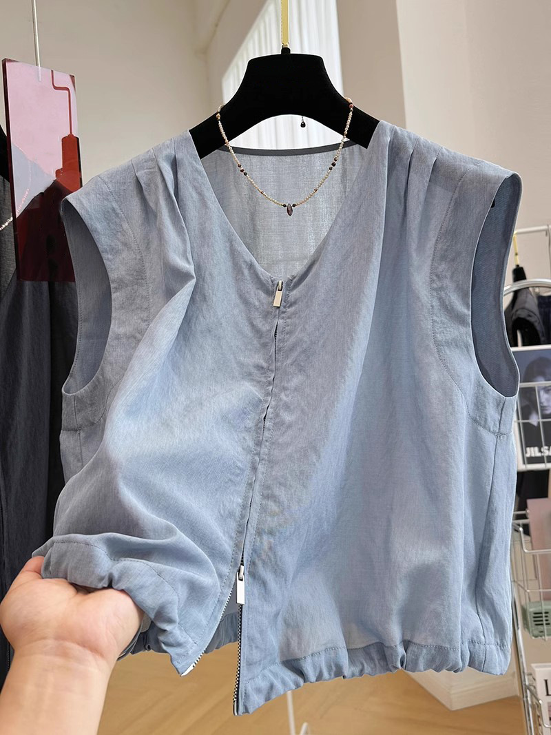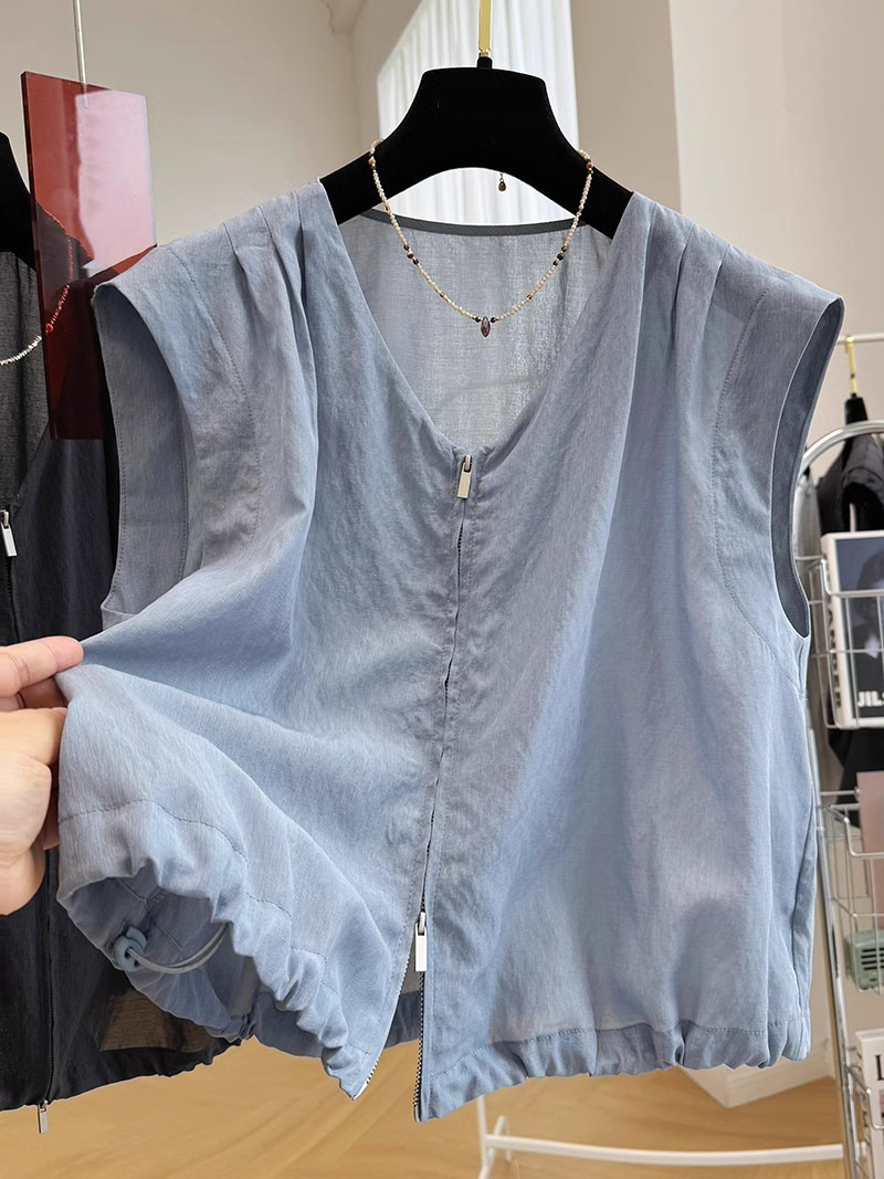 디자인 센스 더블 지퍼 V 넥 민소매 셔츠 최고 여성 통통녀 플러스 사이즈 느슨한 캐주얼 틈새 셔츠 여름 패션스토어 가기