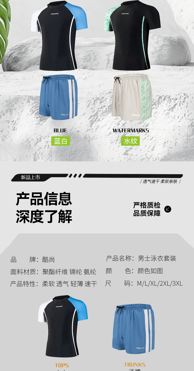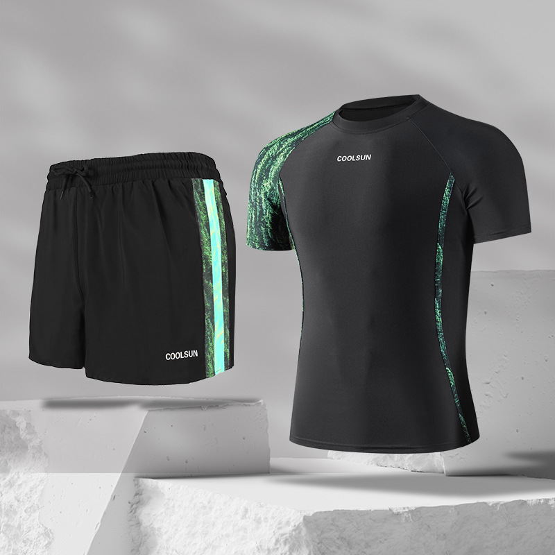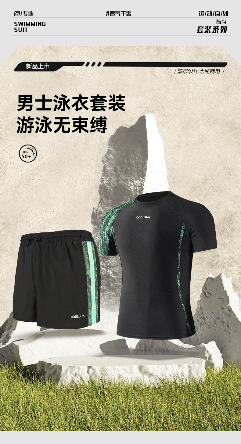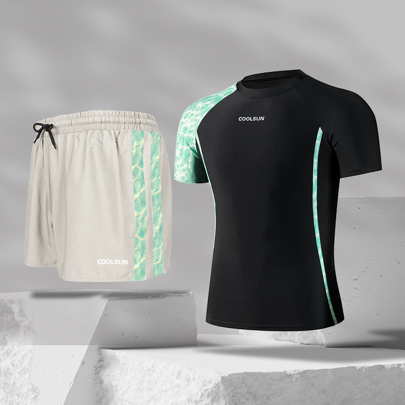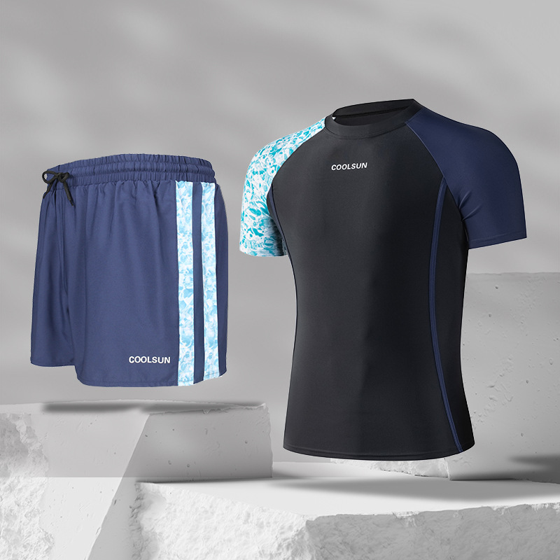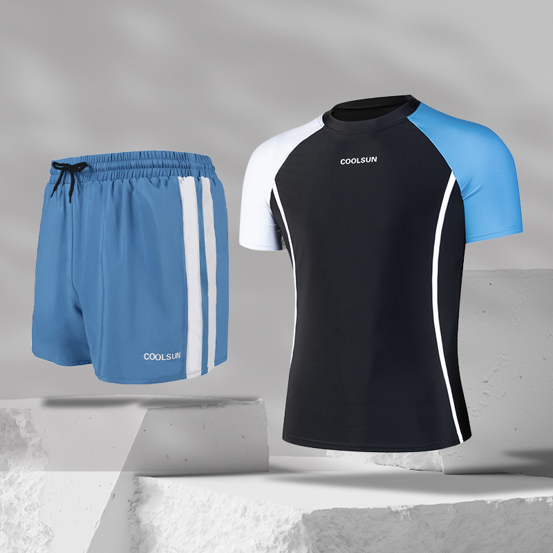 남성용 고급 수영복 및 수영복 투피스 세트, 대비되는 색상의 고탄성 더블 레이어 수영복, 당황스러운 방지 복서 스타일 온천 스포츠웨어스토어 가기