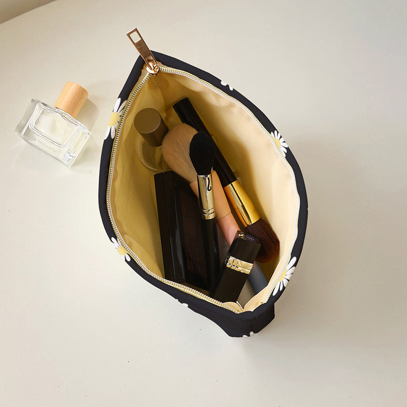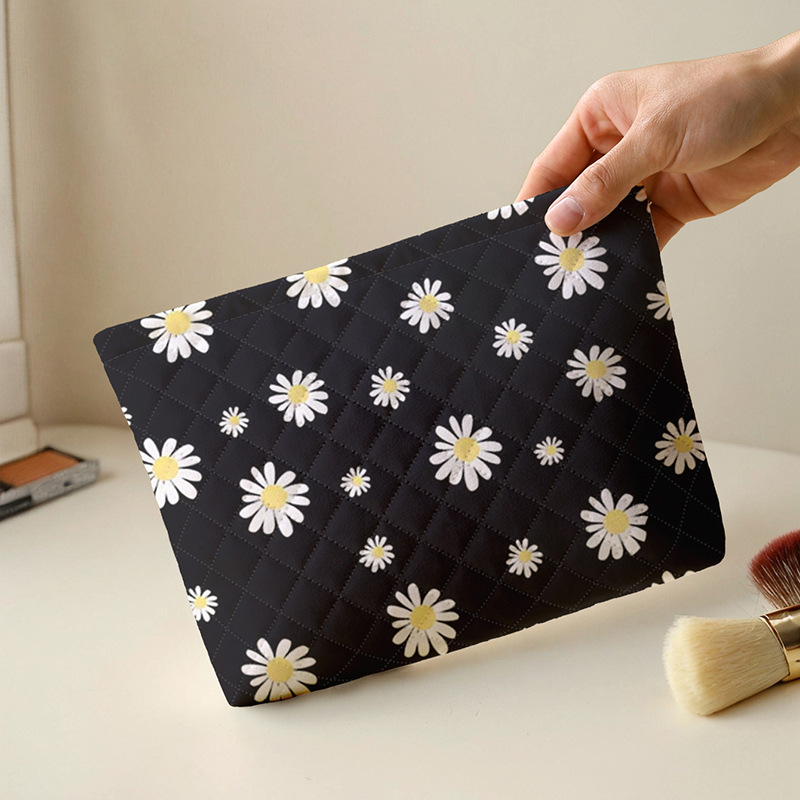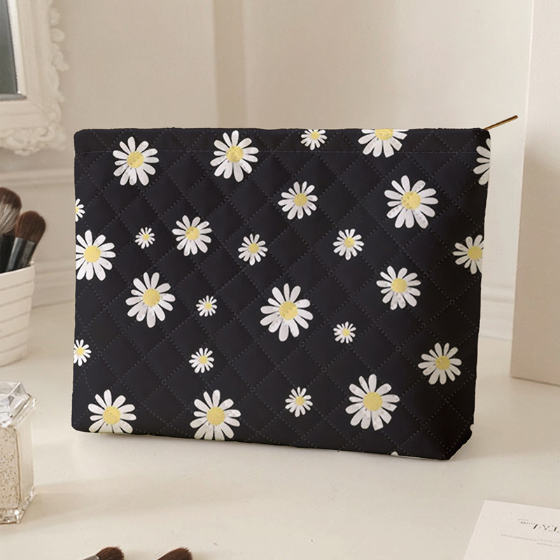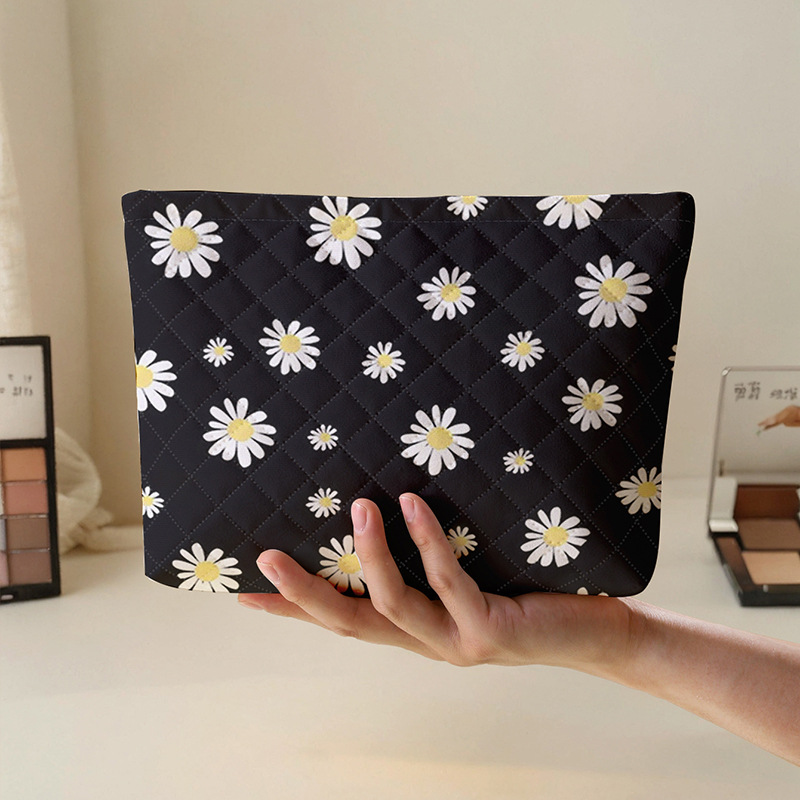 국경 간 새로운 스타일 간단하고 세련된 검은 배경 작은 데이지 마름모 화장품 가방 여행 가방 휴대용 대용량 저장 가방