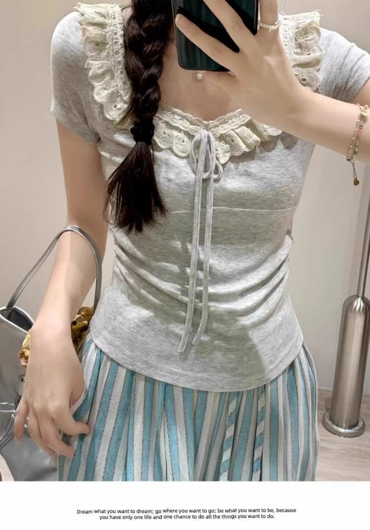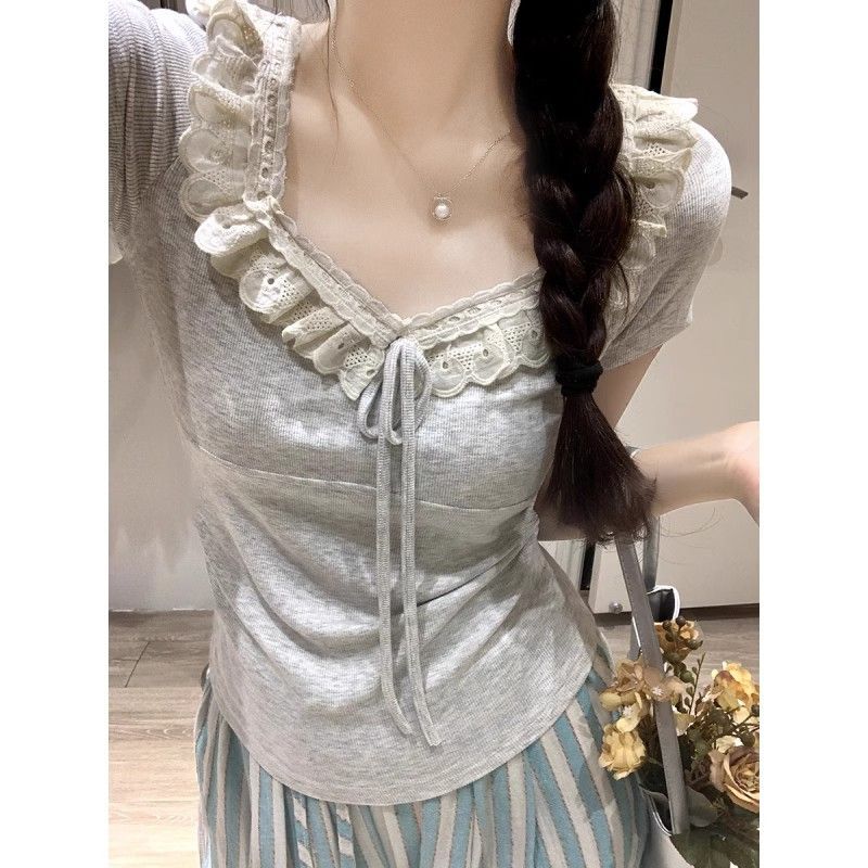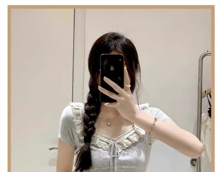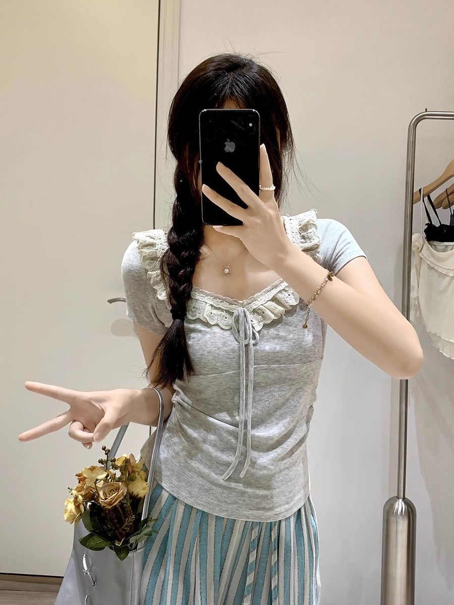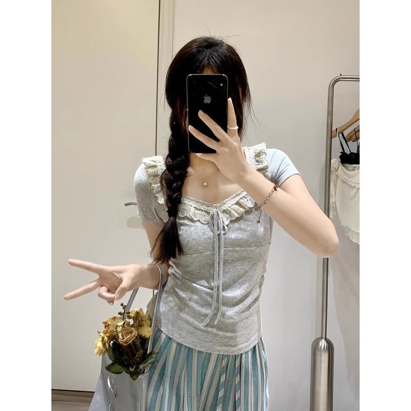 레이스 스티칭 레이스 반팔 티셔츠 여자 여름 2025 새로운 독특한 슈퍼 니스 플리츠 쇼트 탑스토어 가기